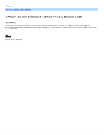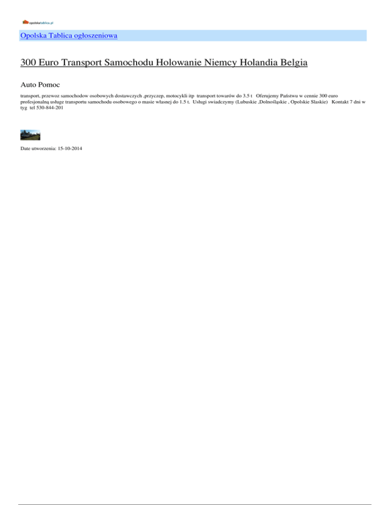 Opolska Tablica ogłoszeniowa 300 Euro Transport Samochodu Holowanie Niemcy Holandia Belgia Auto Pomoc transport, przewoz samochodow osobowych dostawczych ,przyczep, motocykli itp transport towarów do 3.5 t Oferujemy Państwu w cennie 300 euro profesjonalną usługe transportu samochodu osobowego o masie własnej do 1.5 t. Usługi swiadczymy (Lubuskie ,Dolnośląskie , Opolskie Slaskie) Kontakt 7 dni w tyg tel 530-844-201 Date utworzenia: 15-10-2014