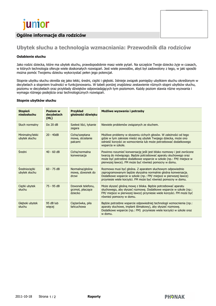 Ogólne informacje dla rodziców Ubytek słuchu a technologia wzmacniania: Przewodnik dla rodziców Osłabienie słuchu Jako rodzic dziecka, które ma ubytek słuchu, prawdopodobnie masz wiele pytań. Na szczęście Twoje dziecko żyje w czasach, w których technologia oferuje wiele doskonałych rozwiązań. Jest wiele powodów, abyś był zadowolony z tego, w jaki sposób można pomóc Twojemu dziecku wykorzystać pełen jego potencjał. Stopnie ubytku słuchu określa się jako lekki, średni, ciężki i głęboki. Istnieje związek pomiędzy ubytkiem słuchu określonym w decybelach a stopniem trudności w funkcjonowaniu. W tabeli poniżej znajdziesz zestawienie różnych stopni ubytków słuchu, poziomu w decybelach oraz przykłady dźwięków odpowiadających tym poziomom. Każdy poziom stawia różne wyzwania i wymaga różnego podejścia oraz technologicznych rozwiązań. Stopnie ubytków słuchu Stopień niedosłuchu Poziom w decybelach (HL) Przykład głośności dźwięku Możliwe wyzwania i potrzeby Słuch normalny Do 20 dB Szelest liści, tykanie zegara Niewiele problemów związanych ze słuchem. Minimalny/lekki ubytek słuchu 20 - 40dB Cicha/szeptana mowa, strzelanie palcami Możliwe problemy w słyszeniu cichych głosów. W zależności od tego gdzie w tym zakresie mieści się ubytek Twojego dziecka, może ono odnieść korzyści ze wzmocnienia lub może potrzebować dodatkowego wsparcia w szkole. Średni 40 - 60 dB Cicha/normalna konwersacja Powinno rozumieć konwersację jeśli jest blisko rozmowy i jest zwrócone twarzą do mówiącego. Będzie potrzebować aparatu słuchowego oraz może być potrzebne dodatkowe wsparcie w szkole (np.: FM/ miejsce w pierwszej ławce). FM może być również pomocny w domu. Średniociężki ubytek słuchu 60 - 75 dB Normalna/głośna mowa, dzwonek do drzwi Rozmowa musi być głośna. Z aparatem słuchowym odpowiednio zaprogramowanym będzie słyszalna normalnie głośna konwersacja. Dodatkowe wsparcie w szkole (np.: FM/ miejsce w pierwszej ławce) przyniesie wiele korzyści. FM może być również pomocny w domu. Ciężki ubytek słuchu 75 - 95 dB Dzwonek telefonu, grzmot, płaczące dziecko Może słyszeć głośną mowę z bliska. Będzie potrzebować aparatu słuchowego, aby słyszeć rozmowę. Dodatkowe wsparcie w szkole (np.: FM/ miejsce w pierwszej ławce) przyniesie wiele korzyści. FM może być również pomocny w domu. Głęboki ubytek słuchu 95 dB lub więcej Ciężarówka, piła łańcuchowa Będzie potrzebne wsparcie odpowiedniej technologii wzmocnienia (np.: aparaty słuchowe, implant ślimakowy), aby słyszeć rozmowę. Dodatkowe wsparcie (np.: FM) przyniesie wiele korzyści w szkole oraz w domu. 2011-10-18 Strona 1 / 2 Raporty Ogólne informacje dla rodziców Wybór najbardziej odpowiedniej technologii Dzisiaj, praktycznie nie ma niedosłuchu, któremu nie można by zaradzić stosując właściwą technologię. W przypadku zdiagnozowania niedosłuchu w pierwszej kolejności dopasowuje się aparaty słuchowe. To jaki rodzaj aparatu wybierzesz zależy od wielu czynników: stopnia niedosłuchu Twojego dziecka, jego potrzeb oraz potrzeb rodziny, które również są ważne. Pamiętaj, że nie musisz sam dokonywać tego wyboru. Możliwości aparatów słuchowych bardzo się rozwinęły w ostatnich latach. Aparaty oferują szeroki zakres rozwiązań technologicznych zaprojektowanych, aby sprostać specyficznym potrzebom słuchowym Twojego dziecka. Małym dzieciom zazwyczaj dopasowuje się aparaty zauszne (BTE), małych kompaktowych rozmiarów, w pełnej palecie jasnych i wesołych kolorów. Aparaty te stosuje się do szerokiego zakresu ubytków słuchu. 1. Wejście mikrofonu z osłoną przed wiatrem i pogodą 2. Przełącznik programów (TacTronic) – może być niedostępny dla młodszych dzieci 3. Zakryte gniazdo programowania 4. Regulator głośności (może być niedostępny dla młodszych dzieci) 5. Komora baterii z funkcją włącz/wyłącz (młodsze dzieci mogą mieć zablokowany dostęp do baterii) 6. Rożek/wyjście dźwięku 7. Indywidualna wkładka 8. Osłona przed wiatrem i pogodą na komorze baterii Starszym dzieciom można dopasować wewnątrzuszne aparaty słuchowe (ITE), które są wykonywane indywidualnie do kształtu ucha dziecka. Aparaty te stosuje się do ubytków od lekkiego do średniego. Wewnątrzuszny/wewnątrzkanałowy aparat słuchowy 1. 2. 3. 4. 5. 6. 7. Osłonięte mikrofony (dwa w modelach z kierunkową technologią) Komora baterii z funkcją włącz/wyłącz Przełącznik programów (opcjonalnie) Regulator głośności (opcjonalnie) Słuchawka (wyjście dźwięku) i filtr przeciwwoskowinowy Indywidualnie wykonana obudowa Uchwyt do wyjmowania (Exélia CIC/MC Petite) Systemy FM Właściwie ustawione do potrzeb Twojego dziecka aparaty słuchowe nie zawsze gwarantują dobre słyszenie w każdej sytuacji. Hałas lub akustyka pomieszczenia mogą znacząco wpłynąć na słyszenie. W klasie szkolnej, gdzie dzieci często mówią jednocześnie, osoba z ubytkiem słuchu może nie być w stanie wyodrębnić interesujących ją dźwięków z hałasu otoczenia. Odległość może również dramatycznie zmniejszyć zrozumienie, podobnie jak pogłos czy echo. Najlepszym sposobem, aby pokonać te problemy jest użycie bezprzewodowego systemu FM, który został zaprojektowany specjalnie po to, aby wychwycić mowę bezpośrednio u źródła i przesłać ją wyraźną i bez zniekształceń wprost do ucha dziecka. System FM to podstawowe rozwiązanie, aby zapewnić optymalne zrozumienie mowy niezależnie od warunków akustycznych otoczenia. Implanty ślimakowe Implant ślimakowy jest chirurgicznie umieszczaną protezą, która omija uszkodzone części ucha wewnętrznego. Jest to odpowiednie rozwiązanie dla dzieci, u których zdiagnozowano obuuszny ubytek słuchu na poziomie od ciężkiego do głębokiego, które nie odnoszą żadnych (lub niewiele) korzyści z aparatów słuchowych. Implanty ślimakowe mogą r