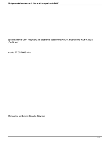 Motyw matki w utworach literackich- spotkanie DKK Sprawozdanie GBP Przywory ze spotkania uczestników DDK. Dyskusyjny Klub Książki „Orchidea” w dniu 27.05.2008 roku Moderator spotkania: Monika Silarska 1/3 Motyw matki w utworach literackich- spotkanie DKK Liczba uczestników: 12 osób Temat spotkania: Motyw matki w utworach literackich Przebieg spotkania: 1.Rola matki w dzisiejszym pokoleniu. 2.Ciepło domu rodzinnego. 3.Dom pokoleniowy czy nowoczesny? 4.Wzorce matek w moim otoczeniu. Motyw matki jest bardzo częstym tematem w utworach literackich. Ukazanie piękna matczynej miłości ,nierzadko związanego z cierpieniem dzieci często przewija się na kartkach wielu powieści. 2/3 Motyw matki w utworach literackich- spotkanie DKK Dla matki ważne jest dobro dziecka, szczęście i bezpieczeństwo, poprzez wychowanie kształtuje osobowość i charakter swojego dziecka. Omawiane utwory: Terakowska-„Poczwarka”, M.Szwaja-„Romans na receptę” D.Steel -„Album rodzinny”, Motto: Jest jedna miłość, która nie liczy na wzajemność, nie szczędzi ofiar, płacze a przebacza, odepchnięta wraca-to miłość macierzyńska. (Ignacy Kraszewski) 3/3