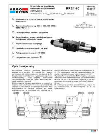 Rozdzielacze suwakowe sterowane bezpośrednio elektrycznie RPE4-10 Zastępuje 4039 10/2008 Wielkość nom. 10 · pmax do 350 bar · Qmax do 140 L/min q Rozdzielacze 4/3, 4/2 sterowane bezpośrednio elektrycznie q Wymiary instalacyjne wg DIN 24 340 / ISO 4401 / CETOP RP121-H q Czujnik położenia suwaka - opcjonalnie q Czterotłoczkowy sywak - redukuje zależność funkcjonalną od lepkości cieczy q Przycisk sterowania awaryjnego q Cewki elektromagnesów patrz HP 8007 q Płyty przyłączeniowe patrz HP 0002 q Certyfikat CSA na zapytanie HP 4039 07/2012 Opis funkcjonalny Rozdzielacze RPE4-10 sterowane bezpośrednio składają się z korpusu (1), suwaka (5), sprężyn centrujących (4) i elektromagnesów sterujących (2, 3). Rozdzielacze trójpołożeniowe wyposażone są w dwa elektromagnesy i dwie sprężyny. Rozdzielacze dwupołożeniowe posiadają jeden elektromagnes i jedną sprężynę powrotną. Elektromagnesy sterujące są dostępne w wersjach na napięcie stałe lub zmienne. Cewki na napięcie stałe DC zasilane są przez wtyczki (6, 7) bez prostowników. Przy rozwiązaniach na napięcie zmienne AC cewki wyposażone są w prostowniki lub zasilane są za pomocą wtyczek ze zintegrowanymi prostownikami (6, 7). Po poluzowaniu nakrętki zabezpieczającej (8), cewka może być obracana wokół własnej osi o 90°. W przypadku niesprawności elektromagnesu lub awarii zasilania suwak rozdzielacza może być przesterowany ręcznie, za pomocą sterowania awaryjnego (9) pod warunkiem że ciśnienie w przyłączu T nie przekracza 25 bar. W podstawowej obróbce powierzchniowej korpus (1) jest fosforanowany, a elektromagnesy (2, 3) są cynkowane (1). A B a b A B 1 HP 4039 Kod zamówienia RPE4-10 / Rozdzialacz suwakowy sterowany bezpośrednio, elektrycznie KO2 Sygnalizacja położenia krańcowego suwaka bez oznaczenia bez czujnika S1 czujnik normalnie otwarty do 50bar S2 czujnik normalnie otwarty do 210bar S4 czujnik norm. zamknięty do 50bar Wielkość nominalna Liczba położeń roboczych suwaka dwie pozycje trzy pozycje 2 3 Uszczelnienia bez oznaczenia standard (NBR) V Viton (FPM) Functional symbols see the table functional symbols Napięcie znamionowe elektromagnesów (na zaciskach cewek) 12 V DC / 3.17 A 14 V DC / 2.98 A 24 V DC / 1.73 A 106 V DC / 0.38 A 205 V DC / 0.20 A 230 V AC / 0.20 A / 50 (60) Hz 120V AC / 60Hz* 01200 01400 02400 10600 20500 23050 12060 Cewki na napięcie zmienne AC odpowiadają typowi E5. Funkcja łagodnego przesterowania bez oznaczenia bez tłumienia T2 z duszą T3 z zaworem dławiącym bez oznaczenia N2 Sterowanie awaryjne standardowe z gumową osłoną Certyfikat CSA na zapytanie Typ cewki elektromagnesu E1 z przyłączem dla wtyczki, EN 175301-803 z przyłączem dla wtyczki EN 175301-803 i diodą gaszącą E2 z przyłączem typu AMP Junior Timer (2 piny męskie) E3 z przyłączem typu AMP Junior Timer i diodą gaszącą E4 zprostownikiem i przyłączem dla wtyczki EN 175301-803 E5 luźne przewody (dwa odizolowane kable) E8 luźne przewody (dwa odizolowane kable) z diodą gaszącą E9 Wtyczka elektryczna, EN 1745301-803 bez oznaczenia bez wtyczki K1 wtyczka bez prostownika K2 wtyczka bez prostownika, z LED i diodą gaszącą K3 wtyczka z prostownikiem K4 wtyczka z prostownikiem, z LED i diodą gaszącą K5 wtyczka bez prostownika Uwaga: Kod zamówienia nie obejmuje wtyczki do czujnika położenia krańcowego suwaka (patrz numer zamówieniowy na stronie 9) PREFEROWANE TYPY ZOSTAŁY OZNACZONE POGRUBIONĄ CZCIONKĄ W KODZIE ZAMÓWIENIA I SYMBOLACH FUNKCJI. TABELA PREFEROWANYCH TYPÓW ROZDZIELACZY ZNAJDUJE SIĘ NA STRONIE 10 2 HP 4039 Dane techniczne Wielkość nominalna mm Maksymalne netężenie przepływu 10 L/min patrz charakterystyki p-Q Maks. ciśnienie robocze w kanałach P, A, B bar 350 Maks. ciśnienie robocze w kanale T bar 210; 50 dla wersji S1, S4 i 210 dla wersji S2 Spadek ciśnienia bar patrz charakterystyki Dp-Q Ciecz hydrauliczna oleje hydrauliczne w klasach (HL, HLP) wg DIN 51524 Zakres temperatury cieczy (NBR / Viton) °C -30 ... +80 / -20 ... +80 Maksymalna temperatura otoczenia °C +50 Zakres lepkości 2 mm /s 20 ... 400 Maksymalny stopień zanieczyszczenia cieczy Maksymalne dopuszczalne zmiany napięcia Maksymalna częstotliwość przełączania klasa 21/18/15 wg ISO 4406 (1999) % AC: ±10 1/h 2 DC: ±10 15 000 Czas przełączania, WŁ.; dla n = 32 mm /s ms AC: 50 ... 330 DC: 50 ...120 2 ms AC: 100 ... 300 DC: 30 ... 90 Czas przełączania, WYŁ.; dla n = 32 mm /s Możliwe obciążenie przełączeniami % Trwałość użytkowa 100 7 cykle 10 Klasa ochrony według EN 60529 IP 65 Waga - rozdzielacz z jednym elektromagnesem - rozdzielacz z dwomaelektromagnesami 3.9 5.4 kg Pozycja pracy dowolna Symbole funkcji Kod Symbol Położenia pośrednie Kod Symbol Położenia pośrednie Z11 C11 Y51 H11 C51 Y11 Z51 R11 R21 3 HP 4039 Charakterystyki p-Q 2 Wyznaczone dla lepkości cieczy hydraulicznej n = 32 mm /s Ciśnienie robocze p [bar] Ciśnienie robocze p [bar] Parametry graniczne pracy rozdzielacza dla danych symboli funkcji. Charakterystyki parametrów granicznych dla danego symbolu funkcji pozostają identyczne dla symetrycznych przepływów (np. natężenia przepływu między P-A i B-T są identyczne). W przypadku przepływu niesymetrycznego (np. natężenia przepływu między P-A i przy odciętym przyłączu B) dopuszczalne parametry graniczne mogą być znacznie mniejsze. W takich przypadkach zaleca się kontakt z działem technicznym. Natężenie przepływu Q [L/min] Natężenie przepływu Q [L/min] Z11 Z51 H11 H51 P11 P51 Y11 Y51 C11 C51 R11 X11 B11 B51 L21 R21 J15 J75 A51 C21 1 1 1 1 1 1 5 5 3 3 2 2 4 4 7 2 6 6 8 9 Charakterystyki Dp-Q 2 Wyznaczone dla lepkości cieczy hydraulicznej n = 32 mm /s Spadek ciśnienia Dp w zależności od natężenia przepływu. Z11 P-A P-B A-T B-T 1 1 2 2 1 2 1 2 1 2 1 2 1 2 1 2 1 2 3 4 Z51 H11 1 H51 P11 1 P51 Y11 1 Spadek ciśnienia Dp [bar] Y51 4 C51 4 1 1 2 2 5 1 5 1 R11 1 1 2 2 X11 1 1 2 2 B11 1 1 2 2 1 2 B51 Natę