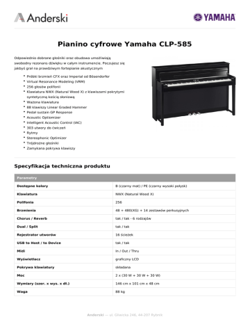 Pianino cyfrowe Yamaha CLP-585 Odpowiednio dobrane głośniki oraz obudowa umożliwiają swobodny rezonans dźwięku w całym instrumencie. Poczujesz się jakbyś grał na prawdziwym fortepianie akustycznym Próbki brzmień CFX oraz Imperial od Bösendorfer Virtual Resonance Modeling (VRM) 256 głosów polifonii Klawiatura NWX (Natural Wood X) z klawiszami pokrytymi syntetyczną kością słoniową Ważona klawiatura 88 klawiszy Linear Graded Hammer Pedał sustain GP Response Acoustic Optiomizer Intelligent Acoustic Control (IAC) 303 utwory do ćwiczeń Rytmy Stereophonic Optimizer Trójdrożne głośniki Zamykana pokrywa klawiszy Specyfikacja techniczna produktu Parametry Dostępne kolory B (czarny mat) / PE (czarny wysoki połysk) Klawiatura NWX (Natural Wood X) Polifonia 256 Brzmienia 48 + 480(XG) + 14 zestawów perkusyjnych Chorus / Reverb tak / tak - 6 rodzajów Dual / Split tak / tak Rejestrator utworów 16 ścieżek USB to Host / to Device tak / tak Midi In / Out / Thru Wyświetlacz graficzny LCD Pokrywa klawiatury składana Moc 2 x (30 W + 30 W + 30 W) Wymiary (szer. x wys. x dł.) 146 cm x 101 cm x 48 cm Waga 88 kg Anderski — ul. Gliwicka 246, 44-207 Rybnik