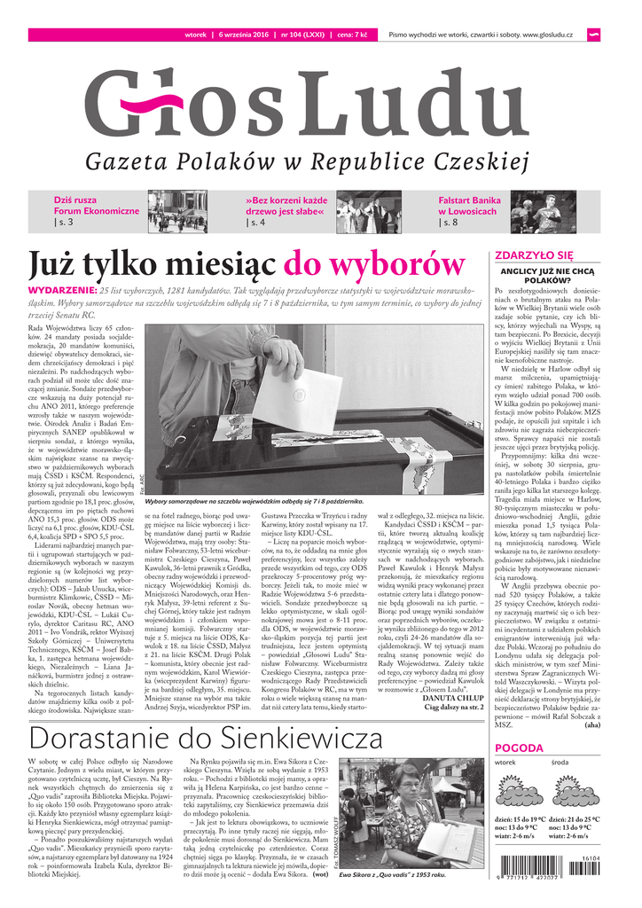 Pismo wychodzi we wtorki, czwartki i soboty. www.glosludu.cz wtorek | 6 września 2016 | nr 104 (LXXI) | cena: 7 kč Dziś rusza Forum Ekonomiczne | s. 3 »Bez korzeni każde drzewo jest słabe« | s. 4 Falstart Banika w Lowosicach | s. 8 Już tylko miesiąc do wyborów Rada Województwa liczy 65 członków. 24 mandaty posiada socjaldemokracja, 20 mandatów komuniści, dziewięć obywatelscy demokraci, siedem chrześcijańscy demokraci i pięć niezależni. Po nadchodzących wyborach podział sił może ulec dość znaczącej zmianie. Sondaże przedwyborcze wskazują na duży potencjał ruchu ANO 2011, którego preferencje wzrosły także w naszym województwie. Ośrodek Analiz i Badań Empirycznych SANEP opublikował w sierpniu sondaż, z którego wynika, że w województwie morawsko-śląskim największe szanse na zwycięstwo w październikowych wyborach mają ČSSD i KSČM. Respondenci, którzy są już zdecydowani, kogo będą głosowali, przyznali obu lewicowym partiom zgodnie po 18,1 proc. głosów, depczącemu im po piętach ruchowi ANO 15,3 proc. głosów. ODS może liczyć na 6,1 proc. głosów, KDU-ČSL 6,4, koalicja SPD + SPO 5,5 proc. Liderami najbardziej znanych partii i ugrupowań startujących w październikowych wyborach w naszym regionie są (w kolejności wg przydzielonych numerów list wyborczych): ODS – Jakub Unucka, wiceburmistrz Klimkowic, ČSSD – Miroslav Novák, obecny hetman wojewódzki, KDU-ČSL – Lukáš Curylo, dyrektor Caritasu RC, ANO 2011 – Ivo Vondrák, rektor Wyższej Szkoły Górniczej – Uniwersytetu Technicznego, KSČM – Josef Babka, 1. zastępca hetmana wojewódzkiego, Niezależnych – Liana Janáčková, burmistrz jednej z ostrawskich dzielnic. Na tegorocznych listach kandydatów znajdziemy kilka osób z polskiego środowiska. Największe szan- Fot. ARC WYDARZENIE: 25 list wyborczych, 1281 kandydatów. Tak wyglądają przedwyborcze statystyki w województwie morawskośląskim. Wybory samorządowe na szczeblu wojewódzkim odbędą się 7 i 8 października, w tym samym terminie, co wybory do jednej trzeciej Senatu RC. Wybory samorządowe na szczeblu wojewódzkim odbędą się 7 i 8 października. se na fotel radnego, biorąc pod uwagę miejsce na liście wyborczej i liczbę mandatów danej partii w Radzie Województwa, mają trzy osoby: Stanisław Folwarczny, 53-letni wiceburmistrz Czeskiego Cieszyna, Paweł Kawulok, 36-letni prawnik z Gródka, obecny radny wojewódzki i przewodniczący Wojewódzkiej Komisji ds. Mniejszości Narodowych, oraz Henryk Małysz, 39-letni referent z Suchej Górnej, który także jest radnym wojewódzkim i członkiem wspomnianej komisji. Folwarczny startuje z 5. miejsca na liście ODS, Kawulok z 18. na liście ČSSD, Małysz z 21. na liście KSČM. Drugi Polak – komunista, który obecnie jest radnym wojewódzkim, Karol Wiewiórka (wiceprezydent Karwiny) figuruje na bardziej odległym, 35. miejscu. Mniejsze szanse na wybór ma także Andrzej Szyja, wicedyrektor PSP im. Gustawa Przeczka w Trzyńcu i radny Karwiny, który został wpisany na 17. miejsce listy KDU-ČSL. – Liczę na poparcie moich wyborców, na to, że oddadzą na mnie głos preferencyjny, lecz wszystko zależy przede wszystkim od tego, czy ODS przekroczy 5-procentowy próg wyborczy. Jeżeli tak, to może mieć w Radzie Województwa 5-6 przedstawicieli. Sondaże przedwyborcze są lekko optymistyczne, w skali ogólnokrajowej mowa jest o 8-11 proc. dla ODS, w województwie morawsko-śląskim pozycja tej partii jest trudniejsza, lecz jestem optymistą – powiedział „Głosowi Ludu” Stanisław Folwarczny. Wiceburmistrz Czeskiego Cieszyna, zastępca przewodniczącego Rady Przedstawicieli Kongresu Polaków w RC, ma w tym roku o wiele większą szansę na mandat niż cztery lata temu, kiedy starto- wał z odległego, 32. miejsca na liście. Kandydaci ČSSD i KSČM – partii, które tworzą aktualną koalicję rządzącą w województwie, optymistycznie wyrażają się o swych szansach w nadchodzących wyborach. Paweł Kawulok i Henryk Małysz przekonują, że mieszkańcy regionu widzą wyniki pracy wykonanej przez ostatnie cztery lata i dlatego ponownie będą głosowali na ich partie. – Biorąc pod uwagę wyniki sondażów oraz poprzednich wyborów, oczekuję wyniku zbliżonego do tego w 2012 roku, czyli 24-26 mandatów dla socjaldemokracji. W tej sytuacji mam realną szansę ponownie wejść do Rady Województwa. Zależy także od tego, czy wyborcy dadzą mi głosy preferencyjne – powiedział Kawulok w rozmowie z „Głosem Ludu”. DANUTA CHLUP Ciąg dalszy na str. 2 Dorastanie do Sienkiewicza Na Rynku pojawiła się m.in. Ewa Sikora z Czeskiego Cieszyna. Wzięła ze sobą wydanie z 1953 roku. – Pochodzi z biblioteki mojej mamy, a oprawiła ją Helena Karpińska, co jest bardzo cenne – przyznała. Pracownicę czeskocieszyńskiej biblioteki zapytaliśmy, czy Sienkiewicz przemawia dziś do młodego pokolenia. – Jak jest to lektura obowiązkowa, to uczniowie przeczytają. Po inne tytuły raczej nie sięgają, młode pokolenie musi dorosnąć do Sienkiewicza. Mam taką jedną czytelniczkę po czterdziestce. Coraz chętniej sięga po klasykę. Przyznała, że w czasach gimnazjalnych ta lektura niewiele jej mówiła, dopiero dziś może ją ocenić – dodała Ewa Sikora. (wot) ANGLICY JUŻ NIE CHCĄ POLAKÓW? Po zeszłotygodniowych doniesieniach o brutalnym ataku na Polaków w Wielkiej Brytanii wiele osób zadaje sobie pytanie, czy ich bliscy, którzy wyjechali na Wyspy, są tam bezpieczni. Po Brexicie, decyzji o wyjściu Wielkiej Brytanii z Unii Europejskiej nasiliły się tam znacznie ksenofobiczne nastroje. W niedzielę w Harlow odbył się marsz milczenia, upamiętniający śmierć zabitego Polaka, w którym wzięło udział ponad 700 osób. W kilka godzin po pokojowej manifestacji znów pobito Polaków. MZS podaje, że opuścili już szpitale i ich zdrowiu nie zagraża niebezpieczeństwo. Sprawcy napaści nie zostali jeszcze ujęci przez