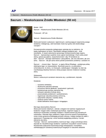 AP Utworzono : 06 marzec 2017 > Sacrum – Nieskończone Źródło Młodości (50 ml) Sacrum – Nieskończone Źródło Młodości (50 ml) Model : SAC Sacrum – Nieskończone Źródło Młodości (50 ml) Producent : AP Ltd. Sacrum - Nieskończone Źródło Młodości Skóra jest tworem cudownym, tajemniczym, zachwycającym ergonomią swego działania i inteligencją. Jaki kosmetyk może być godny tak doskonałego narządu? Konwencjonalne preparaty pielęgnujące opierają się na założeniu, że będą mądrzejsze od skóry. Rezultatem takiego podejścia jest... brak rezultatów. A nawet zaburzenia sprawnego funkcjonowania tego organu. Sacrum�reprezentuje zupełnie nowe ujęcie kosmetologii. Chyli czoła przed skórą, opiewa jej piękno, wszechstronność i siłę. W kontakcie ze skór�Sacrum�doznaje natchnienia i uskrzydlenia. Jak ona naturalne, jak ona silne,�Sacrum�tak jak sama skóra potrafi przewidzieć problemy i zaradzić im. � Sacrum�- niczym idea�Sacrum�w ujęciu Mircei Eliadego - podejmuje próbę dotknięcia tego, co niewyrażalne. Wychodzi poza to, co policzalne i schematyczne, ku temu, co intuicyjne, zaskakujące i niepojęte, by stać się manifestacją Idealnej Harmonii, której przejaw stanowi misterium ludzkiej skóry. Wskazania: Skóra z widocznymi oznakami starzenia się, z problemami, dojrzała. Działanie: � wyraźnie odmładza, � skutecznie pobudza odnowę, � przywraca skórze gładkość, sprężystość i jędrność, � powstrzymuje procesy starzenia się, � odnawia naturalne funkcje skóry, � przeciwdziała problemom i podrażnieniom, � regeneruje naturalną barierę ochronną, � optymalnie odżywia i nawilża skórę, � zwalcza wolne rodniki, � działa delikatnie złuszczająco i ściągająco. Dla kogo stworzyliśmy Sacrum Skóra jest tworem idealnym. Jednak z biegiem lat nadmiar negatywnych bodźców i bagaż wieku nadweręża jej funkcje, organizm żyjący w skażonym środowisku przestaje nadążać z dostarczaniem jej potrzebnych substratów. Wskutek tego osłabieniu ulega ochronna bariera hydrolipidowa, coraz mniej sprawnie przebiegają procesy odnowy, maleje energia do walki z agresorami. Pojawiają się i coraz bardziej pogłębiają problemy i oznaki starzenia się skóry. Tworząc�Sacrum, wykreowaliśmy rezerwuar tego, czego potrzebuje skóra dojrzała do niezakłóconego działania i spełniania wszystkich swoich funkcji. Nowatorskie połączenie biomimetycznego tetrapeptydu i kompleksu odmładzających substancji botanicznych bogatych w naturalne składniki kontakt : - [email protected] Strona 1 AP Utworzono : 06 marzec 2017 > Sacrum – Nieskończone Źródło Młodości (50 ml) Sacrum – Nieskończone Źródło Młodości (50 ml) aktywne stanowi przyrodnicze alter ego skóry, jednoczące się z nią w procesie odnowy. Następuje wygładzenie zmarszczek, skóra odzyskuje jędrność i sprężystość, naskórek zostaje wygładzony, a karnacja ujednolicona, znikają problemy i podrażnienia, system obronny przechodzi regenerację, mechanizmy przeciwstarzeniowe funkcjonują w sposób niezakłócony. Dlaczego Sacrum�daje rezultaty W�Sacrum�scaliliśmy w sposób idealny bogactwo świata przyrody z odkrywczą biotechnologią XXI wieku. Każdy ze składników roślinnych tworzących receptur�Sacrum�- olej z nasion dzikiej róży piżmowej, sok z bażyny czarnej, naturalny olejek sandałowy, masło karité, ekstrakt z opuncji figowej i macerat z kasztanów - stanowi sam w sobie naturalną skarbnicę substancji aktywnych. Z tych czerpanych wprost z przyrody składników zbudowaliśmy innowacyjny, synergiczny mechanizm biotechnologiczny, którego siłę oddziaływania wzmacnia biomimetyczny tetrapeptyd o silnych właściwościach odmładzających. Idealne naturalne proporcje składników czynnych i synergiczna interakcja składników botanicznych i peptydowych wyposażają Sacrum� �w inteligencję, uzdalniając je do odmładzającego dialogu ze skórą. Dlaczego skóra kocha Sacrum Sacrum to dla skóry wspólna wędrówka ku jej Powołaniu. Sacrum zawiera tylko to, co tę wędrówkę usprawnia, ułatwia, umożliwia i uprzyjemnia. Co usuwa kłody spod jej nóg i wysypuje drogę płatkami dzikich róż. Co inspiruje i koi wonią drzewa sandałowego. Co pobudza ją do naturalnego wysiłku i łagodnie przypomina o jej Zaszczytnej Roli. Sacrum tworzą cenne naturalne składniki roślinne współdziałające z naśladującym skórę tetrapeptydem. Kreują środowisko dla skóry idealne, przypominające jej własną budowę. Nie drażnią, lecz działają łagodząco, pomimo silnych walorów aktywnych. Pragnąc uniknąć syntetycznej „chemii”, w Sacrum zastosowaliśmy innowacyjne naturalne emulgatory i stabilizatory. Delikatny kolor i woń są zasługą naturalnych składników botanicznych. Najważniejsze składniki aktywne Tetrapeptyd młodości Nowatorski składnik biomimetyczny (naśladujący naturalne mechanizmy skóry), który pobudza syntezę substancji budujących warstwę podstawną naskórka - styk naskórka ze skórą właściwą - odpowiadającą za spoistość skóry i jej potrzeby metaboliczne. Przywraca skórze integralność strukturalną i funkcjonalną. Przy regularnym stosowaniu daje efekt zabiegu medycyny estetycznej, już po miesiącu następuje widoczne spłycenie zmarszczek. Wyraźnie odmładza skórę dojrzałą, przywracając jej gładkość, jędrność, wypoczęty wygląd. Przeciwstarzeniowy ekologiczny olej z nasion dzikiej róży piżmowej�Rosa moschata Zawarty w nim cenny kwas retinowy nie tylko współtworzy zewnętrzną barierę chroniącą skórę przed utratą wilgoci, ale i znacząco wpływa na zwiększenie zawartości prawidłowo zbudowanego kolagenu w skórze właściwej. Kwas trans retinowy w oleju z nasion róży jest najbardziej aktywną postacią witaminy A. W odróżnieniu od tretinoiny syntetycznej jest w pełni bezpieczny kontakt : - [email protected] Stron