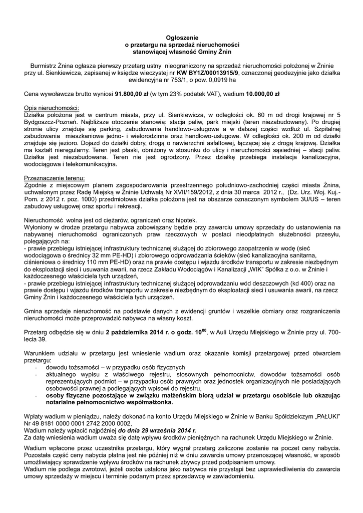 Ogłoszenie o przetargu na sprzedaż nieruchomości stanowiącej własność Gminy Żnin Burmistrz Żnina ogłasza pierwszy przetarg ustny nieograniczony na sprzedaż nieruchomości położonej w Żninie przy ul. Sienkiewicza, zapisanej w księdze wieczystej nr KW BY1Z/00013915/9, oznaczonej geodezyjnie jako działka ewidencyjna nr 753/1, o pow. 0,0919 ha Cena wywoławcza brutto wyniosi 91.800,00 zł (w tym 23% podatek VAT), wadium 10.000,00 zł Opis nieruchomości: Działka położona jest w centrum miasta, przy ul. Sienkiewicza, w odległości ok. 60 m od drogi krajowej nr 5 Bydgoszcz-Poznań. Najbliższe otoczenie stanowią: stacja paliw, park miejski (teren niezabudowany). Po drugiej stronie ulicy znajduje się parking, zabudowania handlowo-usługowe a w dalszej części wzdłuż ul. Szpitalnej zabudowania mieszkaniowe jedno- i wielorodzinne oraz handlowo-usługowe. W odległości ok. 200 m od działki znajduje się jezioro. Dojazd do działki dobry, drogą o nawierzchni asfaltowej, łączącej się z drogą krajową. Działka ma kształt nieregularny. Teren jest płaski, obniżony w stosunku do ulicy i nieruchomości sąsiedniej – stacji paliw. Działka jest niezabudowana. Teren nie jest ogrodzony. Przez działkę przebiega instalacja kanalizacyjna, wodociągowa i telekomunikacyjna. Przeznaczenie terenu: Zgodnie z miejscowym planem zagospodarowania przestrzennego południowo-zachodniej części miasta Żnina, uchwalonym przez Radę Miejską w Żninie Uchwałą Nr XVII/159/2012, z dnia 30 marca 2012 r., (Dz. Urz. Woj. Kuj.Pom. z 2012 r. poz. 1000) przedmiotowa działka położona jest na obszarze oznaczonym symbolem 3U/US – teren zabudowy usługowej oraz sportu i rekreacji. Nieruchomość wolna jest od ciężarów, ograniczeń oraz hipotek. Wyłoniony w drodze przetargu nabywca zobowiązany będzie przy zawarciu umowy sprzedaży do ustanowienia na nabywanej nieruchomości ograniczonych praw rzeczowych w postaci nieodpłatnych służebności przesyłu, polegających na: - prawie przebiegu istniejącej infrastruktury technicznej służącej do zbiorowego zaopatrzenia w wodę (sieć wodociągowa o średnicy 32 mm PE-HD) i zbiorowego odprowadzania ścieków (sieć kanalizacyjna sanitarna, ciśnieniowa o średnicy 110 mm PE-HD) oraz na prawie dostępu i wjazdu środków transportu w zakresie niezbędnym do eksploatacji sieci i usuwania awarii, na rzecz Zakładu Wodociągów i Kanalizacji „WIK” Spółka z o.o. w Żninie i każdoczesnego właściciela tych urządzeń, - prawie przebiegu istniejącej infrastruktury technicznej służącej odprowadzaniu wód deszczowych (kd 400) oraz na prawie dostępu i wjazdu środków transportu w zakresie niezbędnym do eksploatacji sieci i usuwania awarii, na rzecz Gminy Żnin i każdoczesnego właściciela tych urządzeń. Gmina sprzedaje nieruchomość na podstawie danych z ewidencji gruntów i wszelkie obmiary oraz rozgraniczenia nieruchomości może przeprowadzić nabywca na własny koszt. Przetarg odbędzie się w dniu 2 października 2014 r. o godz. 10 00, w Auli Urzędu Miejskiego w Żninie przy ul. 700lecia 39. Warunkiem udziału w przetargu jest wniesienie wadium oraz okazanie komisji przetargowej przed otwarciem przetargu: - dowodu tożsamości – w przypadku osób fizycznych - aktualnego wypisu z właściwego rejestru, stosownych pełnomocnictw, dowodów tożsamości osób reprezentujących podmiot – w przypadku osób prawnych oraz jednostek organizacyjnych nie posiadających osobowości prawnej a podlegających wpisowi do rejestru, - osoby fizyczne pozostające w związku małżeńskim biorą udział w przetargu osobiście lub okazując notarialne pełnomocnictwo współmałżonka. Wpłaty wadium w pieniądzu, należy dokonać na konto Urzędu Miejskiego w Żninie w Banku Spółdzielczym „PAŁUKI” Nr 49 8181 0000 0001 2742 2000 0002, Wadium należy wpłacić najpóźniej do dnia 29 września 2014 r. Za datę wniesienia wadium uważa się datę wpływu środków pieniężnych na rachunek Urzędu Miejskiego w Żninie. Wadium wpłacone przez uczestnika przetargu, który wygrał przetarg zaliczone zostanie na poczet ceny nabycia. Pozostała część ceny nabycia płatna jest nie później niż w dniu zawarcia umowy przenoszącej własność, w sposób umożliwiający sprawdzenie wpływu środków na rachunek zbywcy przed podpisaniem umowy. Wadium nie podlega zwrotowi, jeżeli osoba ustalona jako nabywca nie przystąpi bez usprawiedliwienia do zawarcia umowy sprzedaży w miejscu i terminie podanym przez sprzedawcę w zawiadomieniu. Koszty notarialne i sądowe ponosi nabywca nieruchomości. Wadium wniesione przez uczestników, którzy nie wygrali przetargu zostanie zwrócone w ciągu 3 dni od dnia zamknięcia przetargu. Zastrzega się prawo odwołania przetargu z ważnych powodów. Dodatkowe informacje można uzyskać w Urzędzie Miejskim w Żninie (pokój nr 35) lub tel. 52 303-13-01 w. 133 w godzinach pracy Urzędu.
