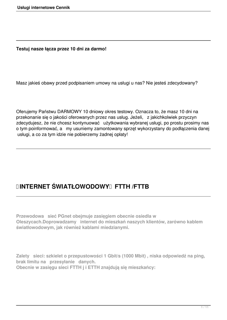Usługi internetowe Cennik Testuj nasze łącza przez 10 dni za darmo! Masz jakieś obawy przed podpisaniem umowy na usługi u nas? Nie jesteś zdecydowany? Oferujemy Państwu DARMOWY 10 dniowy okres testowy. Oznacza to, że masz 10 dni na przekonanie się o jakości oferowanych przez nas usług. Jeżeli, z jakichkolwiek przyczyn zdecydujesz, że nie chcesz kontynuować użytkowania wybranej usługi, po prostu prosimy nas o tym poinformować, a my usuniemy zamontowany sprzęt wykorzystany do podłączenia danej usługi, a co za tym idzie nie pobierzemy żadnej opłaty! INTERNET ŚWIATŁOWODOWY FTTH /FTTB Przewodowa sieć PGnet obejmuje zasięgiem obecnie osiedla w Oleszycach.Doprowadzamy internet do mieszkań naszych klientów, zarówno kablem światłowodowym, jak również kablami miedzianymi. Zalety sieci: szkielet o przepustowości 1 Gbit/s (1000 Mbit) , niska odpowiedź na ping, brak limitu na przesyłanie danych. Obecnie w zasięgu sieci FTTH j i ETTH znajdują się mieszkańcy: 1 / 11 Usługi internetowe Cennik -oś. Pod Kasztanami 1,2,3,4,5,7 -oś. Sapiehy 1,2,3,4,5,6,7,8 -ul.Zielona 1a,1b,1c,2c,2d,2e,4a ,5,7,9,11,13,15,17,23,25 -ul.Rynek -ul.Szkolna -ul.Jana III Sobieskiego -ul.Zamkowa Nazwa usługi (pobieranie/wysyłanie) Abonament Umowa miesięczny 24m-ce * Średnia miesięczna Umowa 12m-cy ** Średnia miesięczna Umowa bezterminowa Fresh FIBER Internet 15/2 Mbit/s 2 / 11 Usługi internetowe Cennik 25 PLN 19 PLN 25 PLN 19 PLN 35 PLN Fresh FIBER Internet 30/5 Mbit/s 30 PLN 23 PLN 30 PLN 23 PLN 40 PLN Fresh FIBER Internet 55/8 Mbit/s 40 PLN 30 PLN 40 PLN 30 PLN 50 PLN 3 / 11 Usługi internetowe Cennik Fresh FIBER Internet 75/10 Mbit/s 50 PLN 38 PLN 50 PLN 38 PLN 60 PLN Fresh FIBER Internet 150/20 Mbit/s 65 PLN 49 PLN 75 PLN 56,50 PLN 85 PLN * pierwsze 6 miesięcy za 1 zł + Router wifi ** 4 / 11 Usługi internetowe Cennik pierwsze 3 miesiące za 1zł + Router wifi INTERNET BEZPRZEWODOWY Nazwa usługi (pobieranie/wysyłanie) Abonament miesięczny Umowa 24m-ce* Umowa 12m-cy** Umowa bezterminowa Nowy Internet 4/1 Mbit/s 5 / 11 Usługi internetowe Cennik 25 PLN 25 PLN 35 PLN Nowy Internet 6/1,7 Mbit/s 35 PLN 35 PLN 45 PLN Nowy Internet 8/2 Mbit/s 40 PLN 40 PLN 50 PLN 6 / 11 Usługi internetowe Cennik Nowy Internet 10/4 Mbit/s *** 50 PLN 50 PLN 60 PLN * pierwsze 3 miesiące 1 zł ** pierwszy miesiąc 1 zł *** oferta ograniczona terytorialnie 7 / 11 Usługi internetowe Cennik INTERNET KABLOWY Oferta ta jest skierowana do klientów bloków gdzie nie docieramy jeszcze światłowodem: Bloki - ul.Szopena 28, ul.Leśna 24 w Lubaczowie Nazwa usługi (pobieranie/wysyłanie) Abonament miesięczny Umowa 24m-ce* Umowa 12m-cy** Umowa bezterminowa KABEL Internet 10/5 Mbit/s 8 / 11 Usługi internetowe Cennik 25 PLN 25 PLN 35 PLN KABEL Internet 20/7 Mbit/s 35 PLN 35 PLN 45 PLN KABEL Internet 40/7 Mbit/s 45 PLN 45 PLN 55 PLN 9 / 11 Usługi internetowe Cennik * pierwsze 3 miesiące 1 zł ** pierwszy miesiąc 1 zł TABELA OPŁAT INSTALACYJNYCH Nazwa usługi AKTYWACJA USŁUGI Instalacja usługi w technologii radiowej od 200 zł 10 / 11 Usługi internetowe Cennik Instalacja w technologii kablowej/światłowodowej 1 zł UWAGA!Wpłaty za internet prosimy kierować na konto: mBank 30 1140 2004 0000 3602 4748 5620 Cennik nie stanowi oferty handlowej wg art. 66 par. 1 Kodeksu Cywilnego i jest publikowany tylko w celach informacyjnych. Podane ceny mogą ulec zmianie. Zastrzegamy sobie prawo do zmian. Regulamin świadczenia uslugi: Regulamin dostępu do internetu 11 / 11