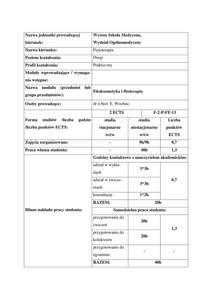 Nazwa jednostki prowadzącej Wyższa Szkoła Medyczna, kierunek: Wydział Ogólnomedyczny Nazwa kierunku: Fizjoterapia Poziom kształcenia: Drugi Profil kształcenia: Praktyczny Moduły wprowadzające / wymagania wstępne: Nazwa modułu (przedmiot lub grupa przedmiotów): Osoby prowadzące: Fitokosmetyka i fitoterapia dr n biol. E. Wochna 2 ECTS Forma studiów /liczba godzin F-2-P-FF-13 studia studia Liczba stacjonarne niestacjonarne punktów w/ćw w/ćw ECTS Zajęcia zorganizowane: - 9h/9h 0,7 Praca własna studenta: - 40h 1,3 /liczba punktów ECTS: Godziny kontaktowe z nauczycielem akademickim: udział w wykładach udział w ćwiczeniach 3*3h 1*2h konsultacje RAZEM: Bilans nakładu pracy studenta: 0,7 3*3h 20h Samodzielna praca studenta: przygotowanie do 20h ćwiczeń przygotowanie do kolokwiów przygotowanie do egzaminu RAZEM: 1,3 20h - 40h Cele modułu: Student nabędzie wiedzę na temat zastosowania roślin w fitoterapii i fitokosmetyce. Student zdobędzie wiedze na temat roślinnych związków biologicznie czynnych i ich wykorzystania w preparatach farmaceutycznych, w problemach skórnych oraz w pielęgnacji skóry. Student pozna podstawowe zasady sporządzania produktów terapeutycznych i kosmetycznych z surowców roślinnych. Efekty kształcenia: Odniesienie się Przedmiotowy Efekty kształcenia efekt kształcenia do kierunkowych efektów kształcenia P_W01 posiada wiedzę na temat roślin zielarskich i kosmetycz- K2_W31 nych, części roślin stanowiących surowiec wykorzystywanych w preparatach farmaceutycznych P_U01 rozpoznaje i charakteryzuje surowce roślinne wykorzy- K2_U10 stywane w farmacji P_U02 rozróżnia rośliny stosowane w lecznictwie i kosmetyce K2_U10 P_U03 sporządza podstawowe preparaty roślinne stosowane K2_U22 w pospolitych dolegliwościach skóry, interpretuje skład i przeznaczenie gotowych mieszanek ziołowych P_K01 wykazuje świadomość skutków ubocznych i oddziały- K2_K05 wania składników roślinnych z lekami ordynowanymi przez lekarza P_K02 wykazuje otwartość i uprzejmość w kontaktach mię- K2_K06 dzyludzkich, postępuje zgodnie z zasadami etyki zawodowej Wiedza – student: • posiada wiedzę na temat roślin zielarskich i kosmetycznych, części roślin stanowiących surowiec wykorzystywanych w preparatach farmaceutycznych. Umiejętności – student: • rozpoznaje i charakteryzuje surowce roślinne wykorzystywane w farmacji, • rozróżnia rośliny stosowane w lecznictwie i kosmetyce, • sporządza podstawowe preparaty roślinne stosowane w pospolitych dolegliwościach skóry, interpretuje skład i przeznaczenie gotowych mieszanek ziołowych. Kompetencje społeczne – student: • wykazuje świadomość skutków ubocznych i oddziaływania składników roślinnych z lekami ordynowanymi przez lekarza, • wykazuje otwartość i uprzejmość w kontaktach międzyludzkich, postępuje zgodnie z zasadami etyki zawodowej. Forma zajęć/metody dydaktyczne: Wykład informacyjny, multimedialny, ćwiczenia, praca w grupie Forma i warunki zaliczenia przedmiotu w odniesieniu do efektów kształcenia. Nr efektu Metody weryfikacji efektu kształcenia kształcenia Formujące: P_W01 Podsumowujące: Kolokwium pisemne ocena w systemie Zaliczenie pisemne – student generuje / punktowym rozpoznaje odpowiedź (esej, raport; krótkie strukturyzowane pytania /SSQ/; test wielokrotnego wyboru /MCQ/; test wielokrotnej odpowiedzi /MRQ/; test dopasowania; test T/N; test uzupełniania odpowiedzi) P_U01 Obserwacja pracy studenta P_U02 Ocena aktywności studenta w czasie P_U03 zajęć Realizacja zleconego zadania Projekt, prezentacja Obserwacja pracy na ćwiczeniach Zaliczenie poszczególnych czynności Próba pracy P_K01 Obserwacja pracy studenta Przedłużona obserwacja przez opieku- P_K02 Obserwacja pracy na ćwiczeniach na / nauczyciela prowadzącego Ocena wyciąganych wniosków z eks- Ocena 360° (opinie nauczycieli, koleperymentów gów/koleżanek, pacjentów, współpracowników) Samoocena (w tym portfolio) innych Treści programowe: Wykłady – 9 godzin 1. Ogólna charakterystyka substancji czynnych mających znaczenie w higienie, kosmetyce, terapii i dietetyce; bezpieczeństwo stosowania składników roślinnych – 2h 2. Znaczenie terapeutyczne, kosmetyczne i dietetyczne składników tłuszczowych, białkowych i węglowodanowych – 2h 3. Antyoksydanty, antybiotyki, składniki promieniochronne, barwniki roślinne, sole mineralne, substancje zapachowe – 2h 4. Rośliny w problemach kosmetycznych (trądzik, celulit, otyłość, cera naczynkowa, stany zapalne i podrażnienia skóry, pielęgnacja włosów i paznokci) – 2h 5. Rośliny w preparatach opóźniających oznaki starzenia się – do stosowania zewnętrznego i wewnętrznego (suplementy diety) – 1h Ćwiczenia – 9 godzin 1. Analiza anatomiczno-morfologiczna roślinnych surowców leczniczych i kosmetycznych. Nazewnictwo łacińskie i nomenklatura INCI – 3h 2. Sposoby sporządzania produktów i półproduktów z surowców roślinnych do celów kosmetycznych, terapeutycznych i dietetycznych - 3h 3. Analiza surowców olejkowych, garbnikowych, flawonoidowych, śluzowych i kumarynowych – 3h. Literatura podstawowa: 1. Kołodziejczyk A. Naturalne związki organiczne, PWN, Warszawa 2003; 2. Kohlmiinzer S. - Farmakognozja, PZWL, Warszawa 1998; Literatura uzupełniająca: 1. Wagner H., Bladt S. Plant Drug Analysis. A Thin Layer Chromatography Atlas. Sprinter Berlin-New York-Tokyo 2001. Program opracował/a, data opracowania programu