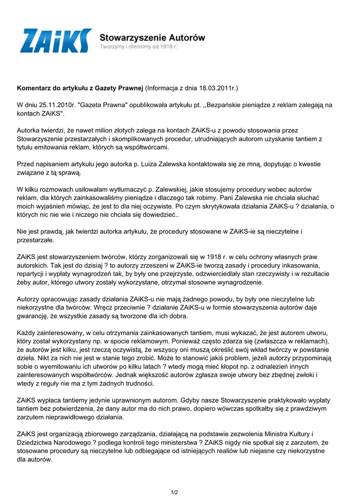 Komentarz do artykułu z Gazety Prawnej (Informacja z dnia 18.03.2011r.) W dniu 25.11.2010r. "Gazeta Prawna" opublikowała artykułu pt. ,,Bezpańskie pieniądze z reklam zalegają na kontach ZAiKS''. Autorka twierdzi, że nawet milion złotych zalega na kontach ZAiKS-u z powodu stosowania przez Stowarzyszenie przestarzałych i skomplikowanych procedur, utrudniających autorom uzyskanie tantiem z tytułu emitowania reklam, których są współtwórcami. Przed napisaniem artykułu jego autorka p. Luiza Zalewska kontaktowała się ze mną, dopytując o kwestie związane z tą sprawą. W kilku rozmowach usiłowałam wytłumaczyć p. Zalewskiej, jakie stosujemy procedury wobec autorów reklam, dla których zainkasowaliśmy pieniądze i dlaczego tak robimy. Pani Zalewska nie chciała słuchać moich wyjaśnień mówiąc, że jest to dla niej oczywiste. Po czym skrytykowała działania ZAiKS-u ? działania, o których nic nie wie i niczego nie chciała się dowiedzieć.. Nie jest prawdą, jak twierdzi autorka artykułu, że procedury stosowane w ZAiKS-ie są nieczytelne i przestarzałe. ZAiKS jest stowarzyszeniem twórców, którzy zorganizowali się w 1918 r. w celu ochrony własnych praw autorskich. Tak jest do dzisiaj ? to autorzy zrzeszeni w ZAiKS-ie tworzą zasady i procedury inkasowania, repartycji i wypłaty wynagrodzeń tak, by były one przejrzyste, odzwierciedlały stan rzeczywisty i w rezultacie żeby autor, którego utwory zostały wykorzystane, otrzymał stosowne wynagrodzenie. Autorzy opracowując zasady działania ZAiKS-u nie mają żadnego powodu, by były one nieczytelne lub niekorzystne dla twórców. Wręcz przeciwnie ? działanie ZAiKS-u w formie stowarzyszenia autorów daje gwarancję, że wszystkie zasady są tworzone dla ich dobra. Każdy zainteresowany, w celu otrzymania zainkasowanych tantiem, musi wykazać, że jest autorem utworu, który został wykorzystany np. w spocie reklamowym. Ponieważ często zdarza się (zwłaszcza w reklamach), że autorów jest kilku, jest rzeczą oczywistą, że wszyscy oni muszą określić swój wkład twórczy w powstanie dzieła. Nikt za nich nie jest w stanie tego zrobić. Może to stanowić jakiś problem, jeżeli autorzy przypominają sobie o wyemitowaniu ich utworów po kilku latach ? wtedy mogą mieć kłopot np. z odnalezień innych zainteresowanych współtwórców. Jednak większość autorów zgłasza swoje utwory bez zbędnej zwłoki i wtedy z reguły nie ma z tym żadnych trudności. ZAiKS wypłaca tantiemy jedynie uprawnionym autorom. Gdyby nasze Stowarzyszenie praktykowało wypłaty tantiem bez potwierdzenia, że dany autor ma do nich prawo, dopiero wówczas spotkałby się z prawdziwym zarzutem nieprawidłowego działania. ZAiKS jest organizacją zbiorowego zarządzania, działającą na podstawie zezwolenia Ministra Kultury i Dziedzictwa Narodowego ? podlega kontroli tego ministerstwa ? ZAiKS nigdy nie spotkał się z zarzutem, że stosowane procedury są nieczytelne lub odbiegające od istniejących realiów lub niejasne czy niekorzystne dla autorów. 1/2 Zarzuty, które znalazły się w artykule, oparte są na niezrozumieniu zagadnienia i jednostronnej ocenie sytuacji dokonanej przez jego autorkę. Nie może być poddany negatywnej ocenie fakt stosowania zasad mających na celu prawidłowy i zgodny ze stanem rzeczywistym podział wynagrodzeń autorskich. Nie jest także prawdą, że nawet milion złotych czeka na twórców spotów reklamowych ? nie udzielałam autorce artykułu takiej informacji, jest ona wyssana z palca. Gdyby autorka artykułu zechciała wysłuchać moich wyjaśnień, być może jego treść w pełni odpowiadałaby rzeczywistości. Opisana sytuacja jest tym bardziej niepokojąca, że dotyczy "Gazety Prawnej", postrzeganej na rynku jako podmiot profesjonalny i rzetelny. Anna Biernacka Radca Prawny Wszelkie prawa zastrzeżone 2017 ZAiKS / data wygenerowania strony 06.03.2017 23:09:58 PDF ze strony: http://www.zaiks.org.pl/163,111,komentarz_do_artykulu_z_gazety_prawnej 2/2