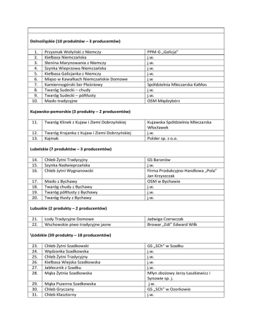 Dolnośląskie (10 produktów – 3 producentów) 1. 2. 3. 4. 5. 6. 7. 8. 9. 10. Przysmak Wołyński z Niemczy Kiełbasa Niemczańska Słonina Marynowania z Niemczy Szynka Wieprzowa Niemczańska Kiełbasa Galicjanka z Niemczy Mięso w Kawałkach Niemczańskie Domowe Kamiennogórski Ser Pleśniowy Twaróg Sudecki – chudy Twaróg Sudecki – półtłusty Masło tradycyjne PPM-G „Galicja” j.w. j.w. j.w. j.w. j.w Spółdzielnia Mleczarska KaMos j.w. j.w. OSM Międzybórz Kujawsko-pomorskie (3 produkty – 2 producentów) 11. Twaróg Klinek z Kujaw i Ziemi Dobrzyńskiej 12. 13. Twaróg Krajanka z Kujaw i Ziemi Dobrzyńskiej Kajmak Kujawska Spółdzielnia Mleczarska Włocławek j.w. Polder sp. z o.o. Lubelskie (7 produktów – 3 producentów) 14. 15. 16. Chleb Żytni Tradycyjny Szynka Nadwieprzańska Chleb żytni Wygnanowski 17. 18. 19. 20. Masło z Bychawy Twaróg chudy z Bychawy Twaróg półtłusty z Bychawy Twaróg tłusty z Bychawy GS Baranów j.w. Firma Produkcyjno-Handlowa „Pola” Jan Krzyszczak OSM w Bychawie j.w. j.w. j.w. Lubuskie (2 produkty – 2 producentów) 21. 22. Lody Tradycyjne Domowe Wschowskie piwo tradycyjne jasne Jadwiga Czerwczak Browar „Edi” Edward Wilk \Łódzkie (39 produkty – 18 producentów) 23. 24. 25. 26. 27. 28. Chleb Żytni Szadkowski Wędzonka Szadkowska Chleb Żytni Tradycyjny Kiełbasa Wiejska Szadkowska Jabłecznik z Szadku Mąka Żytnia Szadkowska 29. 30. 31. Mąka Pszenna Szadkowska Chleb Gryczany Chleb Klasztorny GS „SCh” w Szadku j.w. j.w. j.w. j.w. Młyn zbożowy Jerzy Łaszkiewicz i Synowie sp. j. j.w. GS „SCh” w Ozorkowie j.w. 32. 33. 34. 35. 36. Chleb Kozacki Chleb Żytni Tradycyjny Sok Jabłkowy z Kałęczewa Kiełbasa Bilska Schab Pieczony z Białej Góry 37. 38. 39. 40. 41. 42. Kiełbasa Krucha z Białej Góry Szynka Dojrzewająca z Białej Góry Twaróg Półtłusty Masło Ekstra z Głuchowa Chleb Żytni Tradycyjny Karp z Bylin 43. 44. 45. 46. 47. 48. 49. 50. 51. Szynka Walichnowska Golonka Walichnowska Boczek Walichnowski Szynka Walichnowska Golonka Walichnowska Boczek Walichnowski Chleb Solecki Ciastka Soleckie Ciastka Świątnickie 52. Jabłka z Doliny Mrogi 53. 54. 55. Zalewajka Buczkowskie pierogi z pieca Chleb żytni z Koluszek 56. 57. 58. 59. 60. 61. Chleb razowy z Koluszek Chleb Staropolski j.w Masło Ekstra z Klimeko Ciastka z Nagawek Ciasto drożdżowe z Nagawek Ciasto kruche z owocami z Nagawek j.w. j.w. Grażyna Wiatr Masarnia z Ubojnią Alina Kowalska Zakład Rzeźniczo-Wędliniarski Stanisław Katusza j.w. j.w. OSM Głuchów j.w. GS „SCh” w Warcie Gospodarstwo Rybackie Byliny Jerzy Ćwiertnia Chata Walichnowska sp. z o.o. j. w. j. w. PPHU MARK’S sp. z o.o. j. w. j. w. PPHU Stefan Koziński, Ozorków j. w. PPHU Grabowski Piekarstwo Cukiernictwo ELITA Grupa Producentów Owoców Sp. z o. o. P.W.P.U.i H. Inter Solar (łódzkie) j.w. PPHU Zakład Piekarniczy Elżbieta Olszyńska j. w. PPH „Klimeko” Bogusław Klimczak Elżbieta Krajewska j.w. j.w. Małopolskie (14 produktów – 7 producentów) 62. 63. 64. 65. Twaróg Tłusty Klinek Masło Ekstra Bocheńskie Chleb Żytni Tradycyjny Kiełbasa Zwyczajna od Kołdrasa 66. 67. 68. 69. 70. 71. Kiełbasa Wiejska od Kołdrasa Kiełbasa Krakowska Podsuszana od Kołdrasa Salceson od Kołdrasa Salceson Wiejski Mleko od krowy rasy Polska Czerwona Kiełbasa Piaszczańska OSM Bochnia jw. GS „SCh” Chełmek Zakład Przetwórstwa Mięsnego Henryk Kołdras j. w. j. w. j. w. ZPHU Stanpol Jan Kawski OSM Limanowa Gawor Produkcja Wędlin Jakość Tradycja 72. 73. 74. 75. Kiełbasa Wiejska z Podstolic Szynka Podstolego Boczek gotowany z Podstolic Kiełbasa tradycyjnie wyrabiana j.w. j.w. j.w. Wyrób Wędlin Tradycyjnych Wolarek Mazowieckie (3 produkty – 2 producentów) 76. 77. 78. Ser Twarogowy Półtłusty Twaróg Tłusty Twaróg Półtłusty OSM Sanniki OSM Garwolin j.w. Opolskie (2 produkty – 2 producentów) 79. 80. Chleb Żytni Tradycyjny Masło Ekstra z Olesna GS „SCh” w Praszce OSM w Oleśnie Podkarpackie (12 produktów – 4 producentów) 81. 82. 83. 84. 85. 86. 87. 88. Kiełbasianka z Górna Studzienina z Górna Boczek w słoju z Górna Pasztet w słoju tradycyjny z Górna Wiejska pieczona z Górna Boczek pieczony z Górna Szynka swojska z Górna Karp ze Starzawy 89. 90. 91. 92. Karp po Starzawsku Chleb żytni tradycyjny Krówka mleczna Strzyżowska Sople Choinkowe ZM „Smak Górno” j. w. j. w. j. w. j. w. j. w. j. w. Gospodarstwo Rybackie w Starzawie sp. z o.o. Anna Ostafińska j. w. GS”Samopomoc Chłopska” Rymanów „Roksana” (podkarpackie) j.w. Podlaskie (2 produkty – 2 producentów) 93. 94. Masło Tradycyjne z Filipowa Chleb Żytni Staropolski SM „Rospuda” Filipów Piekarnia „Ziarenko”, Michałów Pomorskie brak produktu z certyfikatem Śląskie (2 produkty – 2 producentów) 95. Chleb Żytni Tradycyjny 96. Ciasto Drożdżowe Maślane Spółdzielnia Usługowo-Handlowa „Jedność” Consonni Bartelak S.C. Świętokrzyskie (34 produkty – 17 producentów) 97. 98. Ser Twarogowy naturalny Świętokrzyski Masło Jędrzejowskie Gminna Mleczarnia w Pierzchnicy Jędrzejowska Spółdzielnia Mleczarska, 99. 100. 101. 102. 103. 104. 105. 106. 107. 108. 109. 110. 111. Jędrzejowski Twarożek Śmietankowy Ser Naturalny Twarogowy Świętokrzyski Masło Chmielnickie Ser Twarogowy Naturalny Świętokrzyski Opatowska krówka mleczna Majonez Kielecki Musztarda Kielecka Delikatesowa Stołowa Ocet Spirytusowy 10% Chleb Pszenny Graham Chleb Żytni Razowy Żurek Kielecki Zraz Kielecki w Sosie Własnym Karp z Oksy 112. 113. Kiełbasa Świętokrzyska Krajana Miód spadziowo-nektarowy z Napękowa 114. 115. 116. Miód spadziowy Napękowski Krówka kielczanka Fasola Biała z Ponidzia 117. 118. 119. 120. 121. 122. 123. 124. 125. 126. 127. 128. Fasola Piękny Jaś Karłowy z Ponidzia Kasza Jęczmienna z Ponidzia Pęczak z Ponidzia Kasza jaglana z Ponidzia Groch łuskany z Ponidzia Mięta z Ponidzia Melisa z Ponidzia Ser Twarogowy Półtłusty Krajanka Chleb 