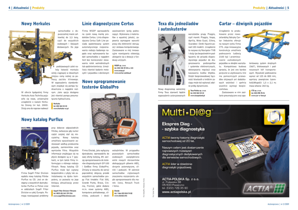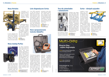 4 | AktualnoÊci | Produkty Produkty | AktualnoÊci | 5 Nowy Herkules Linie diagnostyczne Certus samochodów o dopuszczalnej masie ca∏kowitej do 3,5 tony, czyli do wszystkich osobowych i l˝ejszych dostawczych. Do jego W ofercie bydgoskiej firmy Herkules Auto Technika pojawi∏o si´ nowe, uniwersalne urzàdzenie o nazwie Herkules Strong (nr kat. 2000). S∏u˝y ono do napraw nadwozi podstawowych zalet nale˝y ∏atwoÊç monta˝u wie˝y ciàgnàcej w dowolnym miejscu ramy noÊnej za pomocà zacisku klinowego. W wyposa˝eniu standardowym znajduje si´ pompa hydrauliczna o nap´dzie no˝nym. Jako opcja dost´pna jest równie˝ pompa pneumatyczno-hydrauliczna. Firma WSOP wprowadzi∏a na rynek nowà mark´ produktów Certus. Linia diagnostyczna Certus Safe Line posiada opatentowany system automatycznego rozpoznawania rodzaju badanego nap´du oraz wykonywania badaƒ samochodów z nap´dem 4x4 bez koniecznoÊci stosowania rolek wolnobie˝nych lub opóênieniomierza. Umo˝liwia równie˝ badanie motocykli i pojazdów z obni˝onym Texa dla jednoÊladów i autoskuterów zawieszeniem (próg podnoszàcy). Wykonana z materia∏ów o wysokiej jakoÊci, zapewnia wymagane warunki pracy dla elektroniki sterujàcej i zestawu komputerowego. Zastosowane w niej innowacyjne rozwiàzania u∏atwiajà ubieganie si´ o dotacje z funduszy unijnych. warsztatów grupy Piaggio, czyli marek: Piaggio, Vespa, Aprilia, Moto Guzzi, Gilera, Scarabeo i Derbi (∏àcznie ponad 100 modeli). Urzàdzenie to nazywa si´ Navigator TXB i s∏u˝y (po bezpoÊrednim pod∏àczeniu do gniazda diagnostycznego pojazdu) do diagnozowania podzespo∏ów i systemów elektronicznych, dokonywania regulacji oraz kasowania kodów b∏´dów. Dzi´ki bezprzewodowej ∏àcznoÊci bluetooth o krótkim zasi´gu mo˝e te˝ wykonaç zdalne próby dynamiczne. WSOP sp. z o.o. tel. 032 332 49 30 w. 115 www.wsop.pl www.certus-polska.pl Nowe oprogramowanie testerów GlobalPro Nowy diagnoskop weneckiej firmy Texa stanowiç b´dzie wyposa˝enie autoryzowanych Texa Polska sp. z o.o. tel. 012 263 10 12 www.texapoland.pl Cartar – dêwignik pojazdów Urzàdzenie to produkowane przez nowozelandzkà fabryk´ Cartar Industries oferuje na naszym rynku firma CTS. Jego innowacyjna konstrukcja umo˝liwia podnoszenie (udêwig 2100 kg) i przemieszczanie uszkodzonych pojazdów w obr´bie warsztatu. Kompaktowa budowa sprawia, ˝e jest ono bardzo por´czne w u˝ytkowaniu (nie ma pomocniczych przewodów olejowych ani dodatkowych wózków) i spe∏nia wszelkie wymogi bezpieczeƒstwa. Zastosowano w nim zasilanie pneumatyczne oraz opa- tentowany system skr´tnych (360°), blokowanych i podnoszonych kó∏ transportowych. WysokoÊç podnoszenia wynosi od 125 do 800 mm, wymiary zewn´trzne (szerokoÊç/d∏ugoÊç): 1,5 x 2,1 m; masa w∏asna: 265 kg. CTS sp. z o.o. tel. 032 290 78 51 www.car-o-liner.pl Herkules tel. 052 363 33 43 www.herkules-sc.pl Autonaprawa | nr 2/2009 Sogefi Filter Division-Filtrauto tel. 0033 (0) 161 374 316 www.sogefifilterdivision.com Firma Ekolab, jako wy∏àczny dystrybutor, wprowadzi∏a do swej oferty kolejnà, 89. wersj´ oprogramowania do testerów diagnostycznych GP-100 i GedBox firmy GlobalPro. Zmiany w stosunku do wersji poprzedniej dotyczà przede wszystkim samochodów grupy Fiat (modele: Fiat 500, Grande Punto, Bravo, Croma, Fiorino), gdzie dodano m.in. nowe systemy ABS, komputera pok∏adowego, silników, poduszek i deski wskaêników. W przypadku pozosta∏ych samochodów osobowych uwzgl´dniono wiele nowych sterowników obs∏ugujàcych g∏ównie ABS, skrzynie automatyczne, silniki i poduszki. W zakresie samochodów ci´˝arowych znacznemu rozszerzeniu uleg∏o oprogramowanie dla marek: Iveco, Renault Truck i Volvo. Ekolab tel./ faks 033 810 74 82 www.ekolab.info Fot. Cartar, Texa Firma Sogefi Filter Division wyda∏a nowy katalog filtrów Purflux na CD. Jest on dost´pny u wszystkich dystrybutorów Purflux w Polsce oraz w oddzia∏ach Sogefi Filter Division w ca∏ej Europie. Pomaga rozwiàzywaç problemy przy doborze odpowiednich filtrów, zw∏aszcza gdy numer cz´Êci zu˝ytej sta∏ si´ nieczytelny. Nowy katalog umo˝liwia wyszukiwanie zastosowaƒ wed∏ug producenta pojazdu, zamienników oraz wymiarów filtra. Wszystkie informacje znajdujàce si´ na p∏ycie dost´pne sà w 7 j´zykach, w tym tak˝e filmy informujàce o ró˝nego rodzaju filtrach. Nowy katalog CD Purflux mo˝e byç czytany bezpoÊrednio z p∏yty lub zainstalowany na dysku komputera, co pozwala na jego bie˝àcà aktualizacj´ przez Internet. Fot. GlobalPro, Herkules, Purflux Nowy katalog Purflux Autonaprawa | nr 2/2009
