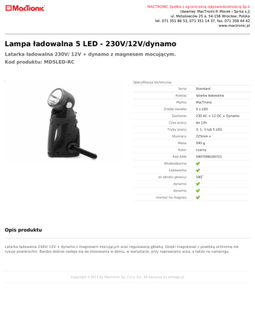 MACTRONIC Spółka z ograniczoną odpowiedzialnością Sp.k (dawniej: MacTronic® Mocek i Sp-ka s.j) ul. Metalowców 25 a, 54-156 Wrocław, Polska tel. 071 351 86 53, 071 351 14 37, fax. 071 358 44 42 www.mactronic.pl Lampa ładowalna 5 LED - 230V/12V/dynamo Latarka ładowalna 230V/ 12V + dynamo z magnesem mocującym. Kod produktu: MD5LED-RC Specyfikacja techniczna: Seria: Standard Rodzaj: latarka ładowalna Marka: MacTronic Źródło światła: Zasilanie: Czas pracy: Tryby pracy: Wymiary: 5 x LED 230 AC + 12 DC + Dynamo do 12h 3: 1, 3 lub 5 LED 225mm x Masa: 595 g Kolor: czarny Kod EAN: 5907596104721 Wodoodporna: Ładowarka: oś obrotu głowicy: 180˚ dynamo: dynamo: montaż na magnes: Opis produktu Latarka ładowalna 230V/ 12V + dynamo z magnesem mocującym oraz regulowaną główką. Dzięki magnesowi z powłoką ochronną nie rysuje powierzchni. Bardzo dobrze nadaje się do stosowania w domu, w warsztacie, przy naprawianiu auta, a także na campingu. Copyright ©2011 by Mactronic Sp. z o.o. S.k. All inclusive by pimago.pl