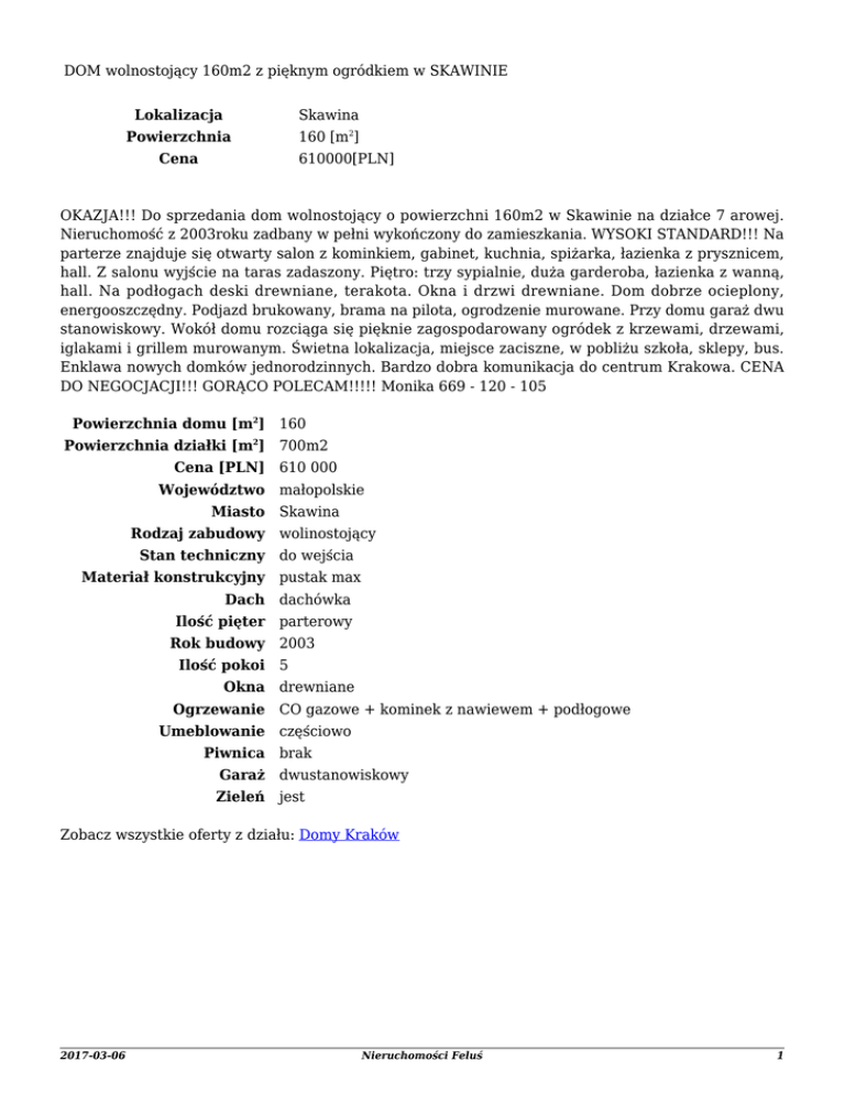 DOM wolnostojący 160m2 z pięknym ogródkiem w SKAWINIE Lokalizacja Skawina Powierzchnia 160 [m2] Cena 610000[PLN] OKAZJA!!! Do sprzedania dom wolnostojący o powierzchni 160m2 w Skawinie na działce 7 arowej. Nieruchomość z 2003roku zadbany w pełni wykończony do zamieszkania. WYSOKI STANDARD!!! Na parterze znajduje się otwarty salon z kominkiem, gabinet, kuchnia, spiżarka, łazienka z prysznicem, hall. Z salonu wyjście na taras zadaszony. Piętro: trzy sypialnie, duża garderoba, łazienka z wanną, hall. Na podłogach deski drewniane, terakota. Okna i drzwi drewniane. Dom dobrze ocieplony, energooszczędny. Podjazd brukowany, brama na pilota, ogrodzenie murowane. Przy domu garaż dwu stanowiskowy. Wokół domu rozciąga się pięknie zagospodarowany ogródek z krzewami, drzewami, iglakami i grillem murowanym. Świetna lokalizacja, miejsce zaciszne, w pobliżu szkoła, sklepy, bus. Enklawa nowych domków jednorodzinnych. Bardzo dobra komunikacja do centrum Krakowa. CENA DO NEGOCJACJI!!! GORĄCO POLECAM!!!!! Monika 669 - 120 - 105 Powierzchnia domu [m2] 160 Powierzchnia działki [m2] 700m2 Cena [PLN] 610 000 Województwo małopolskie Miasto Skawina Rodzaj zabudowy wolinostojący Stan techniczny do wejścia Materiał konstrukcyjny pustak max Dach dachówka Ilość pięter parterowy Rok budowy 2003 Ilość pokoi 5 Okna drewniane Ogrzewanie CO gazowe + kominek z nawiewem + podłogowe Umeblowanie częściowo Piwnica brak Garaż dwustanowiskowy Zieleń jest Zobacz wszystkie oferty z działu: Domy Kraków 2017-03-06 Nieruchomości Feluś 1