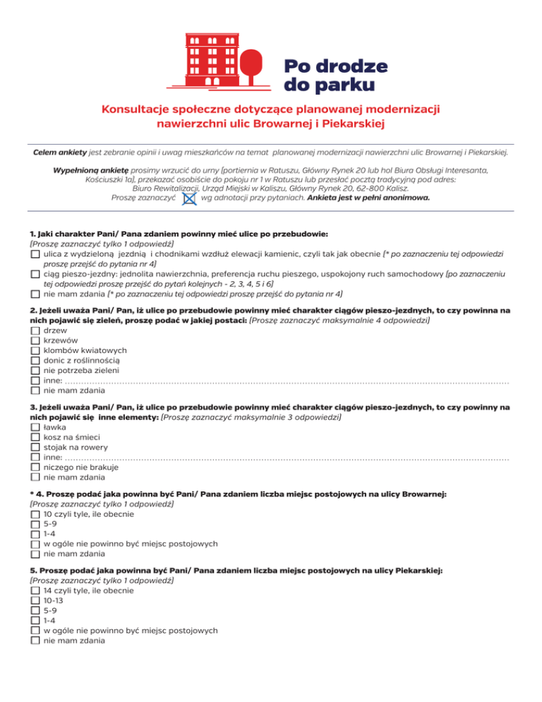 Po drodze do parku Konsultacje społeczne dotyczące planowanej modernizacji nawierzchni ulic Browarnej i Piekarskiej Celem ankiety jest zebranie opinii i uwag mieszkańców na temat planowanej modernizacji nawierzchni ulic Browarnej i Piekarskiej. Wypełnioną ankietę prosimy wrzucić do urny (portiernia w Ratuszu, Główny Rynek 20 lub hol Biura Obsługi Interesanta, Kościuszki 1a), przekazać osobiście do pokoju nr 1 w Ratuszu lub przesłać pocztą tradycyjną pod adres: Biuro Rewitalizacji, Urząd Miejski w Kaliszu, Główny Rynek 20, 62-800 Kalisz. Proszę zaznaczyć wg adnotacji przy pytaniach. Ankieta jest w pełni anonimowa. 1. Jaki charakter Pani/ Pana zdaniem powinny mieć ulice po przebudowie: (Proszę zaznaczyć tylko 1 odpowiedź) ulica z wydzieloną jezdnią i chodnikami wzdłuż elewacji kamienic, czyli tak jak obecnie (* po zaznaczeniu tej odpowiedzi proszę przejść do pytania nr 4) ciąg pieszo-jezdny: jednolita nawierzchnia, preferencja ruchu pieszego, uspokojony ruch samochodowy (po zaznaczeniu tej odpowiedzi proszę przejść do pytań kolejnych - 2, 3, 4, 5 i 6) nie mam zdania (* po zaznaczeniu tej odpowiedzi proszę przejść do pytania nr 4) 2. Jeżeli uważa Pani/ Pan, iż ulice po przebudowie powinny mieć charakter ciągów pieszo-jezdnych, to czy powinna na nich pojawić się zieleń, proszę podać w jakiej postaci: (Proszę zaznaczyć maksymalnie 4 odpowiedzi) drzew krzewów klombów kwiatowych donic z roślinnością nie potrzeba zieleni inne: nie mam zdania 3. Jeżeli uważa Pani/ Pan, iż ulice po przebudowie powinny mieć charakter ciągów pieszo-jezdnych, to czy powinny na nich pojawić się inne elementy: (Proszę zaznaczyć maksymalnie 3 odpowiedzi) ławka kosz na śmieci stojak na rowery inne: niczego nie brakuje nie mam zdania * 4. Proszę podać jaka powinna być Pani/ Pana zdaniem liczba miejsc postojowych na ulicy Browarnej: (Proszę zaznaczyć tylko 1 odpowiedź) 10 czyli tyle, ile obecnie 5-9 1-4 w ogóle nie powinno być miejsc postojowych nie mam zdania 5. Proszę podać jaka powinna być Pani/ Pana zdaniem liczba miejsc postojowych na ulicy Piekarskiej: (Proszę zaznaczyć tylko 1 odpowiedź) 14 czyli tyle, ile obecnie 10-13 5-9 1-4 w ogóle nie powinno być miejsc postojowych nie mam zdania 6. Pani/ Pana sugestie na temat modernizacji ulic. ul. Browarna: ul. Piekarska: METRYCZKA Wiek do 18 lat 19-25 lat 26-39 lat 40-65 lat powyżej 65 lat Płeć kobieta mężczyzna Wykształcenie podstawowe zawodowe średnie wyższe Miejsce zamieszkania ul. Browarna ul. Piekarska inny teren miasta Kalisza poza miastem Kalisz Czy jesteś przedsiębiorcą prowadzącym działalność przy ul. Browarnej lub ul. Piekarskiej? Tak Nie