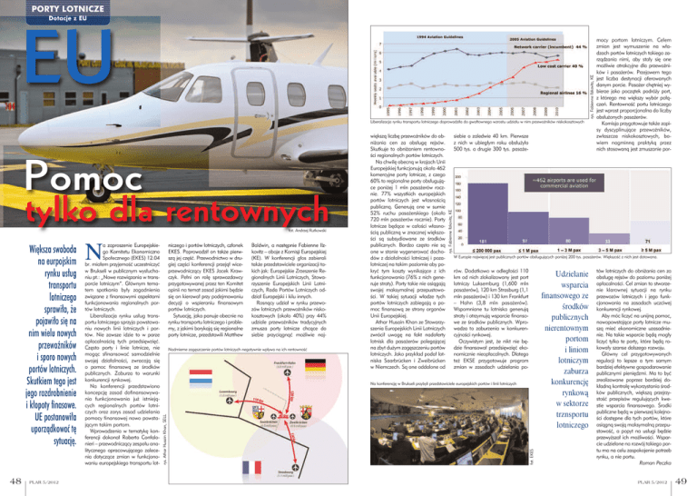 PORTY LOTNICZE EU rys. Fabienne Ilzkovitz, KE Dotacje z EU Liberalizacja rynku transportu lotniczego doprowadziła do gwałtownego wzrostu udziału w nim przewoźników niskokosztowych tylko dla rentownych fot. Andrzej Rutkowski 48 PLAR 5/2012 N niczego i portów lotniczych, członek EKES. Poprowadził on także pierwszą jej część. Przewodnictwo w drugiej części konferencji przejął wiceprzewodniczący EKES Jacek Krawczyk. Pełni on rolę sprawozdawcy przygotowywanej przez ten Komitet opinii na temat zasad jakimi będzie się on kierował przy podejmowaniu decyzji o wspieraniu finansowym portów lotniczych. Sytuację, jaka panuje obecnie na rynku transportu lotniczego i problemy, z jakimi borykają się regionalne porty lotnicze, przedstawili Matthew Baldwin, a następnie Fabienne Ilzkovitz – oboje z Komisji Europejskiej (KE). W konferencji głos zabierali także przedstawiciele organizacji takich jak: Europejskie Zrzeszenie Regionalnych Linii Lotniczych, Stowarzyszenie Europejskich Linii Lotniczych, Rada Portów Lotniczych oddział Europejski i kilu innych. Rosnący udział w rynku przewozów lotniczych przewoźników niskokosztowych (około 40%) przy 44% udziale przewoźników tradycyjnych zmusza porty lotnicze chcące do siebie przyciągnąć możliwie naj- Nadmierne zagęszczenie portów lotniczych negatywnie wpływa na ich rentowność W Europie najwięcej jest publicznych portów obsługujących poniżej 200 tys. pasażerów. Większość z nich jest dotowana. rów. Dodatkowo w odległości 110 km od nich zlokalizowany jest port lotniczy Luksemburg (1,600 mln pasażerów), 120 km Strasburg (1,1 mln pasażerów) i 130 km Frankfurt – Hahn (3,8 mln pasażerów). Wspomniane tu lotniska generują straty i otrzymują wsparcie finansowe ze środków publicznych. Wprowadza to zaburzenia w konkurencyjności rynkowej. Oczywistym jest, że nikt nie będzie finansował przedsięwzięć ekonomicznie nieopłacalnych. Dlatego też EKSE przygotowuje program zmian w zasadach udzielania po- Udzielanie wsparcia finansowego ze środków publicznych nierentownym portom i liniom lotniczym zaburza konkurencję rynkową w sektorze trznsportu lotniczego Na konferencję w Brukseli przybyli przedstawiciele europejskich portów i linii lotniczych fot. EKES a zaproszenie Europejskiego Komitetu Ekonomiczno Społecznego (EKES) 12.04 br. miałem przyjemość uczestniczyć w Brukseli w publicznym wysłuchaniu pt.: „Nowe rozwiązania w transporcie lotniczym”. Głównym tematem spotkania były zagadnienia związane z finansowymi aspektami funkcjonowania regionalnych portów lotniczych. Liberalizacja rynku usług transportu lotniczego sprzyja powstawaniu nowych linii lotniczych i portów. Nie zawsze idzie to w parze opłacalnością tych przedsięwzięć. Często porty i linie lotnicze, nie mogąc sfinansować samodzielnie swojej działalności, zwracają się o pomoc finansową ze środków publicznych. Zaburza to warunki konkurencji rynkowej. Na konferencji przedstawiono koncepcję zasad dofinansowywania funkcjonowania już istniejących regionalnych portów lotniczych oraz zarys zasad udzielania pomocy finansowej nowo powstającym takim portom. Wprowadzenia w tematykę konferencji dokonał Roberto Confalonieri – przewodniczący zespołu analitycznego opracowującego zalecenia dotyczące zmian w funkcjonowaniu europejskiego transportu lot- rys. Athar Husain Khan, SELL Większa swoboda na eurpojskim rynku usług transportu lotniczego sprawiła, że pojawiło się na nim wielu nowych przewoźników i sporo nowych portów lotniczych. Skutkiem tego jest jego rozdrobnienie i kłopoty finasowe. UE postanowiła uporządkować tę sytuację. siebie o zaledwie 40 km. Pierwsze z nich w ubiegłym roku obsłużyło 500 tys. a drugie 300 tys. pasaże- rys. Fabienne Ilzkovitz, KE Pomoc większą liczbę przewoźników do obniżania cen za obsługę rejsów. Skutkuje to obniżaniem rentowności regionalnych portów lotniczych. Na chwilę obecną w krajach Unii Europejskiej funkcjonują około 462 komercyjne porty lotnicze, z czego 60% to regionalne porty obsługujące poniżej 1 mln pasażerów rocznie. 77% wszystkich europejskich portów lotniczych jest własnością publiczną. Generują one w sumie 52% ruchu pasażerskiego (około 720 mln pasażerów rocznie). Porty lotnicze będące w całości własnością publiczną w znacznej większości są subsydiowane ze środków publicznych. Bardzo często nie są one w stanie wygenerować dochodów z działalności lotniczej i pozalotniczej na takim poziomie aby pokryć tym koszty wynikające z ich funkcjonowania (76% z nich generuje straty). Porty takie nie osiągają swojej maksymalnej przepustowości. W takiej sytuacji władze tych portów lotniczych zabiegają o pomoc finansową ze strony organów Unii Europejskiej. Athar Husain Khan ze Stowarzyszenia Europejskich Linii Lotniczych zwrócił uwagę na fakt nadoferty lotnisk dla pasażerów polegającej na zbyt dużym zagęszczeniu portów lotniczych. Jako przykład podał lotniska Saarbrücken i Zweibrücken w Niemczech. Są one oddalone od mocy portom lotniczym. Celem zmian jest wymuszenie na władzach portów lotniczych takiego zarządzania nimi, aby stały się one możliwie atrakcyjne dla przewoźników i pasażerów. Przejawem tego jest liczba destynacji oferowanych danym porcie. Pasażer chętniej wybierze jako początek podróży port, z którego ma większy wybór połączeń. Rentowność portu lotniczego jest wprost proporcjonalna do liczby obsłużonych pasażerów. Komisja przygotowuje także zapisy dyscyplinujące przewoźników, zwłaszcza niskokosztowych, bowiem nagminną praktyką przez nich stosowaną jest zmuszanie por- tów lotniczych do obniżania cen za obsługę rejsów do poziomu poniżej opłacalności. Cel zmian to stworzenie klarownej sytuacji na rynku przewozów lotniczych i jego funkcjonowania na zasadach uczciwej konkurencji rynkowej. Aby móc liczyć na unijną pomoc, nowopowstając