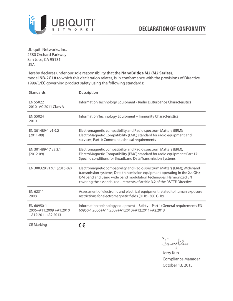 DECLARATION OF CONFORMITY Ubiquiti Networks, Inc. 2580 Orchard Parkway San Jose, CA 95131 USA Hereby declares under our sole responsibility that the NanoBridge M2 (M2 Series), model NB-2G18 to which this declaration relates, is in conformance with the provisions of Directive 1999/5/EC governing product safety using the following standards: Standards Description EN 55022 2010+AC:2011 Class A Information Technology Equipment - Radio Disturbance Characteristics EN 55024 2010 Information Technology Equipment – Immunity Characteristics EN 301489-1 v1.9.2 (2011-09) Electromagnetic compatibility and Radio spectrum Matters (ERM); ElectroMagnetic Compatibility (EMC) standard for radio equipment and services; Part 1: Common technical requirements EN 301489-17 v2.2.1 (2012-09) Electromagnetic compatibility and Radio spectrum Matters (ERM); ElectroMagnetic Compatibility (EMC) standard for radio equipment; Part 17: Specific conditions for Broadband Data Transmission Systems EN 300328 v1.9.1 (2015-02) Electromagnetic compatibility and Radio spectrum Matters (ERM); Wideband transmission systems; Data transmission equipment operating in the 2,4 GHz ISM band and using wide band modulation techniques; Harmonized EN covering the essential requirements of article 3.2 of the R&TTE Directive EN 62311 2008 Assessment of electronic and electrical equipment related to human exposure restrictions for electromagnetic fields (0 Hz - 300 GHz) EN 60950-1 2006+A11:2009 +A1:2010 +A12:2011+A2:2013 Information technology equipment – Safety – Part 1: General requirements EN 60950-1:2006+A11:2009+A1:2010+A12:2011+A2:2013 CE Marking Jerry Kuo Compliance Manager October 13, 2015 DECLARATION OF CONFORMITY Česky [Czech] UBIQUITI NETWORKS tímto prohlašuje, že toto UBIQUITI NETWORKS zařízení, je ve shod se základními požadavky a dalšími příslušnými ustanoveními směrnice 1999/5/ES. Dansk [Danish] Hermed, UBIQUITI NETWORKS, erklærer at denne UBIQUITI NETWORKS enhed, er i overensstemmelse med de væsentlige krav og øvrige relevante krav i direktiv 1999/5/EF. Nederlands [Dutch] Hierbij verklaart UBIQUITI NETWORKS, dat deze UBIQUITI NETWORKS apparaat, in overeenstemming is met de essentiële eisen en de andere relevante bepalingen van richtlijn 1999/5/EC. English Hereby, UBIQUITI NETWORKS, declares that this UBIQUITI NETWORKS device, is in compliance with the essential requirements and other relevant provisions of Directive 1999/5/EC. Eesti [Estonian] Käesolevaga UBIQUITI NETWORKS kinnitab, et antud UBIQUITI NETWORKS seade, on vastavus olulistele nõuetele ja teistele asjakohastele sätetele direktiivi 1999/5/EÜ. Suomi [Finnish] Täten UBIQUITI NETWORKS vakuuttaa, että tämä UBIQUITI NETWORKS laite, on yhdenmukainen olennaisten vaatimusten ja muiden sitä koskevien direktiivin 1999/5/EY. Français [French] Par la présente UBIQUITI NETWORKS déclare que l’appareil UBIQUITI NETWORKS, est conforme aux exigences essentielles et aux autres dispositions pertinentes de la directive 1999/5/CE. Deutsch [German] Hiermit erklärt UBIQUITI NETWORKS, dass sich dieses UBIQUITI NETWORKS Gerät, in Übereinstimmung mit den grundlegenden Anforderungen und den anderen relevanten Vorschriften der Richtlinie 1999/5/EG befindet. Ελληνική [Greek] Δια του παρόντος, UBIQUITI NETWORKS, δηλώνει ότι αυτή η συσκευή UBIQUITI NETWORKS, είναι σε συμμόρφωση με τις βασικές απαιτήσεις και τις λοιπές σχετικές διατάξεις της οδηγίας 1995/5/ΕΚ. Magyar [Hungarian] Ezennel UBIQUITI NETWORKS kijelenti, hogy ez a UBIQUITI NETWORKS készülék megfelel az alapvető követelményeknek és más vonatkozó 1999/5/EK irányelv rendelkezéseit. Íslenska [Icelandic] Hér, UBIQUITI NETWORKS, því yfir að þetta UBIQUITI NETWORKS tæki er í samræmi við grunnkröfur og önnur viðeigandi ákvæði tilskipun 1999/5/EC. Italiano [Italian] Con la presente, UBIQUITI NETWORKS, dichiara che questo dispositivo UBIQUITI NETWORKS, è conforme ai requisiti essenziali ed alle altre disposizioni pertinenti della direttiva 1999/5/CE. DECLARATION OF CONFORMITY Latviski [Latvian] Ar šo, UBIQUITI NETWORKS, deklarē, ka UBIQUITI NETWORKS ierīce, ir saskaņā ar būtiskajām prasībām un citiem attiecīgiem noteikumiem Direktīvā 1999/5/EK. Lietuviškai [Lithuanian] UBIQUITI NETWORKS deklaruoja, kad šis UBIQUITI NETWORKS įrenginys atitinka esminius reikalavimus ir kitas 1999/5/EB Direktyvos nuostatas. Malti [Maltese] Hawnhekk, UBIQUITI NETWORKS, tiddikjara li dan il-mezz UBIQUITI NETWORKS huwa konformi mar-rekwiżiti essenzjali u dispożizzjonijiet rilevanti oħrajn ta ‘Direttiva 1999/5/EC. Norsk [Norwegian] Herved UBIQUITI NETWORKS, erklærer at denne UBIQUITI NETWORKS enheten, er i samsvar med de grunnleggende kravene og andre relevante bestemmelser i direktiv 1999/5/EF. Slovensky [Slovak] Týmto UBIQUITI NETWORKS, prehlasuje, že toto UBIQUITI NETWORKS zariadenie, je v súlade so základnými požiadavkami a ďalšími relevantnými ustanoveniami smernice 1999/5/ES. Svenska [Swedish] Härmed UBIQUITI NETWORKS, intygar att denna UBIQUITI NETWORKS enhet är i överensstämmelse med de väsentliga egenskapskrav och övriga relevanta bestämmelser som framgår av direktiv 1999/5/EG. Español [Spanish] Por medio de la presente UBIQUITI NETWORKS declara que este dispositivo UBIQUITI NETWORKS, cumple con los requisitos esenciales y cualesquiera otras disposiciones aplicables o exigibles de la Directiva 1999/5/CE. Polski [Polish] Niniejszym, Ubiquiti Networks, oświadcza, że urządzenie UBIQUITI NETWORKS, jest zgodny z zasadniczymi wymaganiami oraz pozostałymi stosownymi postanowieniami Dyrektywy 1999/5/EC. Português [Portuguese] UBIQUITI NETWORKS declara que este dispositivo UBIQUITI NETWORKS, está conforme com os requisitos essenciais e outras disposições da Directiva 1999/5/CE. Română [Romanian] Prin prezenta, UBIQUITI NETWORKS 