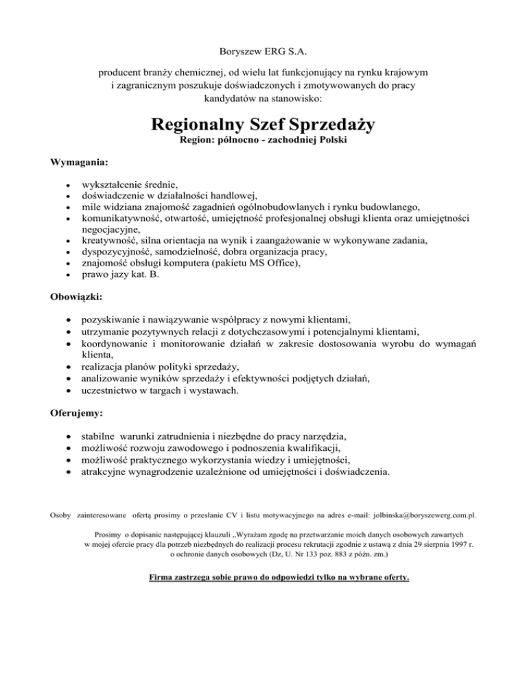 Boryszew ERG S.A. producent branży chemicznej, od wielu lat funkcjonujący na rynku krajowym i zagranicznym poszukuje doświadczonych i zmotywowanych do pracy kandydatów na stanowisko: Regionalny Szef Sprzedaży Region: północno - zachodniej Polski Wymagania: wykształcenie średnie, doświadczenie w działalności handlowej, mile widziana znajomość zagadnień ogólnobudowlanych i rynku budowlanego, komunikatywność, otwartość, umiejętność profesjonalnej obsługi klienta oraz umiejętności negocjacyjne, kreatywność, silna orientacja na wynik i zaangażowanie w wykonywane zadania, dyspozycyjność, samodzielność, dobra organizacja pracy, znajomość obsługi komputera (pakietu MS Office), prawo jazy kat. B. Obowiązki: pozyskiwanie i nawiązywanie współpracy z nowymi klientami, utrzymanie pozytywnych relacji z dotychczasowymi i potencjalnymi klientami, koordynowanie i monitorowanie działań w zakresie dostosowania wyrobu do wymagań klienta, realizacja planów polityki sprzedaży, analizowanie wyników sprzedaży i efektywności podjętych działań, uczestnictwo w targach i wystawach. Oferujemy: stabilne warunki zatrudnienia i niezbędne do pracy narzędzia, możliwość rozwoju zawodowego i podnoszenia kwalifikacji, możliwość praktycznego wykorzystania wiedzy i umiejętności, atrakcyjne wynagrodzenie uzależnione od umiejętności i doświadczenia. Osoby zainteresowane ofertą prosimy o przesłanie CV i listu motywacyjnego na adres e-mail: [email protected]. Prosimy o dopisanie następującej klauzuli „Wyrażam zgodę na przetwarzanie moich danych osobowych zawartych w mojej ofercie pracy dla potrzeb niezbędnych do realizacji procesu rekrutacji zgodnie z ustawą z dnia 29 sierpnia 1997 r. o ochronie danych osobowych (Dz, U. Nr 133 poz. 883 z późn. zm.) Firma zastrzega sobie prawo do odpowiedzi tylko na wybrane oferty.