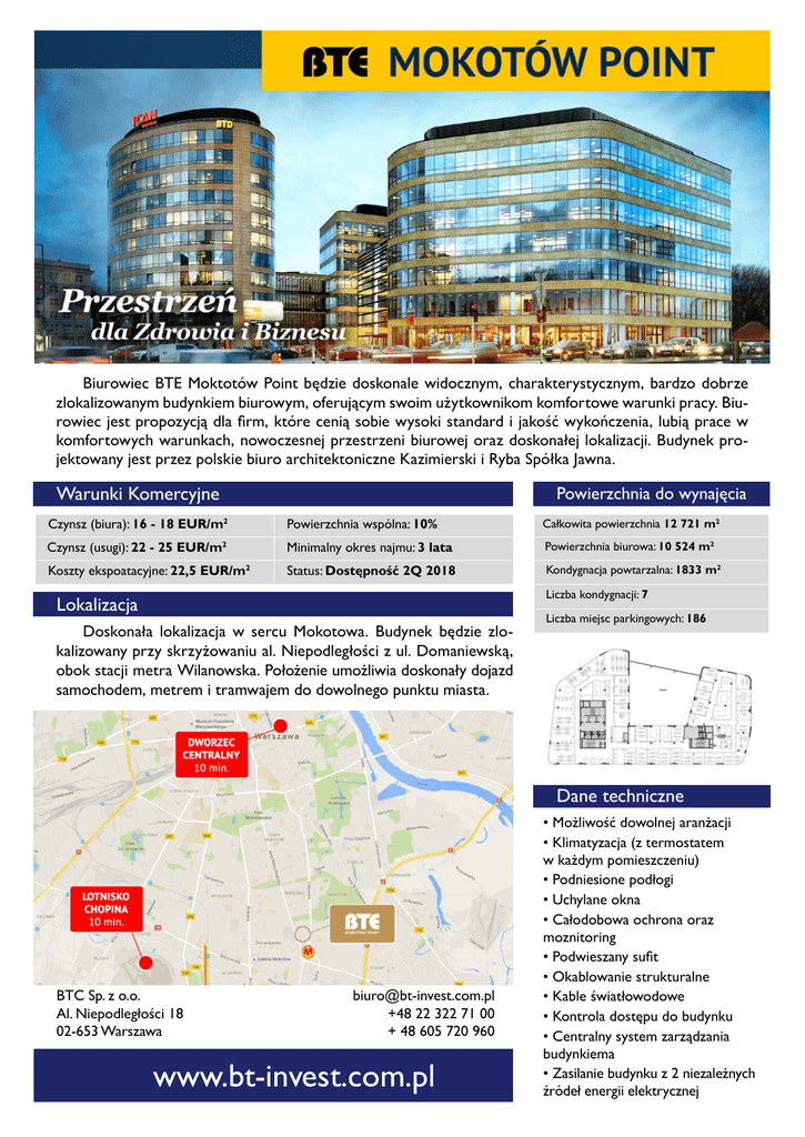 Biurowiec BTE Moktotów Point będzie doskonale widocznym, charakterystycznym, bardzo dobrze zlokalizowanym budynkiem biurowym, oferującym swoim użytkownikom komfortowe warunki pracy. Biurowiec jest propozycją dla firm, które cenią sobie wysoki standard i jakość wykończenia, lubią prace w komfortowych warunkach, nowoczesnej przestrzeni biurowej oraz doskonałej lokalizacji. Budynek projektowany jest przez polskie biuro architektoniczne Kazimierski i Ryba Spółka Jawna. Warunki Komercyjne Powierzchnia do wynajęcia Czynsz (biura): 16 - 18 EUR/m2 Powierzchnia wspólna: 10% Całkowita powierzchnia 12 721 m2 Czynsz (usugi): 22 - 25 EUR/m2 Minimalny okres najmu: 3 lata Powierzchnia biurowa: 10 524 m2 Koszty ekspoatacyjne: 22,5 EUR/m2 Status: Dostępność 2Q 2018 Kondygnacja powtarzalna: 1833 m2 Liczba kondygnacji: 7 Lokalizacja Doskonała lokalizacja w sercu Mokotowa. Budynek będzie zlokalizowany przy skrzyżowaniu al. Niepodległości z ul. Domaniewską, obok stacji metra Wilanowska. Położenie umożliwia doskonały dojazd samochodem, metrem i tramwajem do dowolnego punktu miasta. Liczba miejsc parkingowych: 186 Dane techniczne BTC Sp. z o.o. Al. Niepodległości 18 02-653 Warszawa [email protected] +48 22 322 71 00 + 48 605 720 960 www.bt-invest.com.pl • Możliwość dowolnej aranżacji • Klimatyzacja (z termostatem w każdym pomieszczeniu) • Podniesione podłogi • Uchylane okna • Całodobowa ochrona oraz moznitoring • Podwieszany sufit • Okablowanie strukturalne • Kable światłowodowe • Kontrola dostępu do budynku • Centralny system zarządzania budynkiema • Zasilanie budynku z 2 niezależnych źródeł energii elektrycznej