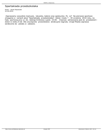MKRPA w Radomsku Spartakiada przedszkolaka Autor: Jacek Paszewski 22.09.2010. Zapraszamy wszystkie mamusie, tatusiów, babcie oraz opiekunów. Po co? Na pierwsze sportowe zmagania w ramach akcji "Spartakiada przedszkolaka". Gdzie i kiedy ? - 30 września 2010 roku, na halę sportową przy ul. św. Jadwigi Królowej o godz. 10.00. Impreza adresowana jest do przedszkoli i dzieci w wieku 6 lat. Dla zwycięzców przewidziano atrakcyjne nagrody. Urząd Miasta zaprasza serdecznie do udziału w zabawie. http://www.profilaktyka.radomsko.pl Kreator PDF Utworzono 6 March, 2017, 22:14