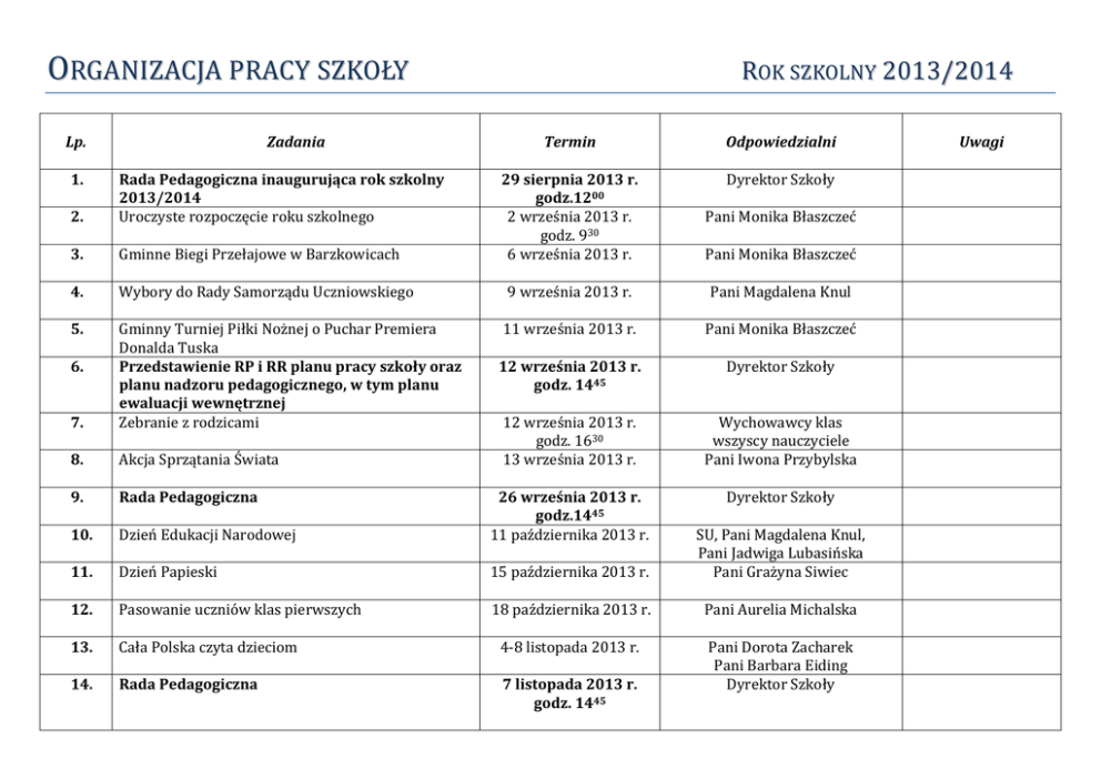 ORGANIZACJA PRACY SZKOŁY Lp. 1. Zadania ROK SZKOLNY 2013/2014 Termin Odpowiedzialni 29 sierpnia 2013 r. godz.1200 2 września 2013 r. godz. 930 6 września 2013 r. Dyrektor Szkoły Pani Monika Błaszczeć 2. Rada Pedagogiczna inaugurująca rok szkolny 2013/2014 Uroczyste rozpoczęcie roku szkolnego 3. Gminne Biegi Przełajowe w Barzkowicach 4. Wybory do Rady Samorządu Uczniowskiego 9 września 2013 r. Pani Magdalena Knul 5. 11 września 2013 r. Pani Monika Błaszczeć 12 września 2013 r. godz. 1445 Dyrektor Szkoły 7. Gminny Turniej Piłki Nożnej o Puchar Premiera Donalda Tuska Przedstawienie RP i RR planu pracy szkoły oraz planu nadzoru pedagogicznego, w tym planu ewaluacji wewnętrznej Zebranie z rodzicami 8. Akcja Sprzątania Świata 12 września 2013 r. godz. 1630 13 września 2013 r. Wychowawcy klas wszyscy nauczyciele Pani Iwona Przybylska 9. Rada Pedagogiczna Dyrektor Szkoły 10. Dzień Edukacji Narodowej 26 września 2013 r. godz.1445 11 października 2013 r. 11. Dzień Papieski 15 października 2013 r. SU, Pani Magdalena Knul, Pani Jadwiga Lubasińska Pani Grażyna Siwiec 12. Pasowanie uczniów klas pierwszych 18 października 2013 r. Pani Aurelia Michalska 13. Cała Polska czyta dzieciom 4-8 listopada 2013 r. 14. Rada Pedagogiczna 7 listopada 2013 r. godz. 1445 Pani Dorota Zacharek Pani Barbara Eiding Dyrektor Szkoły 6. Pani Monika Błaszczeć Uwagi 15. Zebranie z rodzicami 16. Rocznica Odzyskania Niepodległości 17. Szkolny konkurs wiedzy o AIDS 18. Dni profilaktyki 19. Dni Patrona 20. 22. Szkolny konkurs plastyczny – Ilustracje do utworów Jana Brzechwy Szkolny konkurs „Życie i twórczość Jana Brzechwy” dla klas III-VI Szkolny konkurs recytatorski dla klas I – VI 23. Gminny konkurs recytatorski dla klas I – VI 18-29 listopada 2013 r. 24. 18-29 listopada 2013 r. 18-29 listopada 2013 r. Pani Dorota Zacharek 26. Szkolny konkurs recytatorski dla dzieci z oddziału przedszkolnego Gminny konkurs recytatorski dla dzieci z oddziału przedszkolnego Międzynarodowy Dzień Tolerancji i Życzliwości Pani Barbara Eiding Pani Marlena Grembowska Pani Barbara Eiding Pani Marlena Grembowska Pani Barbara Eiding Pani Marlena Grembowska Pani Dorota Zacharek 21 listopada 2013 r. Pani Magdalena Knul 27. Andrzejki 29 listopada 2013 r. Samorząd Uczniowski 28. 6 grudnia 2013 r. Pani Grażyna Siwiec Pani Monika Błaszczeć 29. V Gminny Halowy Turniej Piłki Nożnej chłopców o puchar Przewodniczącego Gminnej Komisji Profilaktyki i Rozwiązywania Problemów alkoholowych Mikołajki 6 grudnia 2013 r. Samorząd Uczniowski 30. Rada Pedagogiczna Dyrektor Szkoły 31. Poinformowanie uczniów i jego rodziców o przewidywanych ocenach niedostatecznych 19 grudnia 2013 r. godz. 1445 19 grudnia 2013 r. 21. 25. 7 listopada 2013 r. godz. 1630 8 listopada 2013 r. listopad 2013 r. 12 – 15 listopada 2013 r. 18-29 listopada 2013 r. 18-29 listopada 2013 r. 18-29 listopada 2013 r. 18-29 listopada 2013 r. Wychowawcy klas wszyscy nauczyciele Pani Małgorzata Budzyńska, Pani Marlena Grembowska Pani Iwona Przybylska Pani Grażyna Siwiec wszyscy nauczyciele Pani Małgorzata Budzyńska Wychowawcy klas 32. Zebranie z rodzicami 33. Jasełka szkolne 34. Zimowa przerwa świąteczna 35. Zabawa choinkowa i bal przebierańców 36. 16 stycznia 2014 r. 37. Wystawienie proponowanych ocen na koniec I semestru Dzień Babci i Dziadka 38. Wystawienie ocen na koniec I semestru 39. Rada Pedagogiczna klasyfikacyjna 40. Rada Pedagogiczna podsumowująca 41. Zebranie z rodzicami 42. Ferie zimowe 43. Szkolny konkurs o używkach szkodliwych 27 stycznia 2014 r. do godz. 1400 30 stycznia 2014 r. godz. 1445 6 lutego 2014 r. godz. 1445 6 lutego 2014 r. godz. 1630 17 lutego 2014 r.2 marca 2014 r. luty 2014 r. 44. Parafialny konkurs biblijny dla klas IV – VI 26 marca 2014 r. Pani Grażyna Siwiec 45. 28 lutego 2014 r. Dyrektor Szkoły 20 marca 2014 r. Pani Aneta Gałaguz 47. Powołanie zespołów nadzorujących sprawdzian w kl. VI Międzynarodowy Konkurs „Kangur Matematyczny 2014” i „Kangurek” Pierwszy Dzień Wiosny 21 marca 2014 r. 48. Rada Pedagogiczna 49. Zebranie z rodzicami podsumowujące pracę w I semestrze 27 marca 2014 r. godz. 1445 27 marca 2014 r. godz. 1630 SU, Pani Magdalena Knul, Pani Jadwiga Lubasińska Dyrektor Szkoły 46. 19 grudnia 2013 r. godz. 1630 20 grudnia 2013 r. 23 grudnia 2013 r.6 stycznia 2014 r. 17 stycznia 2014 r. 21 stycznia 2014 r. Wychowawcy klas wszyscy nauczyciele Pani Grażyna Siwiec Pani Jolanta Grzegorczyk SU, Pani Magdalena Knul, Pani Jadwiga Lubasińska Nauczyciele klas IV-VI Pani Aurelia Michalska Pani Jadwiga Lubasińska Nauczyciele klas IV – VI Dyrektor Szkoły Dyrektor Szkoły Wychowawcy klas wszyscy nauczyciele Pani Iwona Przybylska Wychowawcy klas wszyscy nauczyciele 50. Sprawdzian w klasach VI 51. Rekolekcje wielkopostne 52. Wiosenna przerwa świąteczna 53. Gminny Turniej Wiedzy Olimpijskiej 17 kwietnia 2014 r.22 kwietnia 2014 r. kwiecień 2014 r. 54. Rambit ekologiczno-sportowy 24 kwietnia 2014 r. 55. I Gminny Konkurs Matematyczny dla klas II-III 56. Rocznica uchwalenia Konstytucji 3 Maja i Dzień Flagi 57. Szkolny konkurs mitologiczny dla klasy V maj 2014 r. 58. Gminny Konkurs Ortograficzny dla klas IV-VI maj 2014 r. 59. 62. Dzień Niezapominajki Szkolny konkurs ekologiczno-przyrodniczy Poinformowanie uczniów i jego rodziców o przewidywanych ocenach niedostatecznych Zapoznanie rodziców z końcowo roczną oceną opisową Szkolny konkurs języka angielskiego dla klas IV-VI 63. Rada Pedagogiczna 64. Zebranie z rodzicami 65. Dzień Dziecka 66. Wystawienie proponowanych ocen na koniec roku szkolnego Dzień Szkoły Bez Przemocy 60. 61. 67. 1 kwietnia 2014 r. kwietnia 2014 r. kwiecień 2014 r. 30 kwietnia 2014 r. 15 maja 2014 r. Pani Grażyna Siwiec Wszyscy nauczyciele Pani Monika Błaszczeć Pani Małgorzata Budzyńska Pani Iwona Przybylska Pani Jolanta Grzegorczyk Pani Aneta Gałaguz Pani Małgorzata Budzyńska Pani Marlena Grembowska Pani Małgorzata Budzyńska Pani Barb