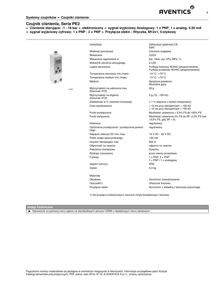 1 Systemy czujników ► Czujniki ciśnienia Czujnik ciśnienia, Seria PE2 ► Ciśnienie sterujące: -1 - 16 bar ► elektroniczny ► sygnał wyjściowy Analogowy: 1 x PNP, 1 x analog. 4-20 mA ► sygnał wyjściowy cyfrowy: 1 x PNP - 2 x PNP ► Przyłącze elektr.: Wtyczka, M12x1, 5-stykowy 23395 Certyfikaty Deklaracja zgodności CE EMV Wielkość pomiarowa Ciśnienie względne Wskazanie OLED Wskazanie regulowane w bar, mbar, psi, kPa, MPa, % Wskaźnik ciśnienia sterującego 2 LED Logika sterowania Funkcja histerezy NO/NC (programowalna) Funkcja przedziału NO/NC (programowalna) Temperatura otoczenia min./maks. -10°C / +75°C Temperatura medium min./maks. -10°C / +75°C Medium Sprężone powietrze Neutralne gazy Wytrzymałość na uderzenia max. (Kierunek XYZ) 30 g Wytrzymałość na drgania (Kierunek XYZ) 5 g (10 - 150 Hz) Dokładność w % (wartości końcowej) ± 1 % włącznie z dryfem temperatury Czas wysterowania < 10 ms przy obciążeniach < 100 kΩ > 10 ms przy obciążeniach > 100 kΩ Punkt przełączenia Możliwość ustawienia ≥ 0,5% FS do 100% FS Punkt wyłączenia Możliwość ustawienia 0% FS do SP -0,5% FS (lub +0,5% FS, gdy SP < 0) Histereza regulowany Opóźnienie przełączania / przełączania powrotnego regulowany Napięcie robocze DC min./max. 15 V DC - 32 V DC Pobór prądu spoczynkowego <50 mA rezystor obciążający max. 600 Ω Odporność na zwarcie odporny na zwarcie Położenie montażowe Dowolny Rodzaje mocowania przez otwory przelotowe Funkcja 1 x PNP, 2 x PNP 1 x PNP i 1 x analogowy stopień ochrony IP65 Ciężar 0,3 kg Materiały: Obudowa Aluminium (trowalizowane) Uszczelki1) JKauczuk fluorowy Przyłącze elektr. Aluminium z wkładką z tworzywa sztucznego 1) Na przyłączu kołnierzowym: kauczuk nitrylo-butadienowy i fluorowy Uwagi Techniczne ■ Sterowanie za pomocą menu opiera na standardowym arkuszu VDMA z dodatkowym menu tekstowym. Pogrubione numery materiałowe są dostępne w centralnym magazynie w Niemczech, informacje szczegółowe patrz Koszyk Katalog elementów pneumatycznych, PDF online, stan 2016-12-15, © AVENTICS S.à r.l., zmiany zastrzeżone 2 Systemy czujników ► Czujniki ciśnienia Czujnik ciśnienia, Seria PE2 ► Ciśnienie sterujące: -1 - 16 bar ► elektroniczny ► sygnał wyjściowy Analogowy: 1 x PNP, 1 x analog. 4-20 mA ► sygnał wyjściowy cyfrowy: 1 x PNP - 2 x PNP ► Przyłącze elektr.: Wtyczka, M12x1, 5-stykowy Typ Zakresciśnieniasterującego min./max. Zabezpieczenie przed nadciśnieniem [bar] PE2-P1-G014 PE2-P1-F001 PE2-P2-G014 -1 / 1 10 bar PE2-P1-G014 sygnał wyjściowy PE2-P2-G014 0 / 16 40 bar PE2-P2-F001 0 / 16 40 bar Numer materiałowy cyfrowy - 1 x PNP Gwint wewnętrzny, G 1/4 Fig. 1 R412010848 - 1 x PNP Kołnierz z oringiem, Ø 5x1,5 Fig. 2 R412010849 - 2 x PNP Gwint wewnętrzny, G 1/4 Fig. 1 R412010853 4 - 20 mA 1 x PNP Gwint wewnętrzny, G 1/4 Fig. 1 R412010856 1 x PNP Gwint wewnętrzny, G 1/4 Fig. 1 R412010850 1 x PNP Kołnierz z oringiem, Ø 5x1,5 Fig. 2 R412010851 2 x PNP Gwint wewnętrzny, G 1/4 Fig. 1 R412010854 2 x PNP Kołnierz z oringiem, Ø 5x1,5 Fig. 2 R412010855 Gwint wewnętrzny, G 1/4 Fig. 1 R412010857 Kołnierz z oringiem, Ø 5x1,5 Fig. 2 R412010858 - PE2-P2-F001 PE2-P1-G014 Rys. Analogowy PE2-P1-G014 PE2-P1-F001 Króciec sprężonego powietrza 4 - 20 mA 1 x PNP Pogrubione numery materiałowe są dostępne w centralnym magazynie w Niemczech, informacje szczegółowe patrz Koszyk Katalog elementów pneumatycznych, PDF online, stan 2016-12-15, © AVENTICS S.à r.l., zmiany zastrzeżone 3 Systemy czujników ► Czujniki ciśnienia Czujnik ciśnienia, Seria PE2 ► Ciśnienie sterujące: -1 - 16 bar ► elektroniczny ► sygnał wyjściowy Analogowy: 1 x PNP, 1 x analog. 4-20 mA ► sygnał wyjściowy cyfrowy: 1 x PNP - 2 x PNP ► Przyłącze elektr.: Wtyczka, M12x1, 5-stykowy Fig. 1 91 7,5 SET 12 9 5,3 102 max. M12x1 5,3 13,3 G1/4 20 30 30 23308 Pogrubione numery materiałowe są dostępne w centralnym magazynie w Niemczech, informacje szczegółowe patrz Koszyk Katalog elementów pneumatycznych, PDF online, stan 2016-12-15, © AVENTICS S.à r.l., zmiany zastrzeżone 4 Systemy czujników ► Czujniki ciśnienia Czujnik ciśnienia, Seria PE2 ► Ciśnienie sterujące: -1 - 16 bar ► elektroniczny ► sygnał wyjściowy Analogowy: 1 x PNP, 1 x analog. 4-20 mA ► sygnał wyjściowy cyfrowy: 1 x PNP - 2 x PNP ► Przyłącze elektr.: Wtyczka, M12x1, 5-stykowy Fig. 2 91 7,5 7,5 SET 8 9 5,3 102 max. M12x1 1) 5,3 20 5 2) 1,2 30 30 23309 1) śruba z łbem walcowym M5x35 (zawarta w zakresie dostawy) 2) oring Ø5x1,5 (zawarty w zakresie dostawy) Obszar wskazań i obsługi Funkcje styków 2) 1) 3) SET 3 4 5 2 1 23310 4) 5) 23314 1) Dioda LED wyjścia sterującego 1 2) Dioda LED wyjścia sterującego 2 3) Wyświetlacz (wskaźnik ciśnienia, tryby robocze, obsługa za pomocą menu) 4) Potwierdzenie wyboru menu / punktu menu 5) Przyciski wyboru punktu menu / zmiany parametrów styk 1: sygnał + UB; kolor: brązowy styk 2: sygnał: Out 2 (PNP)/ analogowy 4 - 20 mA; kolor: biały styk 3: sygnał: 0 V; kolor: niebieski styk 4: sygnał: Out 1 (PNP); kolor: czarny styk 5: sygnał: FE; kolor: szary Pogrubione numery materiałowe są dostępne w centralnym magazynie w Niemczech, informacje szczegółowe patrz Koszyk Katalog elementów pneumatycznych, PDF online, stan 2016-12-15, © AVENTICS S.à r.l., zmiany zastrzeżone 5 Systemy czujników ► Czujniki ciśnienia Czujnik ciśnienia, Seria PE2 ► Ciśnienie sterujące: -1 - 16 bar ► elektroniczny ► sygnał wyjściowy Analogowy: 1 x PNP, 1 x analog. 4-20 mA ► sygnał wyjściowy cyfrowy: 1 x PNP - 2 x PNP ► Przyłącze elektr.: Wtyczka, M12x1, 5-stykowy Schemat blokowy, 1 x PNP P Schemat blokowy, 2 x PNP 1 2 4 1 2 4 3 15...32 VDC P OUT 1 0 VDC 3 5 15...32 VDC OUT 2 OUT 1 0 VDC 5 23311 23312 Schemat blokowy, 1 x PNP i 1 x analogowy 1 2 4 3 P 15...32 VDC I 4...20 mA OUT 1 0 VDC 5 23313 charakterystyka ciśnienia-napięcia p SP RP t 1 NO 0 1 NC 0 DS 