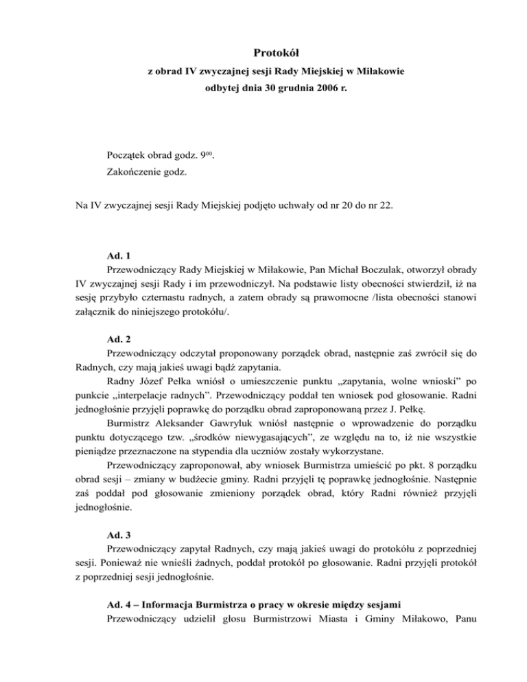Protokół z obrad IV zwyczajnej sesji Rady Miejskiej w Miłakowie odbytej dnia 30 grudnia 2006 r. Początek obrad godz. 900. Zakończenie godz. Na IV zwyczajnej sesji Rady Miejskiej podjęto uchwały od nr 20 do nr 22. Ad. 1 Przewodniczący Rady Miejskiej w Miłakowie, Pan Michał Boczulak, otworzył obrady IV zwyczajnej sesji Rady i im przewodniczył. Na podstawie listy obecności stwierdził, iż na sesję przybyło czternastu radnych, a zatem obrady są prawomocne /lista obecności stanowi załącznik do niniejszego protokółu/. Ad. 2 Przewodniczący odczytał proponowany porządek obrad, następnie zaś zwrócił się do Radnych, czy mają jakieś uwagi bądź zapytania. Radny Józef Pełka wniósł o umieszczenie punktu „zapytania, wolne wnioski” po punkcie „interpelacje radnych”. Przewodniczący poddał ten wniosek pod głosowanie. Radni jednogłośnie przyjęli poprawkę do porządku obrad zaproponowaną przez J. Pełkę. Burmistrz Aleksander Gawryluk wniósł następnie o wprowadzenie do porządku punktu dotyczącego tzw. „środków niewygasających”, ze względu na to, iż nie wszystkie pieniądze przeznaczone na stypendia dla uczniów zostały wykorzystane. Przewodniczący zaproponował, aby wniosek Burmistrza umieścić po pkt. 8 porządku obrad sesji – zmiany w budżecie gminy. Radni przyjęli tę poprawkę jednogłośnie. Następnie zaś poddał pod głosowanie zmieniony porządek obrad, który Radni również przyjęli jednogłośnie. Ad. 3 Przewodniczący zapytał Radnych, czy mają jakieś uwagi do protokółu z poprzedniej sesji. Ponieważ nie wnieśli żadnych, poddał protokół po głosowanie. Radni przyjęli protokół z poprzedniej sesji jednogłośnie. Ad. 4 – Informacja Burmistrza o pracy w okresie między sesjami Przewodniczący udzielił głosu Burmistrzowi Miasta i Gminy Miłakowo, Panu Aleksandrowi Gawrylukowi, który wpierw przedstawił informację nt. pierwszych podjętych przez siebie decyzji personalnych: zwolnienia Zastępcy Burmistrza z pełnionej przez niego funkcji oraz odwołania Kierownika Referatu Gospodarki Terenowej. Pan A. Gawryluk stwierdził, iż zapoznał się z inwestycjami w gminie. W sprawie inwestycji termomodernizacji obiektu Zespołu Szkół – 15 stycznia Urząd powinien otrzymać informację od firmy, której zlecono zbadanie prawidłowości przeprowadzonych prac oraz ich zgodności z fakturami, po tym terminie podjęta zostanie decyzja, co do dalszej współpracy z obecnym wykonawcą. Burmistrz poruszył następnie kwestię: – podań o umorzenie podatku od nieruchomości i podatku rolnego (wszystkie zostały już rozpatrzone, są to drobne kwoty dot. osób utrzymujących się z pomocy społecznej); – współpracy z organizacjami pozarządowymi; – podpisania umowy z Bankiem Ochrony Środowiska na kwotę 68 tys. zł – opłata za wykonanie kolektora ściekowego; – wystąpienia (wspólnie z Burmistrzem Morąga) z wnioskiem o zaniechanie likwidacji oddziału KRUS w Morągu; – podjęcia procedury sprawdzenia przetargu dot. przewozu dzieci do szkoły (Burmistrz wystąpił z wnioskiem do RIO w tej sprawie); – razem z Panią Skarbnik dokonał Burmistrz analizy sytuacji finansowej gminy; – w Warszawie złożono dwa załączniki do wniosku w sprawie dofinansowania II etapu termomodernizacji (m. in. tłumaczenie na jęz. angielski); – Burmistrz złożył też wniosek o odroczenie naliczania kar za oczyszczalnię ścieków na kwotę 633 tys. zł; – dokonano rozliczenia środków z ANR na remont mieszkań, kwota 120 tys. zł wpłynęła już w całości na konto urzędu; – rozpoczęto już zbieranie materiałów potrzebnych do opracowania koncepcji kanalizacji gminy, przede wszystkim mapy cyfrowe; – zostały wydane decyzje odnośnie stypendiów dla uczniów; Burmistrz rozpatrzył też wszystkie odwołania do Kolegium Samorządowego w Elblągu pozytywnie (na kwotę ponad 3 tys. zł); – a także podtrzymał zmianę numeracji na ulicy Dworcowej; – przeprowadzona została rozmowa w sprawie utworzenia w Miłakowie nowego zakładu ręcznej produkcji pieczywa, w 100% na eksport; – na bieżąco byli przyjmowani interesanci, podejmowano kwestię podatków, opieki społ., remontów; – Burmistrz interweniował w Woj. Zarządzie Dróg w sprawie odwodnienia mostu w Pitynach (zostało to już zrobione); – a także wystąpił do Zarządu Dróg Wojewódzkich o wykonanie likwidacji przełomów na ulicy Ojca Włodyki oraz na ulicy Kopernika; – odbył również spotkanie z Komendantami Komisariatu Policji w Morągu i Miłakowie w sprawie stanu posterunku oraz używania materiałów pirotechnicznych (rozporządzenie wojewody); – wystąpił do Prezesa Sądu w Ostródzie z wnioskiem o przyspieszenie zakończenia sprawy Zakładu Rolnego w Boguchwałach, którego majątek jest dewastowany (sprawa została przekazana do Elbląga); – został rozstrzygnięty przetarg na odśnieżanie na rok 2007; – zostały ogłoszone konkursy na stanowisko ds. organizacyjnych i stanowisko ds. promocji i programów pomocowych; – Burmistrz interweniował w sprawie likwidacji połączeń autobusowych przez Książnik do Boguchwał; – wreszcie, wyjaśnił też sprawę własności budynku w Stolnie i ogrodzenia. Ad. 5 – Interpelacje radnych. Radny Józef Pełka poruszył sprawę targowiska, a także zapytał, czy będzie miał wgląd do sprawozdania z wykorzystania środków ANR. Radny odniósł się następnie do kwestii drogi w Stolnie (jest ogrodzone przed drzewem, jeśli śnieg zasypie, nie będzie gdzie go odgarnąć) oraz termomodernizacji. W tej ostatniej sprawie wyjaśnił, iż brał udział w spotkaniu w Zespole Szkół z Panem Olaskiem, który wyraził tam opinię, że gmina jest sobie sama winna. W drugiej kolejności głos zabrał Radny Zbigniew Zabłocki. Przypomniał wcześniej już przedstawianą propozycję budowy chodnika na ul. Przemysłowej i wzdłuż ul. Daszyńskiego do Dworcowej, wnioskował o założenie la