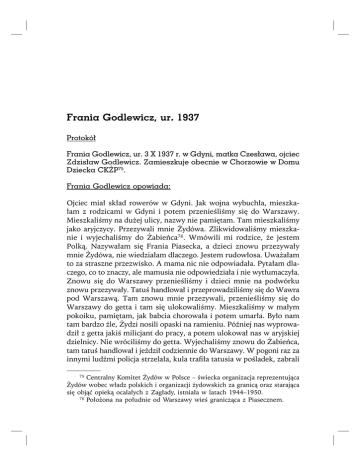 Frania Godlewicz, ur. 1937 Protokół Frania Godlewicz, ur. 3 X 1937 r. w Gdyni, matka Czesława, ojciec Zdzisław Godlewicz. Zamieszkuje obecnie w Chorzowie w Domu Dziecka CKŻP75. Frania Godlewicz opowiada: Ojciec mia sk ad rowerów w Gdyni. Jak wojna wybuch a, mieszkaam z rodzicami w Gdyni i potem przenie li my si do Warszawy. Mieszkali my na du ej ulicy, nazwy nie pami tam. Tam mieszkali my jako aryjczycy. Przezywali mnie ydówa. Zlikwidowali my mieszkanie i wyjechali my do abie ca76. Wmówili mi rodzice, e jestem Polk . Nazywa am si Frania Piasecka, a dzieci znowu przezywa y mnie ydówa, nie wiedzia am dlaczego. Jestem rudow osa. Uwa a am to za straszne przezwisko. A mama nic nie odpowiada a. Pyta am dlaczego, co to znaczy, ale mamusia nie odpowiedzia a i nie wyt umaczy a. Znowu si do Warszawy przenie li my i dzieci mnie na podwórku znowu przezywa y. Tatu handlowa i przeprowadzili my si do Wawra pod Warszaw . Tam znowu mnie przezywali, przenie li my si do Warszawy do getta i tam si ulokowali my. Mieszkali my w ma ym pokoiku, pami tam, jak babcia chorowa a i potem umar a. By o nam tam bardzo le, ydzi nosili opaski na ramieniu. Pó niej nas wyprowadzi z getta jaki milicjant do pracy, a potem ulokowa nas w aryjskiej dzielnicy. Nie wrócili my do getta. Wyjechali my znowu do abie ca, tam tatu handlowa i je dzi codziennie do Warszawy. W pogoni raz za innymi lud mi policja strzela a, kula trafi a tatusia w po ladek, zabrali Centralny Komitet ydów w Polsce – wiecka organizacja reprezentuj ca ydów wobec w adz polskich i organizacji ydowskich za granic oraz staraj ca si obj opiek ocala ych z Zag ady, istnia a w latach 1944–1950. 76 Po o ona na po udnie od Warszawy wie granicz ca z Piasecznem. 75 108 Relacje go do szpitala do Dzieci tka Jezus. Mamusia pojecha a do tatusia, a mnie zostawi a u s siadów, mówi a, e za par dni wróci z powrotem. Kilka tygodni up yn o, nie wraca a. A tatu wróci ze szpitala jeszcze chory i obieca , e b dzie ka dego tygodnia do nas przyje d a . Trwa o to tak par miesi cy, nie pami tam jak d ugo, i nagle przesta przyje d a . Wyczekiwa am ci gle, ale tatu nie przyje d a . Ciocia przysy a a paczki ywno ciowe przez pani Orzechowsk , która sobie po ow z tego bra a po drodze. Pani Braniecka z abie ca nie chcia a mnie d u ej trzyma i Orzechowska zabra a mnie do siebie do Warszawy. Mieszka a w suterenie. Nie wolno mi by o do okna dochodzi , nie wiedzia am dlaczego. G odna nie by am, bo ciocia posy a a paczki ywno ciowe, nie bi a mnie, bo pani, która tam te mieszka a, nie pozwala a. Raz pani Orzechowska powiedzia a mi, e mnie do wujka odprowadzi. Wujek czeka na mnie przy tramwaju, zawióz mnie do ochronki, tam dali mi metryk i jedna pani zabra a mnie do siebie do domu na ul. Grochowsk 77. Nazywa a si Doma ska. Mieszka a w pokoiku z kuchni ze swoj córk Lil . Tam by o mi swobodnie, wolno mi by o si bawi na podwórku. Ciocia za moje utrzymanie p aci a. By am tam przesz o rok, a do powstania bez zmian. Podczas powstania strasznie si Niemców ba am, z apali nas i trzymali par godzin. Potem na dworzec pos ali, a potem nas na lotnisko pop dzili. Byli my tam kilka dni, zap dzili nas do Pruszkowa78 i w par dni pó niej do lasu. Osiedlili my si u jakich wie niaków razem z Lil . Po oswobodzeniu pojecha a Lila do Warszawy, znalaz a tam moj ciotk i powiedzia a jej, e ja yj . Do Warszawy wrócili my w lecie w 1945 roku. Dom nasz by zburzony, zamieszkali my w innym mieszkaniu, na wpó zburzonym. By o ju par miesi cy po oswobodzeniu. Nie wiedzia am, e jestem ydówk . Wujek zacz pani Doma sk odwiedza , lecz ja go nie widzia am. Chcia mnie do siebie zabra , lecz pani Doma ska polubi a mnie bardzo i za adn cen nie chcia a odda z powrotem. Lila mnie pie ci a, uczy a, wychowywa a i ja j bardzo kocha am. Pani Doma ska powiedzia a mi, e jestem ydówk , p aka am bardzo, gdy nie chcia am ni by , by nie pój do piek a. Wiedzia am o tym, e by ydem to jest co z ego, co brzydkiego. W oryginale Grocholska. Do nazistowskiego obozu przej ciowego dla ludno ci cywilnej wysiedlonej z Warszawy po upadku powstania warszawskiego. 77 78 Frania Godlewicz 109 Wiedzia am o tym, e Niemcy ydów tropili i zabijali. Wujek raz przyszed i ja wtedy by am w domu sama, obieca mi, e mnie wychrzci, e b d pisa do Lili, e mi u niego b dzie dobrze. Prosi , bym do niego wróci a. Zostawi pani Doma skiej 17 tysi cy z otych, bo wi cej nie posiada , i zabra mnie ze sob do Chorzowa. Umie ci mnie wpierw u cioci, a potem w Domu Dziecka, gdzie przebywam dotychczas. Wyt umaczyli mi powoli, e to nie jest prawd , co mi o ydach powiedzieli, e ydem by , to nie jest okropne i e nie id do piek a. Protokołowała: (–) Janina Sobol-Masłowska Masłowska Podpis: (–) Frania Godlewicz Chorzów, dn. 28 VIII 1947 r. A IH, 301/2747, mps, 3 s., j z. pol. Lea Goldberg, ur. 1929 Lea (Leje) Lola (Liolie) Goldberg urodzona w 1929 roku w Rafałówce79 ojciec: Eli, matka: Golda-Miriam (Golde-Miriem) obecnie zamieszkała: Bytom, Chrobrego 8 Mieszka am w Rafa ówce z rodze stwem i mam . Gdy ci mordercy, Niemcy, zaj li nasze miasto i ich zobaczy am, powtarza am mamie: „Nie mog na nich patrze . Chc y , jestem m oda, nie mog patrze , jak niemieccy mordercy b d nas m czy , musz to prze y i zem ci si na tych bandytach”. Tak przeszed ca y rok w trudach, g odzie i poni eniu… Nagle, pewnego pi knego letniego dnia pojawili si esesmani i okr yli miasto, i wszyscy zbierali si na mier . Mia am wtedy dwana cie lat. Podchodz do mamy i mówi : „Mamuniu, chod my st d, uciekajmy. Nie id my jak owce prowadzone na rze ”. Ca uj matk : „Chc y , uciekajmy, uciekajmy!”. Zaczynam p aka . Mama spogl da na mnie i mówi: „Dziecko drogie, chcesz y , ale wszyscy razem nie mo emy si uratowa , id i czekaj na mnie przy ko ciele”. Da am si przekona i oddali am si w stron ko cio a, i czeka am na mam . Czeka am jeden dzie , ale niestety nikt nie przyszed . Jestem sama… Jestem nieszcz liwa… Moja sytuacja jest bardzo ci ka. Prosz o kawaek chleba, wygania si m