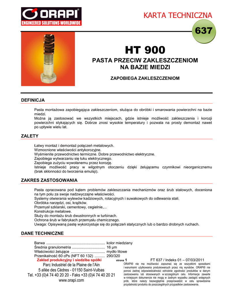 KARTA TECHNICZNA 637 HT 900 PASTA PRZECIW ZAKLESZCZENIOM NA BAZIE MIEDZI ZAPOBIEGA ZAKLESZCZENIOM DEFINICJA Pasta montażowa zapobiegająca zakleszczeniom, służąca do obróbki i smarowania powierzchni na bazie miedzi. Można ją zastosować we wszystkich miejscach, gdzie istnieje możliwość zakleszczenia i korozji powierzchni stykających się. Dobrze znosi wysokie temperatury i pozwala na prosty demontaż nawet po upływie wielu lat. ZALETY Łatwy montaż i demontaż połączeń metalowych. Wzmocnione właściwości antykorozyjne. Wyśmienite przewodnictwo termiczne. Dobre przewodnictwo elektryczne. Zapobiega wytwarzaniu się łuku elektrycznego. Zapobiega zużyciu wywołanemu przez korozję. Istnieje możliwość pracy w wilgotnym otoczeniu dzięki żelującemu czynnikowi nieorganicznemu (brak skłonności do tworzenia emulsji). ZAKRES ZASTOSOWANIA Pasta opracowana pod kątem problemów zakleszczania mechanizmów oraz śrub stalowych, doceniona na tym polu za swoje nadzwyczajne właściwości. Systemy otwierania wylewów kadziowych, rotacyjnych i suwakowych do odlewania stali. Obróbka narzędzi, osi, krążków. Przemysł szklarski, cementowy, cegielnie,... Konstrukcje metalowe. Służy do montażu śrub dwustronnych w turbinach. Ochrona śrub w fabrykach przemysłu chemicznego. Uwaga: Opisywaną pastę wykorzystuje się do połączeń statycznych lub o bardzo drobnych ruchach. DANE TECHNICZNE Barwa ......................................................... Średnia granulometria ................................ Właściwości żelujące ................................. Przenikalność 60 cPs (NFT 60 132) .......... Zakład produkcyjny i siedziba spółki kolor miedziany 16 µm mydło litowe 290/320 strona 1 Parc Industriel de la Plaine de l’Ain 5 allée des Cèdres - 01150 Saint-Vulbas Tel. +33 (0)4 74 40 20 20 - Faks +33 (0)4 74 40 20 21 www.orapi.com FT 637 / Indeks 01 – 07/03/2011 ORAPI® nie ma możliwości zapoznać się ze wszystkimi sposobami i warunkami użytkowania produkowanych przez nią wyrobów. ORAPI® nie ponosi żadnej odpowiedzialności odnośnie zgodności produktów w danym zastosowaniu lub stosowanych w szczególnym celu. Informacje zawarte w niniejszym dokumencie nie mogą w żadnym wypadku zastąpić wstępnych prób, które należy bezwzględnie przeprowadzić w celu sprawdzenia przydatności produktu do poszczególnych przypadków zastosowania. KARTA TECHNICZNA Stopień NLGI .............................................. 1 Zakład produkcyjny i siedziba spółki Parc Industriel de la Plaine de l’Ain 5 allée des Cèdres - 01150 Saint-Vulbas Tel. +33 (0)4 74 40 20 20 - Faks +33 (0)4 74 40 20 21 www.orapi.com strona 2 FT 637 / Indeks 01 – 07/03/2011 ORAPI® nie ma możliwości zapoznać się ze wszystkimi sposobami i warunkami użytkowania produkowanych przez nią wyrobów. ORAPI® nie ponosi żadnej odpowiedzialności odnośnie zgodności produktów w danym zastosowaniu lub stosowanych w szczególnym celu. Informacje zawarte w niniejszym dokumencie nie mogą w żadnym wypadku zastąpić wstępnych prób, które należy bezwzględnie przeprowadzić w celu sprawdzenia przydatności produktu do poszczególnych przypadków zastosowania. KARTA TECHNICZNA DANE TECHNICZNE – ciąg dalszy Rodzaj wypełniacza ................................... Zakres temperatur ...................................... Przewodnictwo dielektryczne ..................... Klasyfikacja HMIS Ocena (H-F-R) ............. miedź o strukturze płytkowej, czysta, rozpylona -40 do +1100°C( smarowanie suche) 8 -1 -1 0.825.10 m 0-0-1 SPOSÓB UŻYCIA Stosować wyłącznie w przypadku bardzo powolnych ruchów/niskich obrotów, w otoczeniach korozyjnych i w wysokich temperaturach. Umyć uprzednio części, na które ma być naniesiony produkt, nie mieszać z innymi pastami. Nanieść cienkie warstwy na odpowiednie powierzchnie przed ich montażem. OPAKOWANIA Tuba 200 g Pudełko 1 kg Kubełek 5 kg Beczka 200 kg nr katalogowy 3637 T4 nr katalogowy 3637 B7 nr katalogowy 3637 S1 nr katalogowy 3637 U2 Zakład produkcyjny i siedziba spółki Parc Industriel de la Plaine de l’Ain 5 allée des Cèdres - 01150 Saint-Vulbas Tel. +33 (0)4 74 40 20 20 - Faks +33 (0)4 74 40 20 21 www.orapi.com x 12 x6 x1 x1 strona 3 FT 637 / Indeks 01 – 07/03/2011 ORAPI® nie ma możliwości zapoznać się ze wszystkimi sposobami i warunkami użytkowania produkowanych przez nią wyrobów. ORAPI® nie ponosi żadnej odpowiedzialności odnośnie zgodności produktów w danym zastosowaniu lub stosowanych w szczególnym celu. Informacje zawarte w niniejszym dokumencie nie mogą w żadnym wypadku zastąpić wstępnych prób, które należy bezwzględnie przeprowadzić w celu sprawdzenia przydatności produktu do poszczególnych przypadków zastosowania.