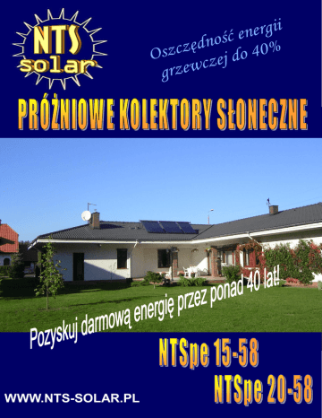 i i g r e n e ć ś o n d ę z % c 0 z 4 s o O d j e z c w e z gr WWW.NTS-SOLAR.PL PRÓŻNIOWE KOLEKTORY SŁONECZNE - CO NAS WYRÓŻNIA 1. Izolacja szyny zbiorczej - wysoka izolacyjność i wytrzymałość na wysokie temperatury Szyna zbiorcza kolektorów próżniowych NTS SOLAR zamknięta jest w profilu aluminiowym pasywowanym odpornym na działanie czynników atmosferycznych (słonce, deszcz, wiatr itd.). Izolacja szyny zbiorczej składa się dwóch warstw izolacyjnych: a). warstwy wełny mineralnej b). warstwy pianki poliuretanowej Warstwa wełny mineralnej izoluje i chroni warstwę pianki poliuretanowej przed wysokimi temperaturami podczas przegrzewu kolektora. Warstwa pianki poliuretanowej izoluje (mniejszy współczynnik przenikania ciepła niż w przypadku wełny mineralnej) oraz uszczelnia wnętrze profilu aluminiowego chroniąc szynę zbiorcza przed zamakaniem oraz zamyka mostki ciepła powstające przy zastosowaniu tylko wełny mineralnej. 2. Konstrukcja szyny zbiorczej - wytrzymałość i długowieczność Elementy szyny zbiorczej wykonane są technika toczenia. Rezultatem tak wykonanej szyny zbiorczej jest mniejsza ilość spawów a co za tym idzie dłuższa jej żywotność oraz wytrzymałość na obciążenia mechaniczne powstające podczas silnych wiatrów miedzy rurociągiem a szyna zbiorcza kolektora. 3. Konstrukcja ciepłowodu - długowieczność bez utraty sprawności Ciepłowód w kolektorach NTS SOLAR został opracowany przez kadrę inżynierską. Miedź użyta do produkcji ciepłowodów jest w pierwszej kolejności odtleniana a następnie odtłuszczana w procesach chemicznych. Miedź użyta do produkcji rurek ciepła jest również zabezpieczana przed przedostawaniem się gazów niekondensujących z atmosfery do wnętrza ciepłowodu. Powyższe etapy produkcji ciepłowodu pozwalają uzyskać urządzenie długowieczne i niepodlegające degradacji w długim okresie czasu. Żywotność tak wykonanego ciepłowodu została potwierdzona w badaniach i wynosi: 129267 godzin bez utraty sprawności. Przyjmując, że kolektor słoneczny pracuje przez 8 godzin dziennie średniorocznie otrzymujemy 45 lat pracy ciepłowodu bez utraty sprawności. Płyn przenoszący ciepło w ciepłowodzie opracowany został przez kadrę inżynierską. Dzięki temu nasz ciepłowód charakteryzuje się odpornością na zamarzanie (do -40°C) oraz zwiększona szybkością w przenoszeniu ciepła. Potwierdzają to badania sprawności kolektora przeprowadzone na naszym stanowisku badawczym do badania sprawności kolektorów słonecznych. 4. Profil aluminiowy przenoszący ciepło z rury próżniowej do ciepłowodu - transport ciepła bez strat W celu zapewnienia transportu ciepła z całej powierzchni rury próżniowej opracowaliśmy profil aluminiowy ściśle przylegający do wnętrza rury próżniowej. Profil ten obejmuje wnętrze rury próżniowej na całej jej długości i płaszczyźnie wnętrza rury próżniowej. Profil wykonany jest w całości z jednego elementu przyczyniając się do szybkiego przekazywania ciepła do ciepłowodu nie powodując jednocześnie strat ciepła. 5. Konstrukcja luster - lustra z demontowalnym charakterem Lustra zwiększające powierzchnie apertury i absorpcyjną kolektora próżniowego dołączamy gratisowo do każdego kolektora. Matematycznie obliczony kształt luster pozwala na 100% odbicie promieni słonecznych na powierzchnie absorbera rury próżniowej. Zastosowanie luster pozwala na zwiększenie wydajności całkowitej kolektora próżniowego o równowartość zwiększonej powierzchni apertury czy absorbera kolektora próżniowego. Demontowalny charakter konstrukcji luster pozwala na ich szybki i łatwy demontaż przed okresem zimowym i unikniecie odkładania się śniegu na kolektorze. Lustra można też łatwo i szybko zamontować wiosną zwiększając w ten sposób całkowity uzysk z instalacji kolektorów słonecznych. 6. Konstrukcja rury prózniowej - 4 warstwowy absorber NTS SOLAR Rury próżniowe zastosowane w naszych kolektorach słonecznych są o 10% sprawniejsze od rur próżniowych z 2 warstwowym absorberem. Zastosowanie warstw selektywnych pozwala na przekształcenie min. 95% energii promieniowania słonecznego w energie cieplna, co za tym idzie zwiększenia wydajności całkowitej kolektora słonecznego. Absorber 4 warstwowy NTS SOLAR odporny jest na działanie wysokich temperatur (300 C), które występują we wnętrzu rury próżniowej podczas przegrzewu kolektora. Warstwa absorpcyjna nie podlega degradacji w tak wysokich temperaturach i nie wytwarza gazów niekondensujących powodujących rozszczelnianie rur w rurach 2 warstwowych. Zastosowanie różnych warstw z jednej strony przyspiesza przekazywanie ciepła do wnętrza rury próżniowej a z drugiej strony nie pozwala promieniowaniu podczerwonemu na wydostanie sie z jej wnętrza. Rurę 2 warstwowa można łatwo rozpoznać ponieważ ma ona kolor srebrno-szary od środka. Rura próżniowa NTS SOLAR ma kolor czerwono-ceglasty od środka. Rura próżniowa z absorberm 4 warstwowym Warstwa absorpcyjna niklowo-tytanowa Wnętrze rury próżniowej Warstwa selektywna Kompozyt wielo metaliczny Warstwa absorpcji promieniowania podczerwonego - miedż Warstwa refleksyjna Stal nierdzewna Wysoka absorpcja - Wysoka temperatura - Niskie straty ciepła - Wysoka sprawność DANE TECHNICZNE NTSpe 15-58 - Ilość rur próżniowych: 15 szt. - Średnica zewnętrzna rur próżniowych: 58 mm - Wymiary kolektora: 1990x1195 mm - Powierzchnia brutto: 2,370 m2 - Powierzchnia apertury: 1,415 m2 - Powierzchnia absorbera z lustrami: 1,920 m2 - Powierzchnia całkowita absorbera: 3,75 m2 - Sprawność bez luster: 0,795 = 79,5% - Sprawność absorbera: 0,95 = 95% - Zakres przepływu: 120 – 600 l/h; zalecane 120 l/h - Maksymalna temperatura pracy: do 300°C - Temperatura parowania płynu w rurce ciepła: 10°C - Max ciśnienie w rurce ciepła: 15 bar (po całkowitym odparowaniu płynu) - Grubość hartowanego szkła: 1,6 mm - Wag