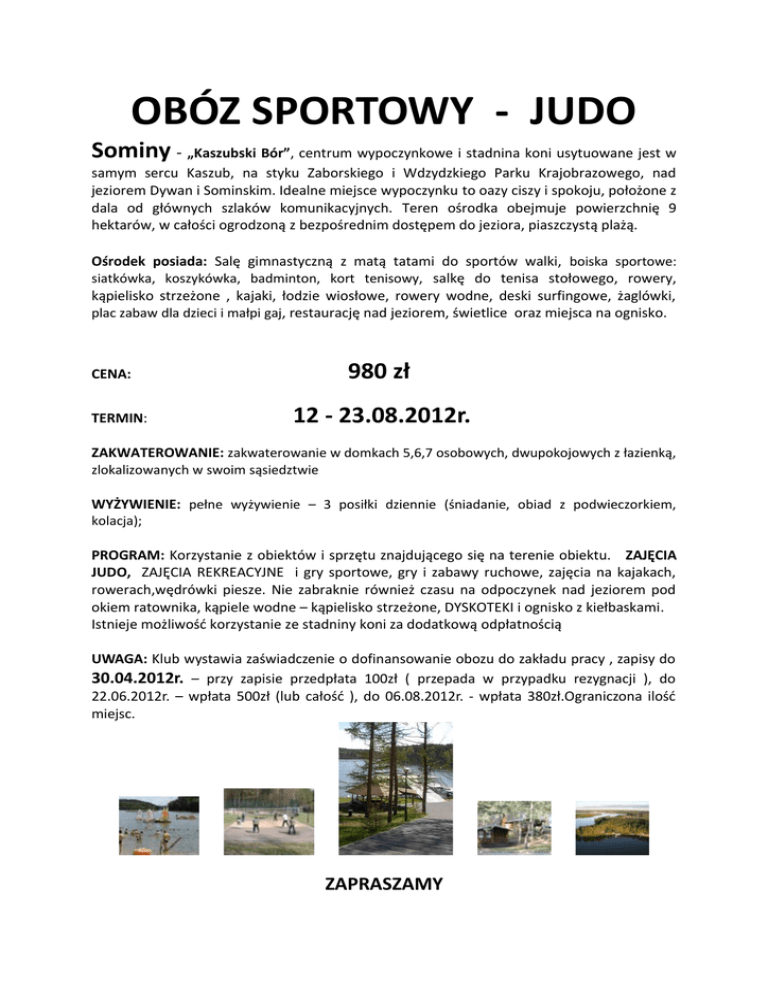 OBÓZ SPORTOWY - JUDO Sominy - „Kaszubski Bór”, centrum wypoczynkowe i stadnina koni usytuowane jest w samym sercu Kaszub, na styku Zaborskiego i Wdzydzkiego Parku Krajobrazowego, nad jeziorem Dywan i Sominskim. Idealne miejsce wypoczynku to oazy ciszy i spokoju, położone z dala od głównych szlaków komunikacyjnych. Teren ośrodka obejmuje powierzchnię 9 hektarów, w całości ogrodzoną z bezpośrednim dostępem do jeziora, piaszczystą plażą. Ośrodek posiada: Salę gimnastyczną z matą tatami do sportów walki, boiska sportowe: siatkówka, koszykówka, badminton, kort tenisowy, salkę do tenisa stołowego, rowery, kąpielisko strzeżone , kajaki, łodzie wiosłowe, rowery wodne, deski surfingowe, żaglówki, plac zabaw dla dzieci i małpi gaj, restaurację nad jeziorem, świetlice oraz miejsca na ognisko. CENA: TERMIN: 980 zł 12 - 23.08.2012r. ZAKWATEROWANIE: zakwaterowanie w domkach 5,6,7 osobowych, dwupokojowych z łazienką, zlokalizowanych w swoim sąsiedztwie WYŻYWIENIE: pełne wyżywienie – 3 posiłki dziennie (śniadanie, obiad z podwieczorkiem, kolacja); PROGRAM: Korzystanie z obiektów i sprzętu znajdującego się na terenie obiektu. ZAJĘCIA JUDO, ZAJĘCIA REKREACYJNE i gry sportowe, gry i zabawy ruchowe, zajęcia na kajakach, rowerach,wędrówki piesze. Nie zabraknie również czasu na odpoczynek nad jeziorem pod okiem ratownika, kąpiele wodne – kąpielisko strzeżone, DYSKOTEKI i ognisko z kiełbaskami. Istnieje możliwość korzystanie ze stadniny koni za dodatkową odpłatnością UWAGA: Klub wystawia zaświadczenie o dofinansowanie obozu do zakładu pracy , zapisy do 30.04.2012r. – przy zapisie przedpłata 100zł ( przepada w przypadku rezygnacji ), do 22.06.2012r. – wpłata 500zł (lub całość ), do 06.08.2012r. - wpłata 380zł.Ograniczona ilość miejsc. ZAPRASZAMY