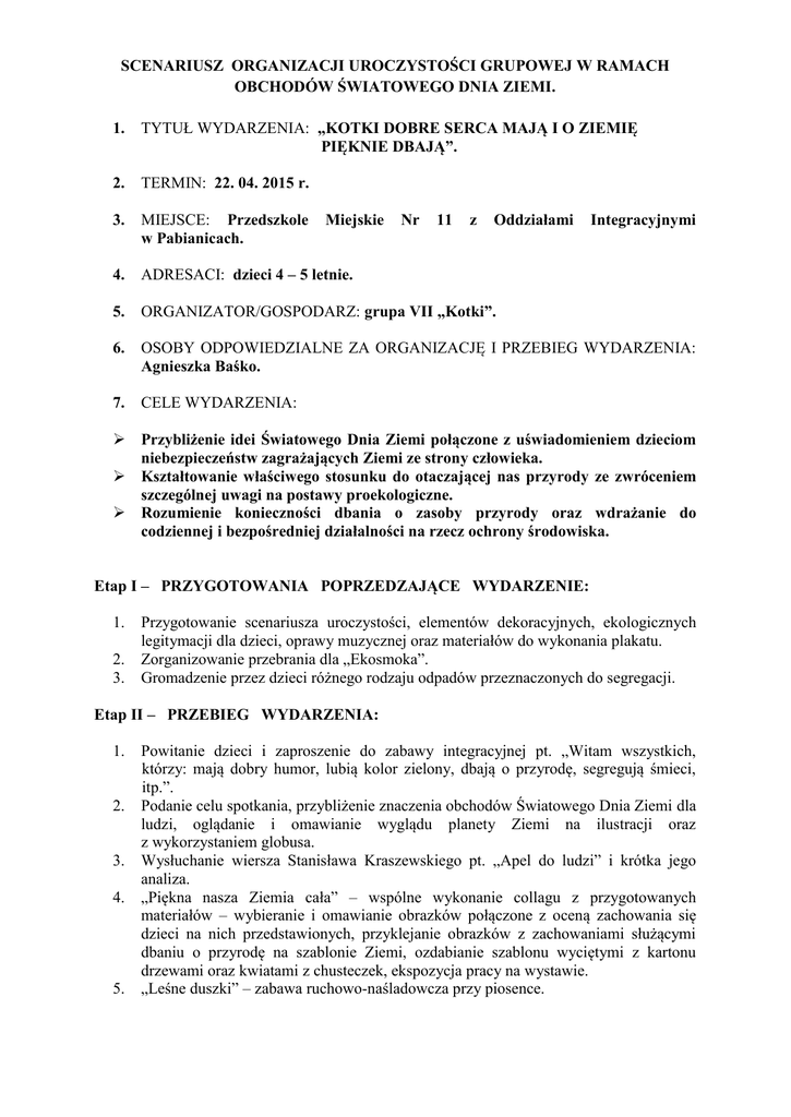 SCENARIUSZ ORGANIZACJI UROCZYSTOŚCI GRUPOWEJ W RAMACH OBCHODÓW ŚWIATOWEGO DNIA ZIEMI. 1. TYTUŁ WYDARZENIA: „KOTKI DOBRE SERCA MAJĄ I O ZIEMIĘ PIĘKNIE DBAJĄ”. 2. TERMIN: 22. 04. 2015 r. 3. MIEJSCE: Przedszkole w Pabianicach. 4. ADRESACI: dzieci 4 – 5 letnie. 5. ORGANIZATOR/GOSPODARZ: grupa VII „Kotki”. 6. OSOBY ODPOWIEDZIALNE ZA ORGANIZACJĘ I PRZEBIEG WYDARZENIA: Agnieszka Baśko. 7. CELE WYDARZENIA: Miejskie Nr 11 z Oddziałami Integracyjnymi Przybliżenie idei Światowego Dnia Ziemi połączone z uświadomieniem dzieciom niebezpieczeństw zagrażających Ziemi ze strony człowieka. Kształtowanie właściwego stosunku do otaczającej nas przyrody ze zwróceniem szczególnej uwagi na postawy proekologiczne. Rozumienie konieczności dbania o zasoby przyrody oraz wdrażanie do codziennej i bezpośredniej działalności na rzecz ochrony środowiska. Etap I – PRZYGOTOWANIA POPRZEDZAJĄCE WYDARZENIE: 1. 2. 3. Przygotowanie scenariusza uroczystości, elementów dekoracyjnych, ekologicznych legitymacji dla dzieci, oprawy muzycznej oraz materiałów do wykonania plakatu. Zorganizowanie przebrania dla „Ekosmoka”. Gromadzenie przez dzieci różnego rodzaju odpadów przeznaczonych do segregacji. Etap II – PRZEBIEG WYDARZENIA: 1. 2. 3. 4. 5. Powitanie dzieci i zaproszenie do zabawy integracyjnej pt. „Witam wszystkich, którzy: mają dobry humor, lubią kolor zielony, dbają o przyrodę, segregują śmieci, itp.”. Podanie celu spotkania, przybliżenie znaczenia obchodów Światowego Dnia Ziemi dla ludzi, oglądanie i omawianie wyglądu planety Ziemi na ilustracji oraz z wykorzystaniem globusa. Wysłuchanie wiersza Stanisława Kraszewskiego pt. „Apel do ludzi” i krótka jego analiza. „Piękna nasza Ziemia cała” – wspólne wykonanie collagu z przygotowanych materiałów – wybieranie i omawianie obrazków połączone z oceną zachowania się dzieci na nich przedstawionych, przyklejanie obrazków z zachowaniami służącymi dbaniu o przyrodę na szablonie Ziemi, ozdabianie szablonu wyciętymi z kartonu drzewami oraz kwiatami z chusteczek, ekspozycja pracy na wystawie. „Leśne duszki” – zabawa ruchowo-naśladowcza przy piosence. 6. 7. 8. „Dobre rady na odpady” – zabawa dydaktyczna, wyszukiwanie przy muzyce poukrywanych w różnych miejscach w klasie odpadów, nazywanie ich, określanie, z jakiego materiału są wyprodukowane (szkło, papier, plastik, metal), segregowanie odpadów do przygotowanych obręczy hula-hop we wskazanym kolorze (szkło kolorowe – zielone, szkło bezbarwne – białe, papier – niebieskie, plastik – żółte, metal – czerwone), wyjaśnienie dzieciom znaczenia segregowania odpadów oraz zjawiska recyklingu. Pasowanie na „Przyjaciela przyrody” – odczytanie Kodeksu Małego Ekologa i uroczyste składanie przysięgi przed „Ekosmokiem” poprzez wypowiadanie słów przysięgi: Przyjacielem przyrody chcę być i w czystym środowisku chcę żyć. Wręczenie legitymacji opiekuna przyrody i nagodzenie dzieci brawami. Podziękowanie za udział w zajęciach, zachęcanie do propagowania zachowań ekologicznych w środowisku rodzinnym. Pabianice, dn. 22. 04. 2015 r. O p r a c o w a n i e: Agnieszka Baśko „APEL DO LUDZI” - Karaszewski Stanisław Gdy się do życia wiosną świat budzi, przyroda pisze apel do ludzi: - To my, rośliny! - To my, zwierzęta! O naszym zdrowiu nikt nie pamięta? Trujące ścieki, trujące dymy, bez tlenu rzeki... ...My się dusimy! A gdy umrzemy w trującym brudzie, na martwej ziemi zginą też ludzie! Chcemy żyć z wami w zgodzie, przyjaźni, niechaj nie zabraknie wam wyobraźni! Tęczowy motyl nad łąką lata, pająk misternie sieć swą uplata. Patrzcie, jak pięknie w lesie, w ogrodzie! Ile jest życia w ziemi i w wodzie! I ty, Dzieciaku, oszczędzaj wodę, nie niszcz i nie śmieć. DBAJ O PRZYRODĘ!