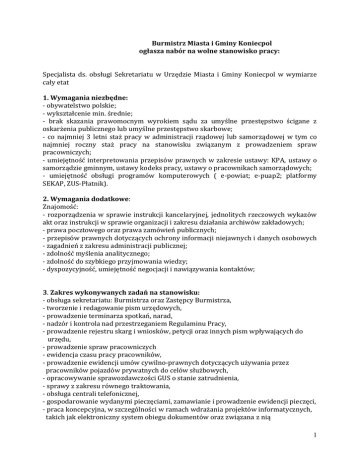 Burmistrz Miasta i Gminy Koniecpol ogłasza nabór na wolne stanowisko pracy: Specjalista ds. obsługi Sekretariatu w Urzędzie Miasta i Gminy Koniecpol w wymiarze cały etat 1. Wymagania niezbędne: - obywatelstwo polskie; - wykształcenie min. średnie; - brak skazania prawomocnym wyrokiem sądu za umyślne przestępstwo ścigane z oskarżenia publicznego lub umyślne przestępstwo skarbowe; - co najmniej 3 letni staż pracy w administracji rządowej lub samorządowej w tym co najmniej roczny staż pracy na stanowisku związanym z prowadzeniem spraw pracowniczych; - umiejętność interpretowania przepisów prawnych w zakresie ustawy: KPA, ustawy o samorządzie gminnym, ustawy kodeks pracy, ustawy o pracownikach samorządowych; - umiejętność obsługi programów komputerowych ( e-powiat; e-puap2; platformy SEKAP, ZUS-Płatnik). 2. Wymagania dodatkowe: Znajomość: - rozporządzenia w sprawie instrukcji kancelaryjnej, jednolitych rzeczowych wykazów akt oraz instrukcji w sprawie organizacji i zakresu działania archiwów zakładowych; - prawa pocztowego oraz prawa zamówień publicznych; - przepisów prawnych dotyczących ochrony informacji niejawnych i danych osobowych - zagadnień z zakresu administracji publicznej; - zdolność myślenia analitycznego; - zdolność do szybkiego przyjmowania wiedzy; - dyspozycyjność, umiejętność negocjacji i nawiązywania kontaktów; 3. Zakres wykonywanych zadań na stanowisku: - obsługa sekretariatu: Burmistrza oraz Zastępcy Burmistrza, - tworzenie i redagowanie pism urzędowych, - prowadzenie terminarza spotkań, narad, - nadzór i kontrola nad przestrzeganiem Regulaminu Pracy, - prowadzenie rejestru skarg i wniosków, petycji oraz innych pism wpływających do urzędu, - prowadzenie spraw pracowniczych - ewidencja czasu pracy pracowników, - prowadzenie ewidencji umów cywilno-prawnych dotyczących używania przez pracowników pojazdów prywatnych do celów służbowych, - opracowywanie sprawozdawczości GUS o stanie zatrudnienia, - sprawy z zakresu równego traktowania, - obsługa centrali telefonicznej, - gospodarowanie wydanymi pieczęciami, zamawianie i prowadzenie ewidencji pieczęci, - praca koncepcyjna, w szczególności w ramach wdrażania projektów informatycznych, takich jak elektroniczny system obiegu dokumentów oraz związana z nią 1 dokumentacja, w tym wewnętrznymi aktami normatywnymi, - obsługa programów informatycznych ( e-powiat, e-puap2, platforma SEKAP, EXEL, WORD, ZUS -Płatnik), - obsługa urządzeń biurowych, - obsługa skrzynki e-mailowej Urzędu Miasta i Gminy Koniecpol. 4. Wymagane dokumenty: - list motywacyjny; - CV; - kserokopie dokumentów poświadczających wykształcenie; - kserokopie innych dodatkowych dokumentów o posiadanych kwalifikacjach; - oświadczenie o niekaralności; - kserokopia dokumentów poświadczających staż pracy; - oświadczenie o braku przeciwwskazań na zajmowanie danego stanowiska pracy 5. Wymagane dokumenty aplikacyjne: list motywacyjny i CV powinny być opatrzone klauzulą: "Wyrażam zgodę na przetwarzanie moich danych osobowych zawartych w ofercie pracy dla potrzeb niezbędnych do realizacji procesu rekrutacji zgodnie z ustawą z dnia 29 sierpnia 1997 r. o ochronie danych osobowych / Dz. U. z 2014r. poz.1182 z późn. zm. oraz ustawą z dnia 21 listopada 2008 r. 1':o pracownikach samorządowych / Dz. U. z 2012r. poz.1202 z późn. zm. " 6. Wymagane dokumenty aplikacyjne należy składać w kancelarii Urzędu Miasta i Gminy Koniecpol lub przesłać pocztą w terminie do dnia 15 lutego 2016 roku do godz. 10:00 (decyduje data wpływu dokumentów do Urzędu) na adres: Urząd Miasta i Gminy Koniecpol, 42-230 Koniecpol, ul. Chrząstowska 6 A, w zaklejonych kopertach z dopiskiem: "Dotyczy naboru na stanowisko specjalista ds. obsługi sekretariatu w Urzędzie Miasta i Gminy Koniecpol", Aplikacje, które wpłyną do Urzędu po wyżej określonym terminie nie będą rozpatrywane. 7. Informacja o wyniku naboru będzie umieszczona na stronie internetowej Biuletynu Informacji Publicznej Urzędu Gminy Koniecpol www.koniecpol.pl oraz na tablicy informacyjnej Urzędu Gminy Koniecpol, zgodnie z ustawą z dnia 21 listopada 2008 r. o pracownikach samorządowych Dz. U. z 2008 r. Nr 233, poz. 1458, ze zm. 8. Praca jednozmianowa, w pozycji siedzącej, narzędzia pracy – komputer i sprzęt biurowy, bezpieczne warunki pracy na stanowisku, stanowisko pracy znajduje się w siedzibie Urzędu Miasta i Gminy. W miesiącu poprzedzającym datę upublicznienia ogłoszenia wskaźnik zatrudnienia osób niepełnosprawnych był niższy niż 6%. 2 9.Inne informacje: Komisja powołana przez Burmistrza Miasta i Gminy Koniecpol działa dwuetapowo: I etap - zapoznanie się z dokumentami złożonymi przez kandydatów, ustalenie czy zostały spełnione kryteria określone w ogłoszeniu o naborze oraz ustalenie listy kandydatów dopuszczonych do drugiego etapu postępowania. II etap - przeprowadzenie rozmowy kwalifikacyjnej z kandydatami do pracy. Kandydaci spełniający wymagania formalne zostaną powiadomieni e-mailem lub telefonicznie o terminie rozmowy kwalifikacyjnej. Z wyłonionym w drodze naboru kandydatem do pracy zostanie zawarta umowa o pracę na czas nieokreślony. 3