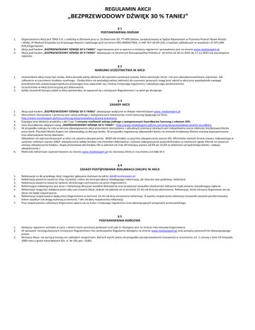 REGULAMIN AKCJI „BEZPRZEWODOWY DŹWIĘK 30 % TANIEJ” §1 POSTANOWIENIA OGÓLNE 1. 2. 3. Organizatorem Akcji jest TERG S.A. z siedzibą w Złotowie przy ul. Za Dworcem 1D, 77-400 Złotów, zarejestrowaną w Sądzie Rejonowym w Poznaniu Poznań Nowe Miasto i Wilda, IX Wydział Gospodarczy Krajowego Rejestru Sądowego pod numerem KRS 0000427063, nr NIP 767-10-04-218, o kapitale zakładowym w wysokości 37.875.000 PLN,(Organizator). Akcja pod hasłem „BEZPRZEWODOWY DŹWIĘK 30 % TANIEJ” organizowana jest w oparciu o niniejszy regulamin i prowadzona jest na stronie www.mediaexpert.pl Akcja pod hasłem „BEZPRZEWODOWY DŹWIĘK 30 % TANIEJ” obowiązuje na terytorium Rzeczpospolitej Polskiej w terminie od 30.11.2015 do 27.12.2015 lub wyczerpania zapasów. §2 WARUNKI UCZESTNICTWA W AKCJI 1. 2. 3. Uczestnikiem Akcji może być osoba, która posiada pełną zdolność do czynności prawnych (osoba, która ukończyła 18 lat i nie jest ubezwłasnowolniona częściowo lub całkowicie w rozumieniu kodeksu cywilnego. Osoby które nie posiadają pełnej zdolności do czynności prawnych mogą brać udział w akcji przy współudziale swojego przedstawiciela ustawowego/opiekuna prawnego) oraz zapoznała się z treścią niniejszego regulaminu i akceptuje jego postanowienia; Uczestnictwo w Akcji promocyjnej jest dobrowolne. Każdy Uczestnik biorący udział w Akcji potwierdza, że zapoznał się z niniejszym Regulaminem i w pełni go akceptuje. §3 ZASADY AKCJI 1. 2. 3. 4. 5. 6. Akcja pod hasłem „BEZPRZEWODOWY DŹWIĘK 30 % TANIEJ” obowiązuje wyłącznie w sklepie internetowym www. mediaexpert.pl Warunkiem skorzystania z promocji jest zakup jednego z wytypowanych telewizorów marki Samsung będącego na liście: http://www.mediaexpert.pl/lista,samsung-bezprzewodowy-dzwiek-telewizory Kupujący przy dodaniu produktu z pkt 2 par 3 otrzyma możliwość zakupu jednego z wytypowanych Soundbarów Samsung z rabatem 30% Lista Soundbarów objętych akcją „BEZPRZEWODOWY DŹWIĘK 30 % TANIEJ”: http://www.mediaexpert.pl/lista,samsung-bezprzewodowy-dzwiek-soundbary W przypadku zakupu na raty w okresie obowiązywania akcji warunkiem skorzystania z aktualnych promocji ratalnych jest indywidualna ocena zdolności kredytowej Klienta przez bank. Placówki Media Expert nie odpowiadają za decyzję banku. W przypadku negatywnej odpowiedzi banku na wniosek kredytowy Klienta zostaną zaproponowane inne alternatywne formy płatności. (Wysokość rat zaprezentowanych w akcji nie zawiera ubezpieczenia. RRSO dla kredytu w opcji bez ubezpieczenia wynosi 0%. Minimalna wartość brutto towaru nabywanego w systemie ratalnym wynosi 100zł. Ubezpieczenie spłaty kredytu ma charakter dobrowolny i stanowi zabezpieczenie pożyczki/kredytu w momencie zgody Klienta na zawarcie umowy ubezpieczenia kredytu. Stopa procentowa dla kredytu 0% w zakresie od 3 do 40 miesięcy wynosi od 0% do 32,6% w zależności od wybranego banku i rodzaju ubezpieczenia.) Materiały reklamowe zaprezentowane na stronie www.mediaexpert.pl nie stanowią oferty w rozumieniu art.66§ 1K.C §4 ZASADY POSTĘPOWANIA REKLAMACJI ZAKUPU W AKCJI 1. 2. 3. 4. 5. 6. 7. Reklamacje co do przebiegu Akcji mogą być zgłaszane mailowo na adres [email protected]. Reklamacja powinna zawierać imię, nazwisko i adres do korespondencji składającego reklamację, jak również opis podstawy reklamacji. Reklamacja powinna zawierać żądanie określonego zachowania się przez Organizatora. Reklamujący zobowiązany jest wraz z reklamacją doręczyć wszelkie dokumenty oraz przytoczyć wszystkie okoliczności faktyczne bądź prawne uzasadniające żądanie. Reklamacje mogą być składane przez cały czas trwania Akcjii, jednak nie później niż w terminie 21 dni od dnia jej zakończenia. Reklamacje, które otrzyma Organizator po tej dacie nie będą rozpatrywane. Reklamacje rozpatrywane będą przez Organizatora w terminie 14 dni od dnia otrzymania reklamacji. O wyniku rozpatrzenia reklamacji Uczestnik zostanie poinformowany listem zwykłym lub drogą mailową w terminie 7 dni od daty rozpatrzenia reklamacji. Przy rozpatrywaniu reklamacji Organizator opiera się na treści niniejszego regulaminu oraz obowiązujących przepisach prawa polskiego. §5 POSTANOWIENIA KOŃCOWE 1. 2. 3. Niniejszy regulamin wchodzi w życie z dniem startu promocji podanym w §1 pkt.3 i dostępny jest na stronie internetowej Organizatora. W sprawach nieuregulowanych niniejszym Regulaminem ma zastosowanie Regulamin dostępny na stronie www.mediaexpert.pl oraz przepisy powszechnie obowiązującego prawa. Niniejsza Akcja nie jest grą losową ani zakładem wzajemnym, których wynik zależy od przypadku (przeprowadzenie losowania) w rozumieniu art. 2 ustawy z dnia 19 listopada 2009 roku o grach hazardowych (Dz. U. Nr 201 poz. 1540).