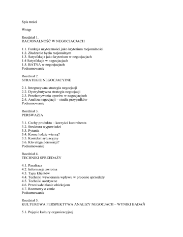 Spis treści Wstęp Rozdział 1. RACJONALNOŚĆ W NEGOCJACJACH 1.1. Funkcja uŜyteczności jako kryterium racjonalności 1.2. Złudzenie bycia racjonalnym 1.3. Satysfakcja jako kryterium w negocjacjach 1.4 Satysfakcja w negocjacjach 1.5. BATNA w negocjacjach Podsumowanie Rozdział 2. STRATEGIE NEGOCJACYJNE 2.1. Integratywna strategia negocjacji 2.2. Dystrybutywna strategia negocjacji 2.3. Przełamywania oporów w negocjacjach 2.4. Analiza negocjacji – studia przypadków Podsumowanie Rozdział 3. PERSWAZJA 3.1. Cechy produktu – korzyści kontrahenta 3.2. Struktura wypowiedzi 3.3. Pytania 3.4. Komu ludzie wierzą? 3.5. Kontekst sytuacyjny 3.6. Kto ulega perswazji? Podsumowanie Rozdział 4. TECHNIKI SPRZEDAśY 4.1. Parafraza 4.2. Informacja zwrotna 4.3. Typy klientów 4.4. Techniki wywierania wpływu w procesie sprzedaŜy 4.5. Techniki asertywne 4.6. Przeciwdziałanie obiekcjom 4.7. Rozmowy o cenie Podsumowanie Rozdział 5. KULTUROWA PERSPEKTYWA ANALIZY NEGOCJACJI – WYNIKI BADAŃ 5.1. Pojęcie kultury organizacyjnej 5.2. Kultura organizacyjna a negocjacje 5.3. Typologia kultury organizacyjnej 5.4. Kultura organizacyjna – wyniki badań 5.5. Cechy kultury biznesu Rozdział 6. TECHNIKI PERSWAZYJNE – WYNIKI BADAŃ 6.1. Pomiędzy ,,kijem a marchewką,, 6.2. Pomiędzy karą a nakazem 6.3. Pomiędzy oświadczeniem normatywnym, pozytywnym a samoprezentacją 6.4. Techniki perswazyjne Polaków na tle innych krajów Podsumowanie – wnioski Rozdział 7. MITY NEGOCJACJI 7.1. Metodologia badań 7.2. Mit I – niezmienna racjonalność 7.3. Mit II - ,,Mierz wysoko, a zajdziesz daleko,,? 7.4. Mit III - ,, Spotkajmy się w pół drogi,, 7.5. Mit IV - ,,Kto pierwszy ten lepszy,,? 7.6. Mit V - ..Łatwiej kupić niŜ sprzedać,,? 7.7. Ledwo dostrzegalna róŜnica Podsumowanie Rozdział 8. NEGOCJACJE Z PERSPEKTYWY KULTURY ORGANIZACYJNEJ 8.1. Negocjacje jako płaszczyzna uczenia się organizacji 8.2. Metodologia badań 8.3. Kulturowy profil organizacji – rekomendacje dla negocjacji Podsumowanie ZAKOŃCZENIE LITERATURA