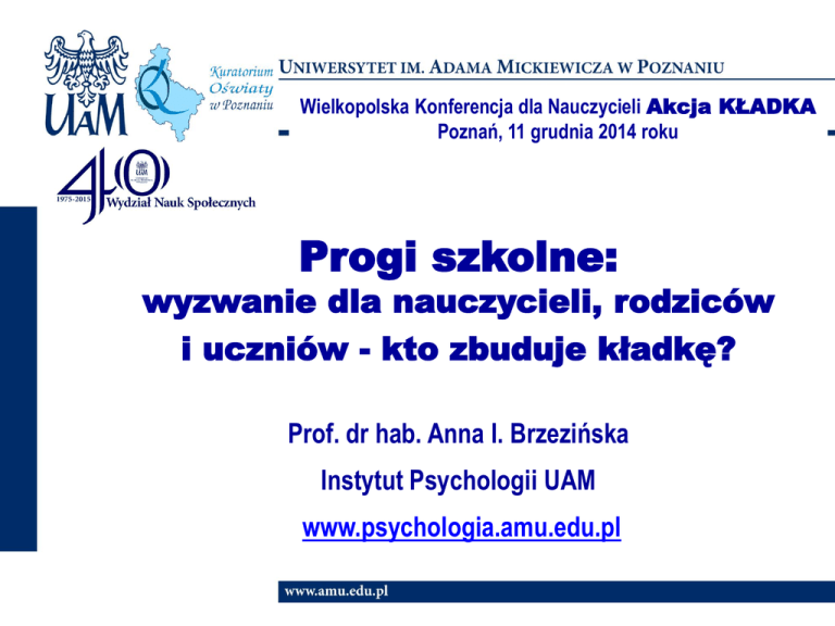 Wielkopolska Konferencja dla Nauczycieli Akcja KŁADKA Poznań, 11 grudnia 2014 roku Progi szkolne: wyzwanie dla nauczycieli, rodziców i uczniów - kto zbuduje kładkę? Prof. dr hab. Anna I. Brzezińska Instytut Psychologii UAM www.psychologia.amu.edu.pl Punkt wyjścia II etap edukacji czyli nauka w kl. 4 - 5 - 6 szkoły podstawowej zbiega się z końcem dzieciństwa i początkiem dorastania Jest to czas na „ostatni dzwonek” czyli na uzupełnienie kompetencji dzieci (wiedza, umiejętności, postawy) nieopanowanych lub nie w pełni opanowanych w poprzednich etapach życia / etapach edukacji w domu i w instytucjach oświatowych Praca w klasach IV V VI to trzy splecione ze sobą 3 nitki: perspektywa przeszłości: wykorzystanie już posiadanych przez uczniów kompetencji i ich uzupełnienie bądź skorygowanie perspektywa teraźniejszości: budowanie nowych kompetencji zgodnie z podstawą programową danego przedmiotu perspektywa przyszłości: budowanie kompetencji umożliwiających pomyślne przejście przez kolejny próg szkolny Współczesne zagrożenia Zmiana stylu życia i aktywności dzieci i młodzieży Z. Kaługa, Epidemiologia nadwagi i otyłości wśród dzieci i młodzieży w Polsce. Centrum Zdrowia Dziecka Choć naturalną potrzebą rozwojową jest „głód ruchu” aktualnie wczesne wygaszanie aktywności fizycznej Choć naturalną potrzebą jest kontakt z innymi ludźmi aktualnie zmniejsza się liczba kontaktów i działań wspólnych Choć naturalną potrzebą dzieci i także dorosłych jest zabawa aktualnie ludzie przestają umieć się bawić w tradycyjny sposób Choć naturalną potrzebą rozwojową jest wymyślanie, tworzenie w działaniu aktualnie bierność dzieci, ich zależność od dorosłych i od przedmiotów/gadżetów Współczesne zagrożenia Dzieciństwo i dorastanie w świecie SPRZECZNOŚCI Nadmiar opieki i kontroli dorosłych przy jednoczesnej samotności braku głębokich, „prawdziwych” relacji z rówieśnikami Oczekiwanie „bycia dorosłym” od dzieci przy jednocześnie małym przyzwoleniu na ich autonomię / samostanowienie Morze możliwości przy jednocześnie braku drogowskazów Cykl rozwojowo-edukacyjny powtarza się w każdym etapie edukacji a edukacja wg koncepcji RAZEM może pomagać w zaspokajaniu potrzeb nauczyciela i ucznia czyli tworzyć warunki do efektywnej edukacji … Etap edukacyjny Etap edukacyjny Próg 2 Etap edukacyjny Próg 1 Próg 0 Uczeń klasy IV Uczeń gimnazjum Jak dzisiaj kształcić dzieci / nastolatki? 1. metody aktywizowania i kształtowania MYŚLENIA TWÓRCZEGO realia: dziś i w przyszłości trzeba rozwiązywać coraz bardziej niestandardowe problemy w różnych perspektywach czasu (teraźniejszość, perspektywa krótko-, średnio- i długofalowa) 2. metody promowania i kształtowania UMIEJĘTNOŚCI WSPÓŁPRACY realia: dziś i w przyszłości trzeba rozwiązywać coraz bardziej złożone problemy typu „cross”, co wymaga „użycia” różnej wiedzy i umiejętności z jednej strony, a z drugiej poczucia kompetencji, zaufania do siebie i innych 3. metody usprawniania i rozwijania KOMUNIKACJI realia: dziś i w przyszłości trzeba rozwiązywać problemy w coraz krótszym czasie, co wymaga szybkiego i sprawnego zdobywania informacji, porozumiewania się i konsultowania z innymi osobami np. z ekspertami Co jest potrzebne, by DOBRZE się uczyć? zadawanie pytań chęć eksplorowania dążenie do eksperymentowania wytrwałość dociekliwość wnikliwość poczucie bezpieczeństwa dobry kontakt emocjonalny wiara we własne siły odwaga w nowych sytuacjach przekonanie, że świat jest bezpieczny i dobry poszukiwanie różnych źródeł informacji zestawianie, porównywanie wymyślanie, proponowanie, projektowanie przekonanie, że świat jest ciekawy i wart poznania przekonanie, że zawsze się znajdzie jakieś rozwiązanie wymiana przedmiotów wspólne zabawy i gry współdziałanie chęć pomagania zwracanie się o pomoc budowanie zespołu liderowanie przekonanie, że na innych ludzi można liczyć (4) Kooperacja (3) Twórcze myślenie (2) Ciekawość (1) Zaufanie do siebie i innych ludzi Nauczyciel jako osoba znacząca jasne reguły czytelna komunikacja dobry kontakt emocjonalny + Zróżnicowane otoczenie bogactwo i optymalne zróżnicowanie uważność na potrzeby dzieci / nastolatków Wyzwania / oferty / zadania Ludzie w różnym wieku pomoc adekwatna do trudności zadania kontaktów społecznych w szkole i poza szkołą + czytelne wymagania + zróżnicowanie