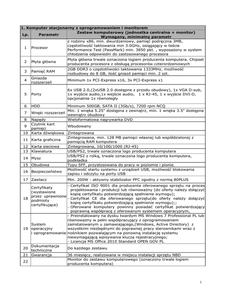 1. Komputer stacjonarny z oprogramowaniem i monitorem Zestaw komputerowy (jednostka centralna + monitor) Lp. Parametr Wymagany, minimalny parametr z rodziny x86, min. dwurdzeniowy, pamięć podręczna 3MB, częstotliwość taktowania min 3.0GHz, osiągający w teście 1 Procesor Performance Test (PassMark) min. 3850 pkt. , wyposaŜony w system chłodzenia odpowiedni do zastosowanego procesora 2 Płyta główna Płyta główna trwale oznaczona logiem producenta komputera. Chipset producenta procesora z obsługą procesorów czterordzeniowych 3 Pamięć RAM 2GB DDR3 o częstotliwości taktowania 1333MHz, moŜliwość rozbudowy do 8 GB, ilość gniazd pamięci min. 2 szt. 4 Gniazda rozszerzeń Minimum 1x PCI-Express x16, 3x PCI-Express x1 5 Porty 6x USB 2.0,(2xUSB 2.0 dostępne z przodu obudowy), 1x VGA D-sub, 1x wyjście audio,1x wejście audio, 1 x RJ-45, 1 x wyjście DVI-D, opcjonalnie 1x równoległy 6 HDD 7 8 9 10 11 12 13 14 15 16 Minimum 500GB, SATA II (3Gb/s), 7200 rpm NCQ Min. 1 wnęka 5.25" dostępna z zewnątrz, min. 1 wnęka 3.5" dostępna Wnęki rozszerzeń wewnątrz obudowy Napędy Wieloformatowa nagrywarka DVD Czytnik kart Wbudowany pamięci Karta dźwiękowa Zintegrowana Zintegrowana, min. 128 MB pamięci własnej lub współdzielonej z Karta graficzna pamięcią RAM komputera Karta sieciowa Zintegrowana, 10/100/1000 (RJ-45) Klawiatura USB/PS2, trwale oznaczona logo producenta komputera USB/PS2 z rolką, trwale oznaczona logo producenta komputera, Mysz podkładka Obudowa Typu SFF, przystosowana do pracy w poziomie i pionie. MoŜliwość startu systemu z urządzeń USB, moŜliwość blokowania Bezpieczeństwo zapisu i odczytu na porty USB 17 Zasilacz 18 19 20 21 22 Min. 200W - aktywny stabilizator PFC zgodny z normą 80PLUS − Certyfikat ISO 9001 dla producenta oferowanego sprzętu na proces Certyfikaty projektowania i produkcji lub równowaŜny (do oferty naleŜy dołączyć (wystawione kopię certyfikatu potwierdzającą spełnienie wymogu); przez uprawnione − Certyfikat CE dla oferowanego sprzętu(do oferty naleŜy dołączyć podmioty kopię certyfikatu potwierdzającą spełnienie wymogu);; certyfikujące) − Oferowane komputery powinny posiadać certyfikat potwierdzający poprawną współpracę z oferowanym systemem operacyjnym, - Preinstalowany na dysku twardym MS Windows 7 Professional PL lub równowaŜny w pełni współpracujący z oprogramowaniem System zainstalowanym u zamawiającego,(Windows, Active Directory) z operacyjny wszystkimi niezbędnymi do poprawnej pracy sterownikami wraz z i oprogramowanie nośnikiem pozwalającym na ponowną instalację systemu niewymagającą wpisywania klucza rejestracyjnego; - Licencja MS Office 2010 Standard OPEN GOV PL Dokumentacja Do kaŜdego zestawu techniczna Gwarancja 36 miesięcy, realizowana w miejscu instalacji sprzętu NBD Monitor do zestawu komputerowego (oznaczony trwale logiem producenta komputera) 1 2. Specyfikacja techniczna monitora komputerowego. Matryca Aktywna TFT-TN Obszar widzialny [mm] Min. 21 cali Rodzaj ekranu Panoramiczny Technologia podświetlania CCFL Plamka matrycy [mm] Czas reakcji matrycy [ms] 0,245 mm 5 ms Rozdzielczość 1920x1080 pikseli Jasność [cd/m2] 300 cd/m2 Kontrast 1000:1 typowy 15000:1 dynamiczny 24-94 kHz Częstotliwość pozioma [KHz] Częstotliwość pionowa [Hz] 50-76 Hz Kąt widzenia poziom 170 stopni Kąt widzenia pion 160 stopni Ilość kolorów [mln] 16,7 miliona Sterowanie OSD Gniazda wejściowe 15-pin D-Sub , DVI-D Pobór mocy [W] Praca/spoczynek Funkcja pivot 38W / 1W MoŜliwość powieszenia na ścianie Zewnętrzne mocowanie VESA: standardowy układ 4 otworów, 100 mm Kolor w nawiązaniu do jednostki centralnej Opcje kontrolne Jasność, kontrast, pozycja, temperatura kolorów, indywidualne ustawienia koloru , wybór wejścia, powrót do ustawień fabrycznych WyposaŜenie Kabel DVI, kabel 15 pin D-sub Gwarancja 36 miesięcy, realizowana w miejscu instalacji sprzętu brak 3. Drukarki laserowe Minimalne parametry techniczne drukarki: Technologia druku Rozdzielczość Szybkość druku ObciąŜenie miesięczne Rozmiar nośnika Pamięć standardowa Laserowa 1200 x 1200 dpi 33 str/min 50 000 str./mies. A4, A5,A6,B5,B6,koperty 128 MB z moŜliwością rozszerzenia 2 Standardowe języki drukarki Druk dwustronny Standardowe połączenia Obsługiwane systemy operacyjne Opcje dodatkowe Gwarancja PCL 6, PCL 5e, Postscript Level 3 emulacja z automatycznym przełączaniem języków Tak, automatyczny Port USB 2.0 , Fast Ethernet LAN 10/100/1000 print server Windows 2000, Windows XP Home , Windows XP Prof., Windows 2003 Server, Vista , Windows 7, Linux Kabel drukarkowy USB 2.0 3m, patchcord kat 5e 3m 36 miesięcy, realizowana w miejscu instalacji sprzętu NBD 4. Drukarki laserowe Minimalne parametry techniczne drukarki: Technologia druku Rozdzielczość Szybkość druku ObciąŜenie miesięczne Rozmiar nośnika Pamięć standardowa Standardowe języki drukarki Druk dwustronny Standardowe połączenia Obsługiwane systemy operacyjne Opcje dodatkowe Gwarancja Laserowa 1200 x 1200 dpi 40 str/min 100 000 str./mies. A4, A5,A6,B5,B6,koperty 128 MB z moŜliwością rozszerzenia PCL 6, PCL 5e, Postscript Level 3 emulacja z automatycznym przełączaniem języków, direct PDF (v 1.4) Tak, automatyczny Port USB 2.0 , Fast Ethernet LAN 10/100 print server Windows 2000, Windows XP Home , Windows XP Prof., Windows 2003 Server, Vista , Windows 7 x64, Linux Kabel drukarkowy USB 2.0 3m, patchcord kat 5e 3m 36 miesięcy, realizowana w miejscu instalacji sprzętu NBD 5. Drukarki atramentowe Minimalne parametry techniczne drukarki: Technologia druku Rozdzielczość Szybkość druku w czerni Szybkość druku Rozmiar nośnika Język drukarki Druk dwustronny Standardowe połączenia Obsługiwane systemy operacyjne Opcje dodatkowe Gwarancja Atramentowa W czerni tryb best: do 1200 x 1200 dpi W kolorze tryb best: do 4800 x 1200 dpi 35 str/min w czerni 35 str/min dla koloru A3+,A3, A4, A5,A6,B5,B6,koperty PCL 3, PC