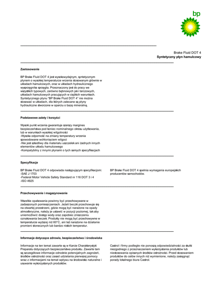 _______________________________________________________________________ Brake Fluid DOT 4 Syntetyczny płyn hamulcowy ________________________________________________________________________________ Zastosowanie BP Brake Fluid DOT 4 jest wysokowydajnym, syntetycznym płynem o wysokiej temperaturze wrzenia stosowanym głównie w układach hamulcowych, oraz w układach hydraulicznego wysprzęgnika sprzęgła. Przeznaczony jest do pracy we wszystkich typowych, zarówno bębnowych jak i tarczowych, układach hamulcowych pracujących w ciężkich warunkach. Syntetycznego płynu “BP Brake Fluid DOT 4” nie można stosować w układach, dla których zalecane są płyny hydrauliczne stworzone w oparciu o bazę mineralną. ________________________________________________________________________________ Podstawowe zalety i korzyści Wysoki punkt wrzenia gwarantuje szerszy margines bezpieczeństwa pod koniec nominalnego okresu użytkowania, lub w warunkach wysokiej wilgotności -Wysoka odporność na zmiany temperatury wrzenia spowodowane wchłonięciem wilgoci -Nie jest szkodliwy dla materiału uszczelek ani żadnych innych elementów układu hamulcowego -Kompatybilny z innymi płynami o tych samych specyfikacjach ________________________________________________________________________________ Specyfikacje BP Brake Fluid DOT 4 odpowiada następującym specyfikacjom: -SAE J 1703 -Federal Motor Vehicle Safety Standard nr 116 DOT 3 i 4 -ISO 4925 BP Brake Fluid DOT 4 spełnia wymagania europejskich producentów samochodów. ________________________________________________________________________________ Przechowywanie i magazynowanie Wszelkie opakowania powinny być przechowywane w zadaszonych pomieszczeniach. Jeżeli beczki przechowuje się na otwartej przestrzeni, gdzie mogą być narażone na opady atmosferyczne, należy je ustawić w pozycji poziomej, tak aby uniemożliwić dostęp wody oraz zapobiec zniszczeniu oznakowania beczek. Produkty nie mogą być przechowywne w temperaturze wyższej niż 60°C, ani też narażone na działanie promieni słonecznych lub bardzo niskich temperatur. ________________________________________________________________________________ Informacje dotyczące zdrowia, bezpieczeństwa i środowiska Informacje na ten temat zawarte są w Karcie Charakterystyki Preparatu dotyczących bezpieczeństwa produktu. Zawarte tam są szczegółowe informacje odnośnie potencjalnych zagrożeń, środków ostrożności oraz zasad udzielania pierwszej pomocy wraz z informacjami na temat wpływu na środowisko naturalne i usuwanie wykorzystanych produktów. Castrol i firmy podległe nie ponoszą odpowiedzialności za skutki niezgodnego z przeznaczeniem wykorzystania produktów lub niestosowania opisanych środków ostrożności. Przed stosowaniem produktów do celów innych niż wymienione, należy zasięgnąć porady lokalnego biura Castrol. ________________________________________________________________________________ Typowa charakterystyka fizykochemiczna ___________________________________________________________________________ Metoda testowa Jednostka Wartość ________________________________________________________________________________ SAE ________________________________________________________________________________ Lepkość kinematyczna przy 100 C FM VSS 116/S 6.3 mm2/S min 1,5 przy 40 C mm2/S max 1450 temperatura wrzenia suchego FM VSS 116/S 6.1 oC min 260 temperatura wrzenia płynu zawodnionego FM VSS 116/S 6.2 oC min 160 wartość PH FM VSS 116/S 6.4 oC 7,0-11,5 stabilność wrzenia FM VSS 116/S 6.5 oC -3-3 stabilność chemiczna FM VSS 116/S 6.5 oC -2-2 zawartość wody - % max 0,2 zawartość oleju mineralnego - % max 0,025 ________________________________________________________________________________ Powyższe wyniki uzyskano z normalnymi tolerancjami procesu produkcyjnego, przez co szczegółowa charakterystyka może od powyższych danych nieznacznie odbiegać. Karta Produktu oraz informacje w niej zawarte są aktualne w momencie jej tworzenia. Użytkownik ma obowiązek uważnie dobierać produkty i używać ich w sposób bezpieczny, w zakresie zalecanym w danych technicznych, przestrzegając stosownych zasad i przepisów. Sprzedawca nie odpowiada za żadne straty ani uszkodzenia wynikłe z wymienionych w danych technicznych zagrożeń związanych z produktami naftowymi (pod warunkiem, że niniejsze zrzeczenie się nie koliduje z jakimikolwiek ustawowymi prawami przysługującymi Kupującym odnośnie tej grupy produktów). Żadne stwierdzenie zamieszczone w tej publikacji nie może być traktowane jako (dane wprost lub zasugerowane) zezwolenie, zalecenie czy też autoryzacja wprowadzania jakichkolwiek innowacji patentowych bez ważnej licencji. Castrol Polska Sp. z o.o. ul. Chłodna 51 00-867 Warszawa Informacja techniczna tel. 022 582 65 00 29/04/2010 ________________________________________________________________________________ Date Created: 28/02/2007 09:18:51 Last Modified:29/04/2010 Date of issue: 28-Feb-2007