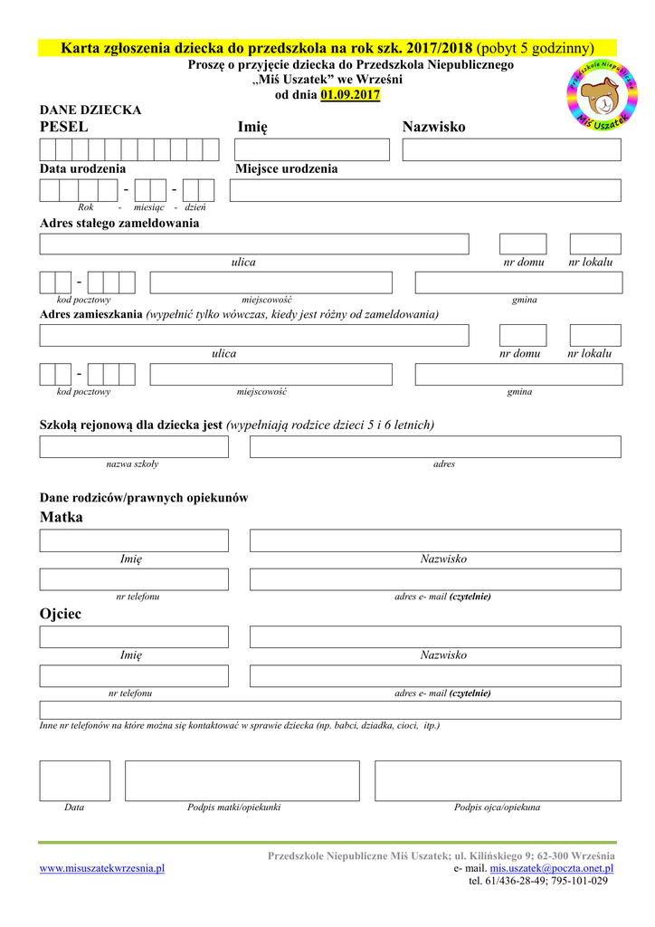 Karta zgłoszenia - Przedszkole Miś Uszatek we Wrześni