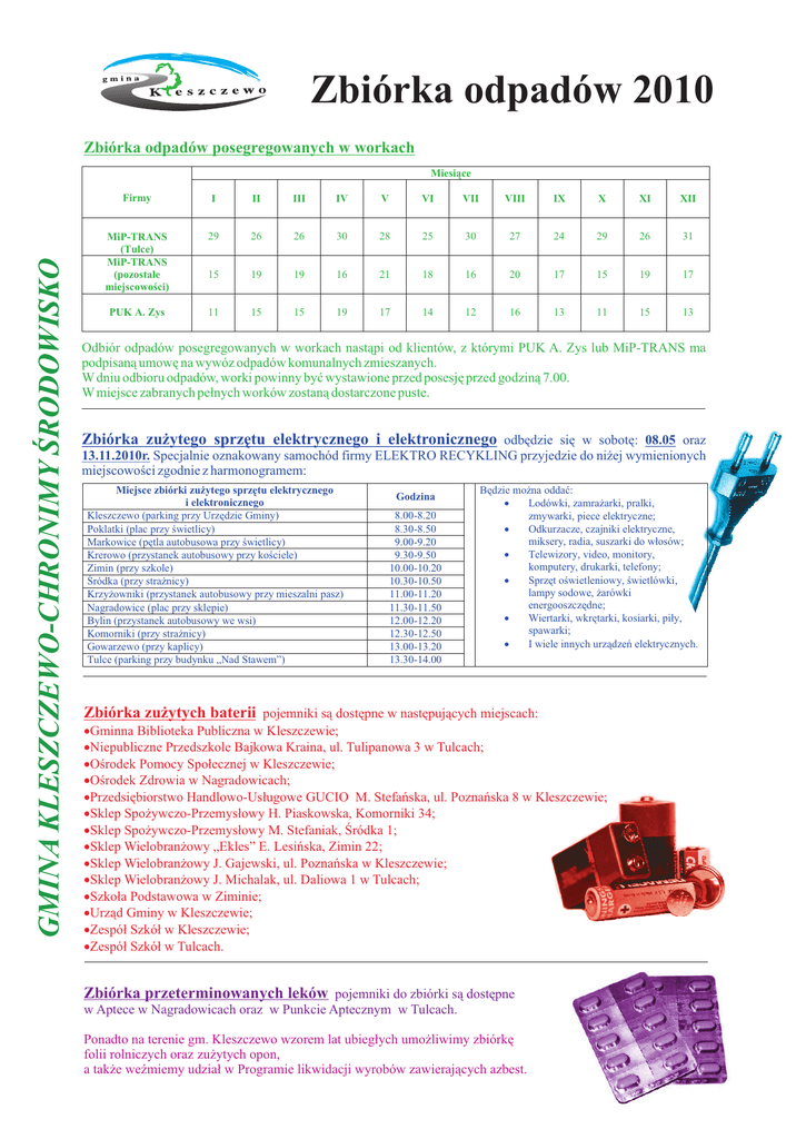 Zbiórka odpadów 2010 Zbiórka odpadów posegregowanych w workach GMINA KLESZCZEWO-CHRONIMY ŚRODOWISKO Miesiące Firmy I II III IV V VI VII VIII IX X XI XII MiP-TRANS (Tulce) MiP-TRANS (pozostałe miejscowości) 29 26 26 30 28 25 30 27 24 29 26 31 15 19 19 16 21 18 16 20 17 15 19 17 PUK A. Zys 11 15 15 19 17 14 12 16 13 11 15 13 Odbiór odpadów posegregowanych w workach nastąpi od klientów, z którymi PUK A. Zys lub MiP-TRANS ma podpisaną umowę na wywóz odpadów komunalnych zmieszanych. W dniu odbioru odpadów, worki powinny być wystawione przed posesję przed godziną 7.00. W miejsce zabranych pełnych worków zostaną dostarczone puste. Zbiórka zużytego sprzętu elektrycznego i elektronicznego odbędzie się w sobotę: 08.05 oraz 13.11.2010r. Specjalnie oznakowany samochód firmy ELEKTRO RECYKLING przyjedzie do niżej wymienionych miejscowości zgodnie z harmonogramem: Miejsce zbiórki zużytego sprzętu elektrycznego i elektronicznego Kleszczewo (parking przy Urzędzie Gminy) Poklatki (plac przy świetlicy) Markowice (pętla autobusowa przy świetlicy) Krerowo (przystanek autobusowy przy kościele) Zimin (przy szkole) Śródka (przy strażnicy) Krzyżowniki (przystanek autobusowy przy mieszalni pasz) Nagradowice (plac przy sklepie) Bylin (przystanek autobusowy we wsi) Komorniki (przy strażnicy) Gowarzewo (przy kaplicy) Tulce (parking przy budynku „Nad Stawem”) Godzina 8.00-8.20 8.30-8.50 9.00-9.20 9.30-9.50 10.00-10.20 10.30-10.50 11.00-11.20 11.30-11.50 12.00-12.20 12.30-12.50 13.00-13.20 13.30-14.00 Będzie można oddać: Lodówki, zamrażarki, pralki, zmywarki, piece elektryczne; Odkurzacze, czajniki elektryczne, miksery, radia, suszarki do włosów; Telewizory, video, monitory, komputery, drukarki, telefony; Sprzęt oświetleniowy, świetlówki, lampy sodowe, żarówki energooszczędne; Wiertarki, wkrętarki, kosiarki, piły, spawarki; I wiele innych urządzeń elektrycznych. Zbiórka zużytych baterii pojemniki są dostępne w następujących miejscach: Gminna Biblioteka Publiczna w Kleszczewie; Niepubliczne Przedszkole Bajkowa Kraina, ul. Tulipanowa 3 w Tulcach; Ośrodek Pomocy Społecznej w Kleszczewie; Ośrodek Zdrowia w Nagradowicach; Przedsiębiorstwo Handlowo-Usługowe GUCIO M. Stefańska, ul. Poznańska 8 w Kleszczewie; Sklep Spożywczo-Przemysłowy H. Piaskowska, Komorniki 34; Sklep Spożywczo-Przemysłowy M. Stefaniak, Śródka 1; Sklep Wielobranżowy „Ekles” E. Lesińska, Zimin 22; Sklep Wielobranżowy J. Gajewski, ul. Poznańska w Kleszczewie; Sklep Wielobranżowy J. Michalak, ul. Daliowa 1 w Tulcach; Szkoła Podstawowa w Ziminie; Urząd Gminy w Kleszczewie; Zespół Szkół w Kleszczewie; Zespół Szkół w Tulcach. Zbiórka przeterminowanych leków pojemniki do zbiórki są dostępne w Aptece w Nagradowicach oraz w Punkcie Aptecznym w Tulcach. Ponadto na terenie gm. Kleszczewo wzorem lat ubiegłych umożliwimy zbiórkę folii rolniczych oraz zużytych opon, a także weźmiemy udział w Programie likwidacji wyrobów zawierających azbest.