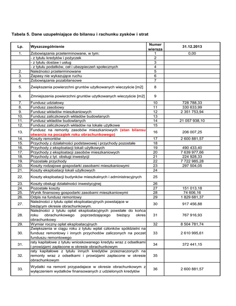 Tabela 5. Dane uzupełniające do bilansu i rachunku zysków i strat Lp. Wyszczególnienie Numer wiersza 1 2 3 4 5 6 7 31.12.2013 2. 3. 4. Zobowiązania przeterminowane, w tym: - z tytułu kredytów i pożyczek - z tytułu dostaw i usług - z tytułu podatków, ceł i ubezpieczeń społecznych Należności przeterminowane Zapasy nie wykazujące ruchu Zobowiązania pozabilansowe 5. Zwiększenia powierzchni gruntów użytkowanych wieczyście [m2] 8 6. Zmniejszenia powierzchni gruntów użytkowanych wieczyście [m2] 9 7. 8. 9. 10. 11. 12. 10 11 12 13 14 15 14. 15. 16. 17. 18. 19. 20. 21. Fundusz udziałowy Fundusz zasobowy Fundusz wkładów mieszkaniowych Fundusz zaliczkowych wkładów budowlanych Fundusz wkładów budowlanych Fundusz zaliczkowych wkładów na lokale użytkowe Fundusz na remonty zasobów mieszkaniowych (stan bilansu otwarcia na początek roku obrachunkowego) Koszty remontów Przychody z działalności podstawowej i przychody pozostałe Przychody z eksploatacji lokali użytkowych Przychody z eksploatacji zasobów mieszkaniowych Przychody z tyt. obsługi inwestycji Pozostałe przychody Koszty rodzajowe gospodarki zasobami mieszkaniowymi Koszty eksploatacji lokali użytkowych 22. Koszty eksploatacji budynków mieszkalnych i administracyjnych 25 23. 24. 25. 26. Koszty obsługi działalności inwestycyjnej Pozostałe koszty Wynik finansowy gospodarki zasobami mieszkaniowymi Odpis na fundusz remontowy Należności z tytułu opłat eksploatacyjnych powstające w bieżącym okresie obrachunkowym. Należności z tytułu opłat eksploatacyjnych powstałe do końca roku obrachunkowego poprzedzającego bieżący okres obrachunkowy Wymiar roczny opłat eksploatacyjnych Zwiększenia w ciągu roku z tytułu wpłat członków spółdzielni na fundusz remontowy i innych przychodów zaliczonych na poczet funduszu remontowego raty kapitałowe z tytułu wnioskowanego kredytu wraz z odsetkami i prowizjami zapłacone w okresie obrachunkowym raty kapitałowe z tytułu innych kredytów przeznaczonych na remonty wraz z odsetkami i prowizjami zapłacone w okresie obrachunkowym 26 27 28 29 151 013,18 74 606,16 1 829 681,37 30 917 456,88 31 767 916,93 32 8 504 781,74 33 2 610 995,61 34 372 441,15 1. 13. 27. 28. 29. 30. 31. 32. 33. Wydatki na remont przypadajace w okresie obrachunkowym z wyłączeniem wydatków finansowanych z udzielonych kredytów 0,00 728 788,33 330 633,99 2 351 753,94 21 057 938,10 16 206 007,25 17 18 19 20 21 22 23 24 2 600 881,57 490 433,40 7 639 977,66 224 928,33 7 722 985,28 297 504,05 35 36 2 600 881,57