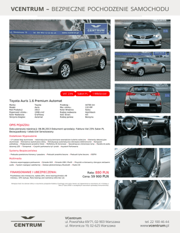 Toyota Auris 1.6 Premium Automat Marka: Model: Rok Produkcji: Pojemność silnika : Kolor Nadwozia: Skrzynia biegów: Toyota Auris 2013 1598 cm3 Grafitowy Automat Przebieg : Moc silnika : Kolor Wnętrza: Rodzaj nadwozia: Ilość drzwi: Rodzaj paliwa: 44700 km 132 KM Szary Hatchback 4/5 Benzyna OPIS POJAZDU: Data pierwszej rejestracji: 06.06.2013 Dokument sprzedaży: Faktura Vat 23% Salon PL Bezwypadkowy I właściciel Serwisowany Dodatkowe Wyposażenie ✓17-calowe felgi aluminiowe ✓Automatycznie przyciemniane wewnętrzne lusterko wsteczne ✓Elementy dekoracyjne aluminiowe ✓Kierownica wykończona skórą ✓Klimatyzacja automatyczna sterowana elektronicznie ✓Komputer pokładowy ✓Podgrzewane przednie fotele ✓Reflektory Bi-Xenonowe ✓Spryskiwacze ciśnieniowe lamp ✓Światła do jazdy dziennej LED ✓Tempomat ✓Czujniki parkowania tył i przód ✓Asystent Parkowania Systemy Bezpieczeństwa ✓Poduszka powietrzna kierowcy i pasażera ✓Poduszki przednie boczne ✓Poduszki tylne boczne ✓ISOFIX Multimedia ✓Kamera wspomagająca parkowanie ✓Gniazdo AUX ✓Gniazdo USB / iPod® ✓Przyciski w kierownicy sterujące zestawem audio ✓System nawigacji satelitarnej ✓Zestaw głośnomówiący Bluetooth ✓Radio CD FINANSOWANIE I UBEZPIECZENIA: Przykładowa rata miesięczna, wpłata 20%, okres leasingu/kredytu 48 miesięcy, 10% wykupu. Rata leasingu jest wartością netto bez vat. Rata: 880 Cena: 59 900 PLN PLN Niniejsza treść nie stanowi oferty w rozumieniu przepisów Kodeksu Cywilnego oraz opisu towaru ani zapewnienia w rozumieniu art. 4 Ustawy z dnia 27 lipca 2002r o szczególnych warunkach sprzedaży konsumenckiej. Powered by TCPDF (www.tcpdf.org)