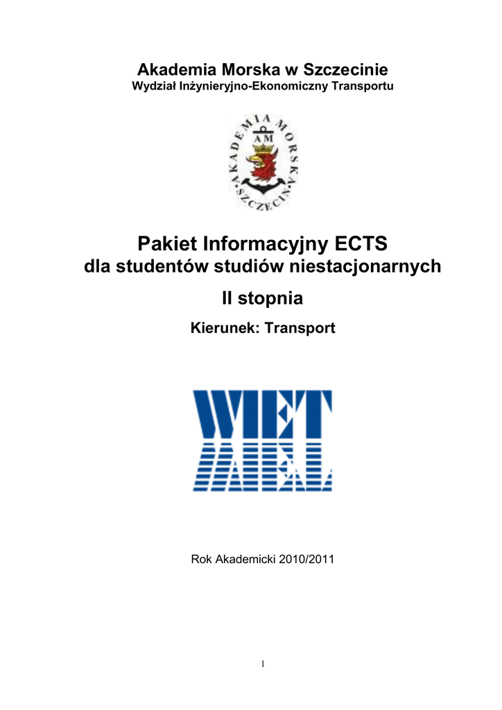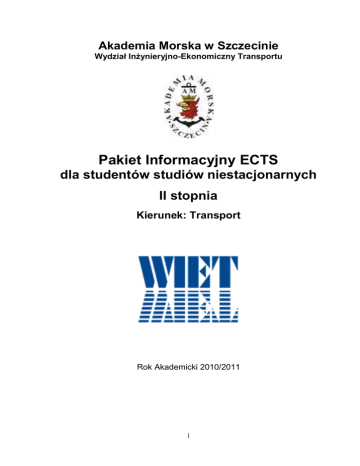 Akademia Morska w Szczecinie Wydział Inżynieryjno-Ekonomiczny Transportu Pakiet Informacyjny ECTS dla studentów studiów niestacjonarnych II stopnia Kierunek: Transport Rok Akademicki 2010/2011 1 2 Spis treści Informacje ogólne _________________________________________________________________ 5 Szczecin _______________________________________________________________________ 5 Położenie i specyfika miasta ____________________________________________________ 5 Historia miasta Szczecina _______________________________________________________ 5 Akademia Morska w Szczecinie____________________________________________________ 7 Dane teleadresowe ____________________________________________________________ 7 Informacje podstawowe ________________________________________________________ 7 Władze Uczelni ______________________________________________________________ 7 Lokalizacja __________________________________________________________________ 7 Rys historyczny, rozwój i funkcjonowanie Uczelni ___________________________________ 8 Organizacja roku akademickiego 2010/2011 ________________________________________ 10 Semestr letni ________________________________________________________________ 10 Terminarz zjazdów kierunku Transport ___________________________________________ 11 Wydział Inżynieryjno-Ekonomiczny Transportu ____________________________________ 12 Dane teleadresowe ___________________________________________________________ 12 Informacje podstawowe _______________________________________________________ 12 Władze Wydziału ____________________________________________________________ 12 Jednostki dydaktyczne ________________________________________________________ 12 Misja Wydziału _____________________________________________________________ 13 Kierunki i specjalności ________________________________________________________ 13 Sylwetka absolwenta kierunku Transport – studia II stopnia ___________________________ 14 Wprowadzenie do systemu ECTS ____________________________________________________ 14 Wstęp ________________________________________________________________________ 14 Czym są punkty ECTS? _________________________________________________________ 14 Jak działa ECTS? ______________________________________________________________ 15 Zasady przyznawania punktów studentom _________________________________________ 16 Konwersja ocen ________________________________________________________________ 16 Finansowanie udziału w programie ECTS __________________________________________ 16 Koordynatorzy ECTS ___________________________________________________________ 17 Informacje o programach studiów ___________________________________________________ 18 Przyznawane kwalifikacje _______________________________________________________ 18 Warunki przyjęć _______________________________________________________________ 18 Organizacja procesu dydaktycznego_______________________________________________ 19 Informacje ogólne o programie studiów___________________________________________ 19 Procedury zapewnienia jakości kształcenia ________________________________________ 19 Liczebność grup studenckich ___________________________________________________ 19 Stosowane metody dydaktyczne_________________________________________________ 19 Oferta kształcenia w językach obcych ____________________________________________ 20 Indywidualizacja kształcenia, oferta kształcenia i udogodnienia dla studentów niepełnosprawnych ____________________________________________________________ 20 Porównanie planu studiów z wymaganiami określonymi przez standardy MNiSW _________ 21 3 Plan studiów wraz z liczbą punktów ECTS na rok akademicki 2010/2011– studia niestacjonarne II-go stopnia _____________________________________________________ 21 Przebieg realizacji pracy dyplomowej______________________________________________ 23 Informacje ogólne dla studentów ____________________________________________________ 23 Warunki socjalno-bytowe ________________________________________________________ 23 Zakwaterowanie _____________________________________________________________ 23 Wyżywienie ________________________________________________________________ 25 Opieka zdrowotna ____________________________________________________________ 25 Koszty studiów ______________________________________________________________ 25 Świadczenia i pomoc materialna ________________________________________________ 25 Baza dydaktyczna ______________________________________________________________ 25 Dostęp do komputerów i Internetu _______________________________________________ 25 Baza laboratoryjna i aparaturowa ________________________________________________ 25 Zasoby biblioteczne oraz dostęp do biblioteki, informatyzacja _________________________ 27 Realizacja praktyk zawodowych __________________________________________________ 27 Stowarzyszenia i organizacje studenckie ___________________________________________ 28 Samorząd studencki __________________________________________________________ 28 Koła naukowe _______________________________________________________________ 28 Sport, rekreacja i czas wolny _____________________________________________________ 28 4 Informacje ogólne Szczecin Położenie i specyfika miasta Szczecin jest najdalej wysuniętym na zachód dużym miastem Polski. Fakt ten sprawia, że ze Szczecina jest bliżej do Berlina, Kopenhagi czy Pragi, niż do... Warszawy. Jest stolicą Województwa Zachodniopomorskiego i należy po Warszawie do najbardziej rozległych miast Polski (powierzchnia miasta wynosi 303 km2). To ważny port morski, mimo że od wybrzeży Bałtyku dzieli go w linii prostej odległość około 65 km (drogą około 100 km); to ośrodek przemysłowy, handlowy i kulturalny oraz siedziba 19 wyższych uczelni (w tym 7 państwowych), w których studiuje blisko 90 tys. studentów. Przez miasto przebiegają 4 drogi krajowe. Ulice miasta mają łączną