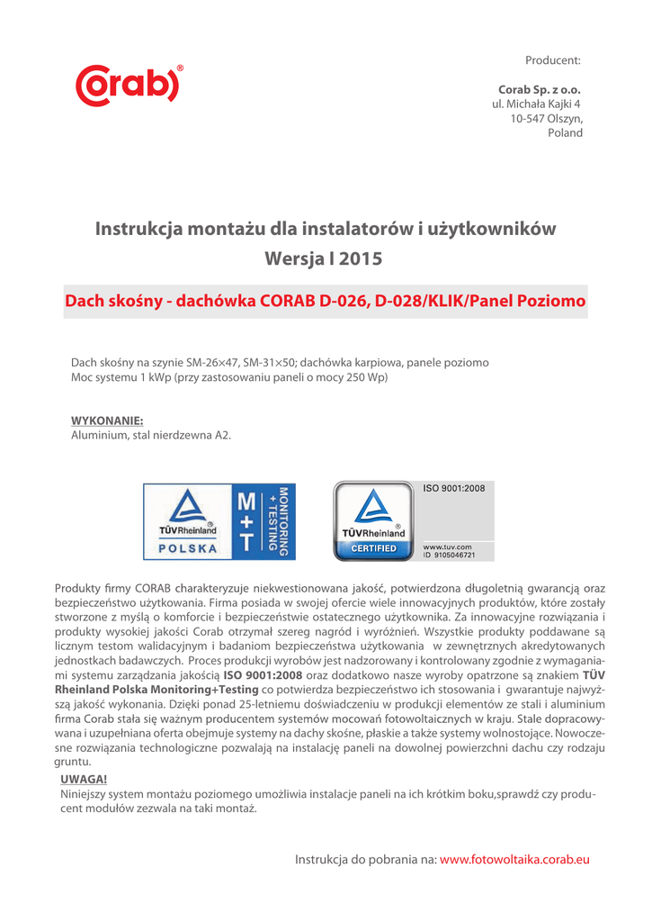 Producent: Corab Sp. z o.o. ul. Michała Kajki 4 10-547 Olszyn, Poland Instrukcja montażu dla instalatorów i użytkowników Wersja I 2015 Dach skośny - dachówka CORAB D-026, D-028/KLIK/Panel Poziomo Dach skośny na szynie SM-26×47, SM-31×50; dachówka karpiowa, panele poziomo Moc systemu 1 kWp (przy zastosowaniu paneli o mocy 250 Wp) WYKONANIE: Aluminium, stal nierdzewna A2. bezpieczeństwo użytkowania. Firma posiada w swojej ofercie wiele innowacyjnych produktów, które zostały stworzone z myślą o komforcie i bezpieczeństwie ostatecznego użytkownika. Za innowacyjne rozwiązania i produkty wysokiej jakości Corab otrzymał szereg nagród i wyróżnień. Wszystkie produkty poddawane są licznym testom walidacyjnym i badaniom bezpieczeństwa użytkowania w zewnętrznych akredytowanych jednostkach badawczych. Proces produkcji wyrobów jest nadzorowany i kontrolowany zgodnie z wymaganiami systemu zarządzania jakością ISO 9001:2008 oraz dodatkowo nasze wyroby opatrzone są znakiem TÜV Rheinland Polska Monitoring+Testing co potwierdza bezpieczeństwo ich stosowania i gwarantuje najwyższą jakość wykonania. Dzięki ponad 25-letniemu doświadczeniu w produkcji elementów ze stali i aluminium wana i uzupełniana oferta obejmuje systemy na dachy skośne, płaskie a także systemy wolnostojące. Nowoczesne rozwiązania technologiczne pozwalają na instalację paneli na dowolnej powierzchni dachu czy rodzaju gruntu. UWAGA! Niniejszy system montażu poziomego umożliwia instalacje paneli na ich krótkim boku,sprawdź czy producent modułów zezwala na taki montaż. Instrukcja do pobrania na: www.fotowoltaika.corab.eu Klauzula prawna Niniejsza instrukcja określa jedynie minimalne standardy bezpieczeństwa montażu i użytkowania systemu mocowań paneli fotowoltaicznych. Zwracamy uwagę na fakt, ze instrukcja nie stanowi projektu instalacji fotowoltaicznej i nie może projektu takiego zastępować. Właściwy dobór systemu mocowań paneli fotowoltaicznych oraz elementów wchodzących w jego skład należy do osób, które bezpośrednio dokonują montażu takiego systemu. Firma Corab sp. z o.o. jest producentem systemów montażowych do instalacji fotowoltaicznych. Wśród naszych produktów znajduje sie cała gama rozwiązań i materiałów. Produkty te są bardzo wysokiej jakości i są przystosowane do specjalistycznego wykorzystania w różnorodnych warunkach, a w tym na dachach płaskich lub skośnych. Proponowane przez nas rozwiązania uwzględniają różnorodność materiałów z jakich wykonane są pokrycia dachowe. Niemniej jako producent systemów mocowań nie ponosimy odpowiedzialności za ich prawidłowe wykorzystanie i ich prawidłowy montaż. Corab sp. z o.o. nie analizuje potrzeb klientów ostatecznych oraz przewidywanych warunków umiejscowienia instalacji fotowoltaicznych. Jako producent Corab sp. z o.o. nie wykonuje również projektów instalacji fotowoltaicznych i nie nadzoruje ich montażu. Są to czynności pozostające w gestii wykonawców, którzy w ramach tych czynności powinni uwzględnić m.in. stan konstrukcji pokryć dachowych i jakość materiałów, z których są one zbudowane, a także miejscowe warunki pogodowe. Wykonawcom, którzy maja bezpośredni kontakt z klientami ostatecznymi, pozostawiony jest dobór użytych systemów, wszystkich wchodzących w ich skład elementów, a także sposobów ich łączenia z budynkami lub gruntem. Za działania tych osób Corab sp. z o.o. odpowiedzialności nie ponosi bowiem nie analizuje potrzeb klientów ostatecznych i prawidłowości rozwiązań stosowanych przez wykonawców instalacji. Jako producent systemów mocowań paneli fotowoltaicznych zwracamy uwagę na fakt, ze bezpieczeństwo ich użytkowania wymaga systematycznych przeglądów instalacji dokonywanych przez osoby o odpowiednich kwalifikacjach. Przeglądy takie powinny mieć miejsce nie rzadziej niż raz na sześć miesięcy, a w każdym przypadku po wystąpieniu wiatrów o prędkości przekraczającej 79 km/h, gdyż nasze produkty są projektowane dla tzw. pierwszej strefy wiatrowej. Systemy nie mogą być poddane nadmiernemu pogorszeniu ich właściwości użytkowych i utracie ich sprawności technicznej. Wszelkie zmiany konstrukcji systemów mocowań, a w tym ich łączenie lub łączenie z elementami nie pochodzącymi od Corab sp. z o.o. modyfikowanie systemów, w tym ich spawanie, skracanie, zmniejszanie ilości elementów podanych w instrukcji, a przeznaczonych do zbudowania konkretnego systemu, ich wydłużanie itp., nie stosowanie sie do minimalnych zasad bezpieczeństwa wynikających z instrukcji, zwiększanie obciążenia systemów lub wykorzystywanie systemów w sposób niezgodny z przeznaczeniem powodują utratę uprawnień gwarancyjnych i mogą mieć bezpośredni wpływ na żywotność systemów oraz ich bezpieczne użytkowanie. Instrukcja montażu dla instalacji fotowoltaicznych montowanych na dachach skośnych. W czasie instalacji należy zapewnić, aby system paneli fotowoltaicznych był stosowany wyłącznie ze swoim pierwotnym przeznaczeniem. Zarówno instalacja, jak i montaż powinny być przeprowadzone przez profesjonalnych instalatorów. Podczas montażu szczególnie zwrócić uwagę na przestrzeganie obowiązujących norm krajowych i europejskich (PN i EN) dotyczących instalacji elektrycznych, przepisów budowlanych oraz przepisów BHP. Nieprzestrzeganie przytoczonych poniżej wskazówek może skutkować porażeniem prądem, wznieceniem pożaru i poważnymi okaleczeniami instalatora lub osób trzecich. Uwaga! Przed rozpoczęciem użytkowania paneli fotowoltaicznych należy dokładnie przeczytać instrukcję! Instrukcje należy zachować przez cały okres użytkowania! www.corab.eu 2 Zagrożenia dotyczące mienia lub zdrowia Niebezpieczeństwo porażenia prądem Panele fotowoltaiczne są elementem prądotwórczym, wytworzenie napięcia powstaje natychmiast po wystawieniu na działanie wiązki światła. Napięcie wytwarzane pr