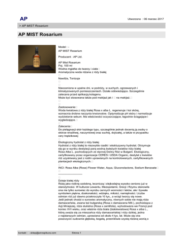 AP Utworzono : 06 marzec 2017 > AP MIST Rosarium AP MIST Rosarium Model : AP MIST Rosarium Producent : AP Ltd. AP Mist Rosarium Poj. 100 ml Wodna mgiełka do twarzy i ciała� Aromatyczna woda różana z róży białej � Nawilża, Tonizuje � � Nieoceniona w upalne dni, w podróży, w suchych, ogrzewanych i klimatyzowanych pomieszczeniach. Działa odświeżająco. Szczególnie zalecana przed aplikacją kolagenu. Może być stosowana także pod makijaż jak i �na makijaż.� � � Zastosowanie� Woda kwiatowa z róży białej Rosa x alba L. regeneruje i koi skórę, wzmacnia drobne naczynia krwionośne. Optymalizuje pH skóry i normalizuje wydzielanie sebum. Ma właściwości oczyszczające, łagodnie ściągające i wygładzające.� � Zalecenia� Do pielęgnacji skór każdego typu, szczególnie jednak docenią ją osoby o skórze wrażliwej, naczyniowej oraz suchej, dojrzałej, a także w przypadku cery trądzikowej � Ekologiczny hydrolat z róży białej Hydrolat z róży białej to niezwykle rzadki i ekskluzywny hydrolat. Otrzymuje się go w wyniku destylacji parą wodną świeżych kwiatów róży białej Rosa Alba L. pochodzących ze słynnej Doliny Róż w Bułgarii. Ekologiczny, certyfikowany przez organizacje CERES i USDA Organic, destylat z kwiatów róż uzyskiwany jest z roślin uprawianych na kontrolowanych, certyfikowanych plantacjach ekologicznych.� � INCI: Rosa Alba (Rose) Flower Water, Aqua, Gluconolactone, Sodium Benzoate� � -------------------------� Dzieje białej róży Różę jako roślinę ozdobną, leczniczą i olejkodajną wysoko ceniono już w starożytności. W kulturze Lewantu, Mezopotamii, Grecji i Rzymu stanowiła ona nie tylko surowiec do wyrobu cennych wonności i leków, ale i bywała symbolem piękna, doskonałości, wdzięku, miłości, namiętności. Liczba odmian róż już dawno przekroczyła 10 tys., a wciąż tworzy się nowe. Jeśli jednak chodzi o surowiec aromatyczny, równych sobie nie mają róża damasceńska, zwana też bułgarską (Rosa x damascena Mill.), pochodząca z Azji Mniejszej, róża stulistna (Rosa x centifolia), wyhodowana we Francji pod koniec XVI wieku, oraz właśnie róża biała (białokwiatowa) Rosa x alba L., którą uważa się za mieszańca róży damasceńskiej i róży dzikiej, jedna z najstarszych odmian, uprawiana od około 4 tys. lat. Może się ona poszczycić cudownie głęboką, bogatą, przenikliwie czystą różaną wonią o kontakt : - [email protected] Strona 1 AP Utworzono : 06 marzec 2017 > AP MIST Rosarium AP MIST Rosarium lekkich tonach cytrusowych. Woda kwiatowa otrzymywana z jej płatków zalicza się do ekskluzywnych, bardzo rzadkich hydrolatów. � Pochodzenie wody kwiatowej z róży białej Róża biała - podobnie jak damasceńska - wymaga do uprawy szczególnych warunków klimatycznych. Idealne miejsce stanowi słynna Dolina Róż w Bułgarii, miejsce o wielowiekowych tradycjach. Kwiaty zbiera się przez miesiąc na przełomie maja i czerwca. Zbiór odbywa się o brzasku, zanim jeszcze kwiaty się otworzą, tak aby uronić jak najmniej substancji lotnych. Zebrane kwiecie od razu przenosi się do destylarni, w której poprzez destylację płatków z parą wodną otrzymuje się jeden z najcenniejszych na świecie olejków eterycznych (do wyprodukowania 1 kg potrzeba blisko 4 tony świeżych płatków róż) �oraz właśnie wodę kwiatową (hydrolat), czyli wodę destylacyjną z zawartością drobin materiału roślinnego i ok. 1% olejku eterycznego. Cena : 50,00 zł Brutto ( 40,65 zł Netto) Dostępność: Produkt dostępny w naszym sklepie od 18 marzec 2015 kontakt : - [email protected] Strona 2