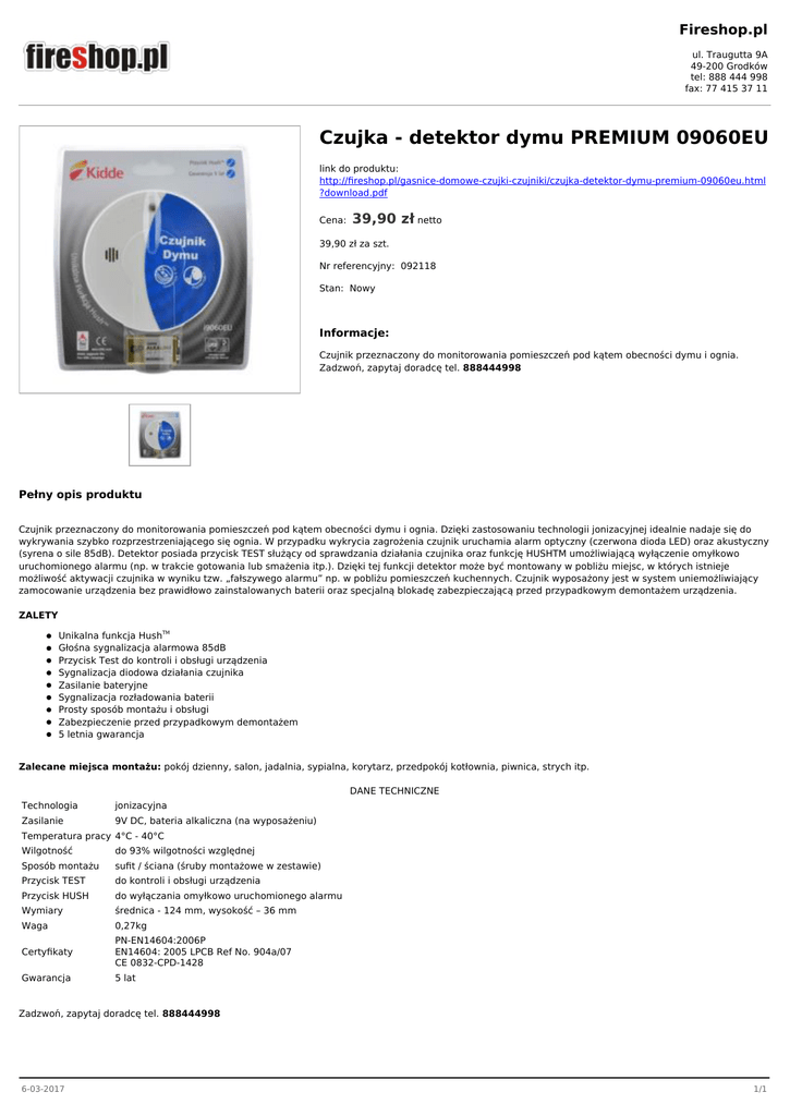 Fireshop.pl ul. Traugutta 9A 49-200 Grodków tel: 888 444 998 fax: 77 415 37 11 Czujka - detektor dymu PREMIUM 09060EU link do produktu: http://fireshop.pl/gasnice-domowe-czujki-czujniki/czujka-detektor-dymu-premium-09060eu.html ?download.pdf Cena: 39,90 zł netto 39,90 zł za szt. Nr referencyjny: 092118 Stan: Nowy Informacje: Czujnik przeznaczony do monitorowania pomieszczeń pod kątem obecności dymu i ognia. Zadzwoń, zapytaj doradcę tel. 888444998 Pełny opis produktu Czujnik przeznaczony do monitorowania pomieszczeń pod kątem obecności dymu i ognia. Dzięki zastosowaniu technologii jonizacyjnej idealnie nadaje się do wykrywania szybko rozprzestrzeniającego się ognia. W przypadku wykrycia zagrożenia czujnik uruchamia alarm optyczny (czerwona dioda LED) oraz akustyczny (syrena o sile 85dB). Detektor posiada przycisk TEST służący od sprawdzania działania czujnika oraz funkcję HUSHTM umożliwiającą wyłączenie omyłkowo uruchomionego alarmu (np. w trakcie gotowania lub smażenia itp.). Dzięki tej funkcji detektor może być montowany w pobliżu miejsc, w których istnieje możliwość aktywacji czujnika w wyniku tzw. „fałszywego alarmu” np. w pobliżu pomieszczeń kuchennych. Czujnik wyposażony jest w system uniemożliwiający zamocowanie urządzenia bez prawidłowo zainstalowanych baterii oraz specjalną blokadę zabezpieczającą przed przypadkowym demontażem urządzenia. ZALETY Unikalna funkcja HushTM Głośna sygnalizacja alarmowa 85dB Przycisk Test do kontroli i obsługi urządzenia Sygnalizacja diodowa działania czujnika Zasilanie bateryjne Sygnalizacja rozładowania baterii Prosty sposób montażu i obsługi Zabezpieczenie przed przypadkowym demontażem 5 letnia gwarancja Zalecane miejsca montażu: pokój dzienny, salon, jadalnia, sypialna, korytarz, przedpokój kotłownia, piwnica, strych itp. DANE TECHNICZNE Technologia jonizacyjna Zasilanie 9V DC, bateria alkaliczna (na wyposażeniu) Temperatura pracy 4°C - 40°C Wilgotność do 93% wilgotności względnej Sposób montażu sufit / ściana (śruby montażowe w zestawie) Przycisk TEST do kontroli i obsługi urządzenia Przycisk HUSH do wyłączania omyłkowo uruchomionego alarmu Wymiary średnica - 124 mm, wysokość – 36 mm Waga 0,27kg Certyfikaty PN-EN14604:2006P EN14604: 2005 LPCB Ref No. 904a/07 CE 0832-CPD-1428 Gwarancja 5 lat Zadzwoń, zapytaj doradcę tel. 888444998 6-03-2017 1/1