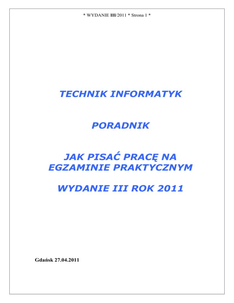 * WYDANIE III/2011 * Strona 1 * TECHNIK INFORMATYK PORADNIK JAK PISAĆ PRACĘ NA EGZAMINIE PRAKTYCZNYM WYDANIE III ROK 2011 Gdańsk 27.04.2011 * WYDANIE III/2011 * Strona 2 * UWAGA: PORADNIK OPRACOWANO WYŁĄCZNIE NA PODSTAWIE TYPOWYCH ZADAŃ Z OKRESU LAT 2006-2010 PORADNIK NIE GWARANTUJE ZDANIA EGZAMINU !!! PAMIĘTAJ! Czytaj dokładnie instrukcję zawartą w arkuszu egzaminacyjnym !!!! Czytaj, zrozum ją, wyciągaj logiczne wnioski z treści zadania i załączników. Dostosuj swoje rozwiązanie do treści zadania oraz załączników * WYDANIE III/2011 * Strona 3 * PORADY OGÓLNE Praca egzaminacyjna moŜe składać się z 6 części : I. Tytuł pracy II. ZałoŜenia III. Lista prawdopodobnych przyczyn usterki IV. Opis sposobów usunięcia usterki (lub wyraz planowanych działań) V. Wykaz prac prowadzących do usunięcia usterki (lub wyraz i opis czynności naprawczych) VI. Wskazania dla uŜytkownika (lub wskazania i instrukcje dla uŜytkowników) Masz 4 godziny na napisanie projektu……, najszybciej wykonasz części I i II. Ale z częścią III, IV, V będziesz miał najwięcej problemów, a podczas pisania ręka będzie Cię bolała, Jeśli zastosujesz się do poniŜszych wskazówek, skrócisz sobie ‘mękę’ zdawania egzaminu i moŜe go zdasz. * WYDANIE III/2011 * Strona 4 * CZYNNOŚCI FORMALNE 1. 2. 3. 4. Przed egzaminem wypocznij (wyśpij się, nie przemęczaj się!) Przyjdź punktualnie tzn. 30 min. przed rozpoczęciem egzaminu. Nie jedz i nie pij za duŜo płynów i odwiedź toaletę Znajdź bezpieczne miejsce dla Twojego telefonu komórkowego (oraz innych urządzeń telekomunikacyjnych) poniewaŜ wniesienie ich lub uŜywanie moŜe sprawić, ze Twoja praca zostanie uniewaŜniona bez moŜliwości jakiegokolwiek odwołania. 5. Nie zapomnij o dowodzie osobistym, czarnym długopisie. 6. Po wejściu wysłuchaj dokładnie co powie Przewodniczący Zespołu Nadzorującego Egzamin. 7. Zapoznaj się z wyposaŜeniem stanowiska egzaminacyjnego oraz jego dokumentacją 8. Swoje uwagi i wątpliwości zgłaszaj od razu i tylko do Przewodniczącego Zespołu Nadzorującego Egzamin. 9. Nie włączaj na komputera - sprawdź czy arkusze które otrzymałeś są dobrze wydrukowane i kompletne. Sprawdzaj kompletność arkusza egzaminacyjnego, dokumentacji stanowiskowej, wykonuj polecenia Przewodniczącego Zespołu Nadzorującego Egzamin dotyczące zakodowania Twojego numeru PESEL, daty urodzenia, nr zadania, umieszczania naklejek itp. Na KARCIE PRACY EGZAMINACYJNEJ: wpisz swoją datę urodzenia, wpisz swój numer PESEL. Na KARCIE OCENY: wpisz swoją datę urodzenia, wpisz swój numer PESEL, wpisz symbol cyfrowy zawodu, zamaluj kratkę z numerem odpowiadającym numerowi zadania, przyklej naklejkę ze swoim numerem PESEL w oznaczonym miejscu na karcie. 10. Zapoznaj się z treścią zadania egzaminacyjnego, dokumentacją załączoną do zadania, stanowiskiem egzaminacyjnym i jego wyposaŜeniem. Masz czas 20 minut, które nie wlicza się do czasu egzaminu. Nie rozwiązuj zadania!!! • Zapoznaj się z treścią zadania egzaminacyjnego, dokumentacją niezbędną do jego wykonania oraz wyposaŜeniem stanowiska egzaminacyjnego, • Sprawdź czy uruchamia się wersja systemu operacyjnego. zgodna z opisem w zadaniu. • Nie moŜesz w tym czasie przystępować do rozwiązywania zadnia!!! 11. Z chwilą gdy Przewodniczącego Zespołu Nadzorującego Egzamin ogłosi rozpoczęcie egzaminu, przejdź do czynności opisanych poniŜej. * WYDANIE III/2011 * Strona 5 * PORADY SZCZEGÓŁOWE I. Tytuł pracy egzaminacyjnej – róŜne warianty: UWAGA: Tytuł skonstruuj tak, aby był zgodny z treścią zadania – z treści zadania wyłuskaj co masz zrobić na egzaminie np. „Opracuj ……..”. 1. Projekt realizacji prac zawierający diagnostykę usterki oraz naprawę systemu komputerowego) 2. Projekt realizacji prac obejmujący lokalizacji i usunięcia usterki systemu komputerowego 3. Projekt prac prowadzący do lokalizacji i usunięcia usterki systemu komputerowego w firmie (…tu rodzaj firmy z treści zadania). UWAGA: Skorzystaj z: http://www.informatyk.w8w.pl/, http://www.egzaminzawodowy.edu.pl/ Co naleŜy rozumieć przez pojęcie System komputerowy? System komputerowy = sprzęt + system operacyjny + oprogramowanie narzędziowe + oprogramowanie uŜytkowe. II. ZałoŜenia do projektu – róŜne warianty: UWAGA: NIE WŁĄCZAJ KOMPUTERA!!! ZałoŜenia skonstruuj tak, aby były zgodne z treścią zadania – z treści zadania i załączników przepisz zdania opisujące stan poprzedni, aktualny systemu komputerowego oraz to co masz zrobić dla klienta. Odpowiednio usystematyzowane załoŜenia POZWOLĄ CI NA SPRAWNIEJSZE wykonanie następnej części projektu czyli III. Listy prawdopodobnych przyczyn usterki systemu. 1. naprawa systemu komputerowego u klienta, 2. naprawa bez reinstalacji systemu operacyjnego, 3. istotne dane (Ŝaden z folderów wymienionych w zadaniu) nie mogą zostać utracone w wyniku prac serwisowych, 4. brak utworzonych i skonfigurowanych kont lub naleŜy utworzyć wskazane konta lub praca na jednym koncie * WYDANIE III/2011 * Strona 6 * 5. nadanie odpowiednich uprawnień do folderów osobom korzystającym z komputera, 6. infekcja wirusową 7. niestabilna pracę systemu 8. instalację zapory ogniowej 9. brak oprogramowania firewall 10. nieskonfigurowane (skonfigurować, usunięto) konto pocztowe w programie Outlook Express. 11. wykonanie kopii rejestru systemu 12. nieuruchamianie się programu (… tu konkretna nazwa programu) 13. nie moŜna uruchomić programu (…tu wpisz nazwę z treści zadania). 14. zły tryb uruchamiania się programu (… tu konkretna nazwa programu) 15. złe przypisania liter i cyfr do odpowiednich klawiszy 16. klawiatura działa niepoprawnie lub zły układ klawiatury 17. utworzenie i zabezpieczenie folderu (… tu konkretna nazwa) 18. wykonanie archiwum (kopii bezpieczeństwa) folderów, 19. brak moŜliwości odczytu plików (…tu nazwa rodzaju plików lub rozszerzenia pl