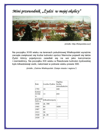 Mini przewodnik „Żydzi w mojej okolicy” (źródło: http://fotopolska.eu/) Na początku XVIII wieku na terenach południowej Wielkopolski wyraźnie zaczęła zwiększać się liczba ludności oprócz Niemców pojawili się także Żydzi którzy pojedynczo osiedlali się na wsi jako karczmarze i rzemieślnicy. Na początku XIX wieku w Raszkowie ludności żydowskiej było kilkadziesiąt osób, natomiast w połowie wieku prawie 300. (źródło: „Ostrów Wielkopolski. Dzieje miasta i regionu”) Rok 1793 koniec XVIII w. początek XIX w. 1858 1905 1907 1913 1920 1939 Ogólna Liczba Żydów liczba mieszkańców 10 448 13 692 kilkudziesięciu ok. 300 84 45 30 ok. 20 3 1858 - Nazwiska Żydów mieszkających w Raszkowie (na podstawie książki Arnolda Strassmanna Społeczność żydowska przed 1989 – Relacje, wspomnienia, http://www.sztetl.org.pl/) Unikalny opis Raszkowa w XIX w. znajdziemy w książce pochodzącego z tego miasteczka Żyda Arnolda Strassmanna (18591940). Książka dotyczy małego, zapomnianego przez świat miasteczka na poznańskiej prowincji, jak określa autor, rodzinny Raszków. Mieszkał tam jak pisze, w masywnym domu usytuowanym w rogu Rynku. Oprócz surowego traktowania w miejscowej szkole powszechnej wspomina autor przede wszystkim charakterystyczne dla miasteczka postacie. Byli to, rozwożący piwo woźnica Hanke oraz krążący po ulicach szklarz Kube. Praca ich wydawała się jednak chłopcu nazbyt ciężką. Zawód zegarmistrza natomiast wykonywany w Raszkowie przez niejakiego Mende, stryja autora wydawał mu się wyjątkowo atrakcyjny. Respekt wobec stryja-zegarmistrza powiększał jeszcze fakt, iż był on jedyną osobą w miasteczku, której burmistrz pozwalał raz w tygodniu nakręcać zegar znajdujący się na wieżyczce raszkowskiego ratusza. Drugą osobą w miasteczku, która imponowała młodemu Arnoldowi był kowal Liebich. W tym przypadku chodziło oczywiście o jego niespotykaną siłę fizyczną. Stał on także na czele miejscowej straży pożarnej, co dodatkowo przysparzało mu powagi. Powodem do dumy był także udział kowala Liebicha w wojnach prusko-duńskiej z 1864 r. oraz prusko-austriackiej z 1866 r. Przypominały o tym jego liczne odznaczenie, które pokazywał czasami chłopcu. Autor wspomnień pisze także o miejscowych Polakach, proboszczu parafii katolickiej, lekarzu oraz hrabim właścicielu okolicznych dóbr. Nie podaje jednak ich nazwisk, podkreśla natomiast ich dystansowanie się wobec pruskich władz. Przywołuje też postać miejscowego „króla włamywaczy”, który w odróżnieniu od większości, czasy dzielił nie na te przed i po Chrystusie, ale na te „przed i po Rawiczu”. Była to aluzja do jego pobytu, w znajdującym się w tym mieście ciężkim więzieniu. Pierwszym przedstawicielem społeczności żydowskiej, którego obecność została potwierdzona źródłowo był miejscowy lekarz, odnotowany w 1693 r. Pod koniec XVIII w. na ogólną liczbę 692 mieszkańców Raszkowa, 13 było Żydami. Na początku XIX w. ich liczba oscylowała wokół kilkudziesięciu, a w połowie XIX w. wzrosła do 300. W 1858 r. do żydowskiej gminy wyznaniowej w Raszkowie należało 57 rodzin. Do gminy tej zaliczano także rodziny żydowskie z okolicznych wsi. Gmina posiadała już wtedy synagogę w Raszkowie. Na czele gminy stał wtedy Moses Apt, pełniący jednocześnie funkcję kantora i nauczyciela religii mojżeszowej. Dzieci żydowskie początkowo uczyły się w szkole katolickiej w Raszkowie. Później jednak utworzona została szkolna wspólnota ewangelicko-żydowska. Niektórzy z raszkowskich Żydów kontynuowali później swą edukację w Królewskim Gimnazjum w Ostrowie Wielkopolskim. Warto wspomnieć, że utworzone w 1839 r. kasyno szlacheckie w Raszkowie mieściło się w domu-winiarni miejscowego Żyda Goldringa. Na początku XX w., w 1905 r., na ogólną liczbę 1658 mieszkańców Raszkowa, Żydów mieszkało 84, dwa lata później już tylko 45, a w roku 1913 zaledwie 30. Na czele gminy wyznaniowej stał wtedy Moritz Czapski. Jeszcze przed wybuchem I wojny światowej, w 1912 r. gmina żydowska z Raszkowa włączona została do gminy funkcjonującej w sąsiednim Ostrowie Wielkopolskim. W Raszkowie mieszkało wtedy zaledwie kilka rodzin żydowskich. Byli to: Moritz Benjamin, Emil Cohn, Moritz Czapski, Isaak Glogowski, Otto Mielke oraz Max i Rosa Itzig wraz z rodzinami. W okresie międzywojennym pozostali w Raszkowie jedynie Otto Mielke prowadzący skład z towarami żelaznymi oraz kolonialnymi, a także Max i Rosa Itzig, trudniący się drobnym handlem. Po zajęciu Raszkowa przez Niemców we wrześniu 1939 r., nieliczni już Żydzi wywiezieni zostali przez nazistów w nieznanym kierunku i nigdy już do Raszkowa nie powrócili. (źródło: http://www.sztetl.org.pl/pl/article/raszkow/5,historia) Zabytki Przez wieki ludność polska, niemiecka i żydowska żyła bezkonfliktowo tworząc swoisty klimat miasta Raszkowa. Żydzi mieli swoją synagogę i kirkut. W 1868 r. budynek, w którym mieściła się synagoga zakupiony został przez gminę żydowską, zburzony i na jego miejscu, z inicjatywy ówczesnego przewodniczącego gminy żydowskiej Hirscha Müllera zbudowana została nowa synagoga. Zachował się do naszych czasów budynek synagogi, który pełni obecnie funkcje domu mieszkalnego. Podczas adaptacji synagogi na budynek mieszkalny dokonano szeregu zmian, m. in. przebito nowe otwory okienne i drzwi na parterze. Z dawnego wystroju zewnętrznego zachowały się profilowane lizeny na elewacji frontowej, ząbkowany gzyms, układ okien na pierwszym piętrze. Fot. Marcin Wygock Cmentarz gminy żydowskiej w Raszkowie znajduje się na północ od miasta. Jego lokalizację zaznaczono na wydanej w 1934 r. wojskowej mapie okolic Krotoszyna. (źródło: https://www.google.pl/maps) Obiekt uległ dewastacji, według dostępnych źródeł na terenie cmentarza nie zachowały się jakiekolwiek nagrobki. Został założony w XIX wieku ,cm