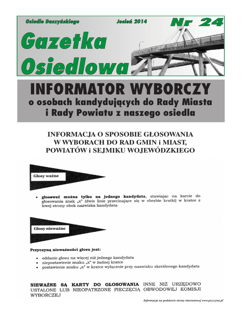 INFORMATOR WYBORCZY o osobach kandydujących do Rady Miasta i Rady Powiatu z naszego osiedla INFORMACJA O SPOSOBIE GŁOSOWANIA W WYBORACH DO RAD GMIN i MIAST, POWIATÓW i SEJMIKU WOJEWÓDZKIEGO Informacja na podstawie strony internetowej www.pszczyna.pl 2 Gazetka Osiedlowa Wybory samorządowe 2014 Od redakcji: Ponieważ nie wszyscy kandydaci z osiedla dostarczyli informacje o sobie, poniżej podajemy nazwiska pozostałych osób, które ubiegać się będą o mandat radnego miejskiego lub powiatowego. Do Rady Miejskiej kandyduje: Józef Grzechnik - KW Prawo i Sprawiedliwość. O stanowisko radnego powiatu Pszczyńskiego ubiegają się: Marcela Kanafek- Lewandowska KW Prawo i Sprawiedliwość; Maria Legierska - KWW Liga Samorządowa Ziemi Pszczyńskiej. Z sylwetkami tych kandydatów można zapoznać się na stronie internetowej: www.wybory.pless.pl KANDYDACI DO RADY MIEJSKIEJ MONIKA KIEŁKOWSKA KWW Pszczyńskie Porozumienie Samorządowe Jestem mężatką i dumną mamą trzynastoletniej córki. To właśnie córka przyczyniła się do mojej aktywności na rzecz lokalnej społeczności. Odkąd przekroczyła próg Szkoły Podstawowej i Gimnazjum nr 4 na Osiedlu Daszyńskiego czynnie zaangażowałam się w pracę Komitetu Rodzicielskiego. Tam pełniłam funkcję Przewodniczącego Rady Rodziców przy Szkole Podstawowej, później Zastępcy Przewodniczącego Rady Rodziców w Gimnazjum, którą to funkcję pełnię do chwili obecnej. Szkoła to po Rodzinie najważniejsze miejsce dla dziecka. To między innym tej grupie zamierzam poświęcić swój czas i doświadczenie pełniąc obowiązki Radnej. W swoich priorytetach stawiam na bezpieczeństwo. W tym zakresie za cel stawiam sobie budowę nowych i utrzymanie w należytym stanie istniejących chodników. Uważam za wskazane nawiązanie współpracy z instytucjami odpowiedzialnymi za bezpieczeństwo i porządek na Naszym osiedlu. Zdaję sobie sprawę że praca Radnego to nie tylko szkoła, ale i inne ważne dla mieszkańców dziedziny życia . Deklaruję mandat swój sprawować godnie mając na celu wyłącznie dobro mieszkańców , którzy obdarzyli mnie zaufaniem. PROSZĘ O PAŃSTWA O ZAUFANIE I GŁOSY 16 LISTOPADA MARZENA SITKO KW Platforma Obywatelska Pszczyna: pasja i współpraca Pasja – to jedno z najważniejszych słów w moim życiu. Wszystko, co robię, pochłania mnie całkowicie. Zawzięcie studiowałam filologią angielską, obecnie z wielkim zaangażowaniem uczę się zarządzania. Na co dzień pracuję w Urzędzie Marszałkowskim Województwa Śląskiego. Jeśli mam wolną chwilę jeżdżę na rolkach, czytam szwedzkie kryminały i słucham muzyki Leszka Możdżera. Uważam, że w życiu publicznym brakuje nam współpracy. Jestem pewna, że Pszczyna mogłaby wyglądać piękniej i być lepszym miejscem do życia, gdybyśmy lepiej ze sobą współpracowali. Dlatego jako radna zamierzam współpracować z każdym, komu na sercu leży dobro mojego rodzinnego miasta. Mam dwa główne cele: zrealizować w ramach budżetu obywatelskiego projekt, poprawiający komfort życia na Osiedlu Daszyńskiego oraz uwolnić centrum Pszczyny od szpetnych reklam. Jestem przekonana, że właśnie dzięki pasji i współpracy uda mi się to zrobić. Bo zmieniać rzeczywistość można tylko wspólnie. Marzena Sitko: 29 lat, urodziłam się i mieszkam w Pszczynie. Kandyduję do Rady Miasta z listy Platformy Obywatelskiej RP, okręg nr 7 – Osiedle Daszyńskiego. Wybory samorządowe 2014 3 Gazetka Osiedlowa MACIEJ STIEBER KWW Pawła Sadzy 39 lat. Żona Joanna, dzieci: Matylda i Karol. Wykształcenie wyższe. Od roku 2007 dyrektor POSiR Pszczyna. Bezpartyjny. Członek Zarządu Osiedla Daszyńskiego, radny Rady Miejskiej w Pszczynie, Członek Rady Rodziców przy PG 4 w Pszczynie. Współtwórca szkółki piłkarskiej i siatkarskiej oraz klas usportowionych w tych dyscyplinach sportu. Tylko w ostatnim roku udało się na naszym osiedlu zrealizować wiele cennych inicjatyw. Do najważniejszych zaliczyć można m.in. powstanie nowego placu zabaw przy SP nr 4, I etap termomodernizacji PG 4, budowę boiska do siatkówki plażowej, remont zapomnianej przez lata ulicy Chochółki oraz część odwodnienia ul. Miłosza. Konkrety dla osiedla Daszyńskiego Doprowadzić do wybudowania „za wałem” ścieżki rowerowo-pieszej, dopilnować dokończenia termomodernizacji PG 4 oraz zagospodarowania terenu przy szkołach, zadbać o stan dróg i chodników osiedlowych, dokończyć remont ul. Chochółki i Miłosza. Wybudować chodnik przy ul. Konopnickiej oraz wyremontować ul. Krasińskiego. Konkrety dla Pszczyny Utworzenie sieci komunikacji miejskiej, rewitalizacja parku, remont płyty rynku, budowę dróg i chodników, oświetlenie przejść dla pieszych, poprawa stanu urządzeń melioracyjnych, modernizacja stadionu miejskiego, budowa ścieżek rowerowych, budowa siłowni zewnętrznych. ATANAZY INDEKA KWW Mieszkańcy Powiatu Pszczyńskiego Mam 61 lat. Urodziłem się w Pszczynie na osiedlu im. I. Daszyńskiego w domu przy ulicy J. Słowackiego. Wraz z żoną Celiną wybudowałem na tym osiedlu dom jednorodzinny w którym obecnie mieszkamy. Jestem ojcem dwóch żonatych synów: Łukasza i Szymona oraz córki Magdaleny aktualnie studiuje na drugim roku na Uniwersytecie Rolniczym w Krakowie. Jestem absolwentem Akademii Górniczo-Hutniczej w Krakowie, ukończyłem studia techniczne w zakresie geodezji i kartografii. Moja działalność zawodowa to 41 lat pracy w dziedzinie geodezji i kartografii w firmie PKP oraz prowadzenie własnej działalności gospodarczej. Nigdy nie należałem do żadnej partii politycznej. Nie składam żadnych obietnic wyborczych, mogę zagwarantować rzetelną pracę na rzecz pięknego i rodzinnego miasta Pszczyna. Zaakceptuję każdą inicjatywę związaną z promocją oraz upiększeniem i funkcjonalnością miasta Pszczyna. Nigdy nie poprę inicjatyw dotyczących podwyżek wszelkiego rodzaju opłat związanych z utrzymaniem gospodarstw domo