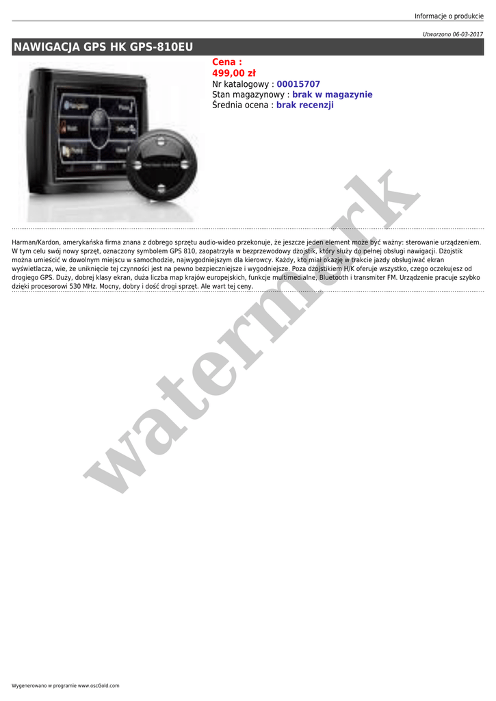 Informacje o produkcie Utworzono 06-03-2017 NAWIGACJA GPS HK GPS-810EU Cena : 499,00 zł er m ar k Nr katalogowy : 00015707 Stan magazynowy : brak w magazynie Średnia ocena : brak recenzji w at Harman/Kardon, amerykańska firma znana z dobrego sprzętu audio-wideo przekonuje, że jeszcze jeden element może być ważny: sterowanie urządzeniem. W tym celu swój nowy sprzęt, oznaczony symbolem GPS 810, zaopatrzyła w bezprzewodowy dżojstik, który służy do pełnej obsługi nawigacji. Dżojstik można umieścić w dowolnym miejscu w samochodzie, najwygodniejszym dla kierowcy. Każdy, kto miał okazję w trakcie jazdy obsługiwać ekran wyświetlacza, wie, że uniknięcie tej czynności jest na pewno bezpieczniejsze i wygodniejsze. Poza dżojstikiem H/K oferuje wszystko, czego oczekujesz od drogiego GPS. Duży, dobrej klasy ekran, duża liczba map krajów europejskich, funkcje multimedialne, Bluetooth i transmiter FM. Urządzenie pracuje szybko dzięki procesorowi 530 MHz. Mocny, dobry i dość drogi sprzęt. Ale wart tej ceny. Wygenerowano w programie www.oscGold.com