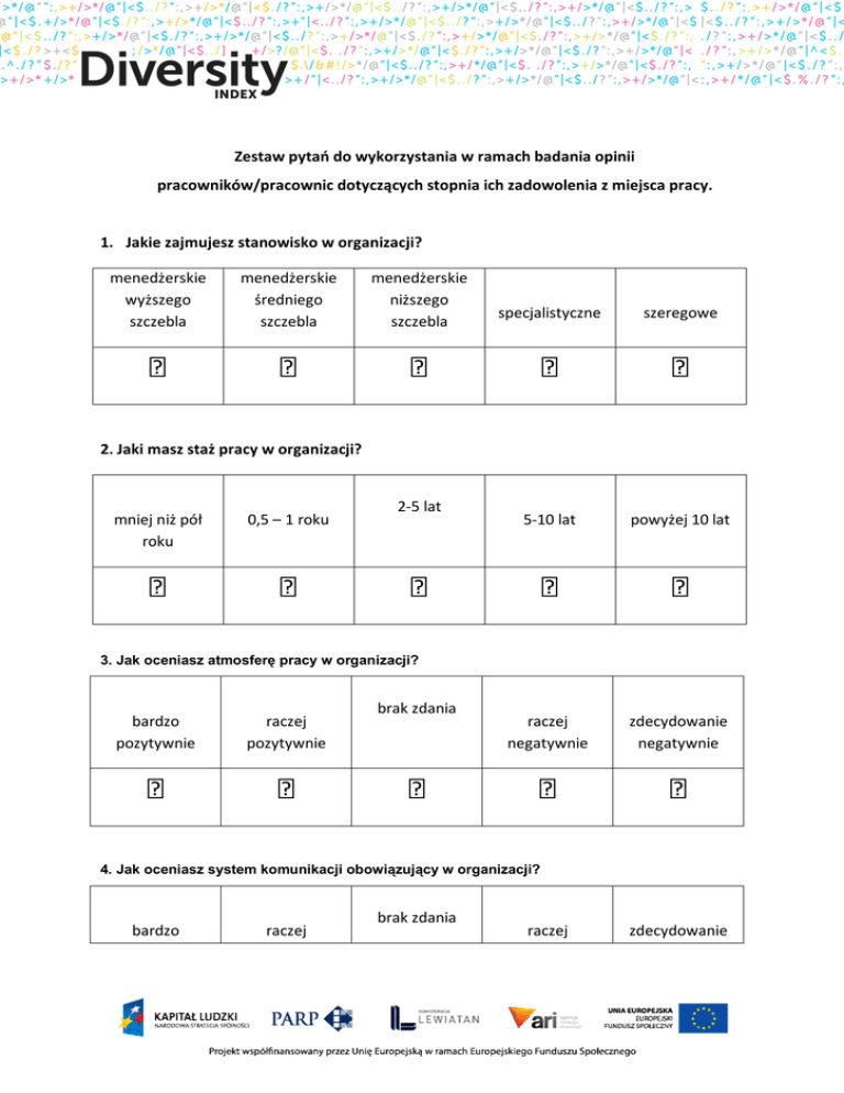 Zestaw pytań do wykorzystania w ramach badania opinii pracowników/pracownic dotyczących stopnia ich zadowolenia z miejsca pracy. 1. Jakie zajmujesz stanowisko w organizacji? menedżerskie wyższego szczebla menedżerskie średniego szczebla menedżerskie niższego szczebla specjalistyczne szeregowe 5-10 lat powyżej 10 lat raczej negatywnie zdecydowanie negatywnie 2. Jaki masz staż pracy w organizacji? mniej niż pół roku 0,5 – 1 roku 2-5 lat 3. Jak oceniasz atmosferę pracy w organizacji? bardzo pozytywnie raczej pozytywnie brak zdania 4. Jak oceniasz system komunikacji obowiązujący w organizacji? bardzo raczej brak zdania raczej zdecydowanie pozytywnie pozytywnie negatywnie negatywnie raczej negatywnie zdecydowanie negatywnie 5. Jak oceniasz swoje relacje z przełożonym/przełożoną? bardzo pozytywnie raczej pozytywnie brak zdania 6. Jak oceniasz swoje relacje ze współpracownikami/współpracownicami? bardzo pozytywnie raczej pozytywnie brak zdania raczej negatywnie zdecydowanie negatywnie 7. Jak oceniasz swoją stabilność zatrudnienia w organizacji? bardzo pozytywnie raczej pozytywnie brak zdania 8. Jak oceniasz wysokość otrzymywanego wynagrodzenia? raczej negatywnie zdecydowanie negatywnie bardzo pozytywnie raczej pozytywnie brak zdania raczej negatywnie zdecydowanie negatywnie 9. Jak oceniasz zakres zadań i obowiązków przypisanych do Twojego stanowiska pracy? bardzo pozytywnie raczej pozytywnie brak zdania raczej negatywnie zdecydowanie negatywnie 10. Jak oceniasz możliwość wykorzystania na Twoim stanowisku posiadanego przez Ciebie doświadczenia i umiejętności? bardzo pozytywnie raczej pozytywnie brak zdania raczej negatywnie zdecydowanie negatywnie 11. Jak oceniasz znajomość specyfiki pracy na Twoim stanowisku przez Twojego przełożonego/Twoją przełożoną? bardzo pozytywnie raczej pozytywnie brak zdania raczej negatywnie zdecydowanie negatywnie 12. Jak oceniasz sposób motywowania Cię do pracy przez Twojego przełożonego/Twoją przełożoną? bardzo pozytywnie raczej pozytywnie brak zdania raczej negatywnie zdecydowanie negatywnie 13. Jak oceniasz fizyczne warunki pracy na Twoim stanowisku (na przykład: wyposażenie biura, sprzęt specjalistyczny)? bardzo pozytywnie raczej pozytywnie brak zdania raczej negatywnie zdecydowanie negatywnie 14. Jak oceniasz czas pracy na Twoim stanowisku (na przykład: godziny pracy, dni pracy)? bardzo pozytywnie raczej pozytywnie brak zdania raczej negatywnie zdecydowanie negatywnie 15. Jak oceniasz system rekrutacji obowiązujący w organizacji? bardzo pozytywnie raczej pozytywnie brak zdania raczej negatywnie zdecydowanie negatywnie 16. Jak oceniasz system awansów obowiązujący w organizacji? bardzo pozytywnie raczej pozytywnie brak zdania raczej negatywnie zdecydowanie negatywnie 17. Jak oceniasz system szkoleń obowiązujący w organizacji? bardzo pozytywnie raczej pozytywnie brak zdania raczej negatywnie zdecydowanie negatywnie 18. Jak oceniasz system oceny pracowniczej obowiązujący w organizacji? bardzo pozytywnie raczej pozytywnie brak zdania raczej negatywnie zdecydowanie negatywnie 19. Jak oceniasz stosowane w organizacji rozwiązania umożliwiające pracownikom/pracownicom godzenie pracy zawodowej z życie prywatnym/rodzinnym? bardzo pozytywnie 20. Jak oceniasz klientom/klientkom? bardzo pozytywnie raczej pozytywnie jakość usług raczej pozytywnie brak zdania raczej negatywnie świadczonych/jakość brak zdania produktów raczej negatywnie zdecydowanie negatywnie sprzedawanych zdecydowanie negatywnie 21. Jak oceniasz sposób postrzegania organizacji przez klientów/klientki? bardzo pozytywnie raczej pozytywnie brak zdania raczej negatywnie zdecydowanie negatywnie raczej negatywnie zdecydowanie negatywnie 22. Jak oceniasz swój wpływ na sukces organizacji? bardzo pozytywnie raczej pozytywnie brak zdania 23. Jak oceniasz swoją możliwość przekazywanie informacji na temat trudności i problemów występujących w organizacji? bardzo pozytywnie raczej pozytywnie brak zdania raczej negatywnie zdecydowanie negatywnie 24. Jak oceniasz swoją możliwość wpływu na zmiany w organizacji? bardzo pozytywnie raczej pozytywnie brak zdania raczej negatywnie zdecydowanie negatywnie 25. Jak oceniasz swoją wiedzę na temat planów rozwojowych organizacji? bardzo pozytywnie raczej pozytywnie brak zdania raczej negatywnie zdecydowanie negatywnie