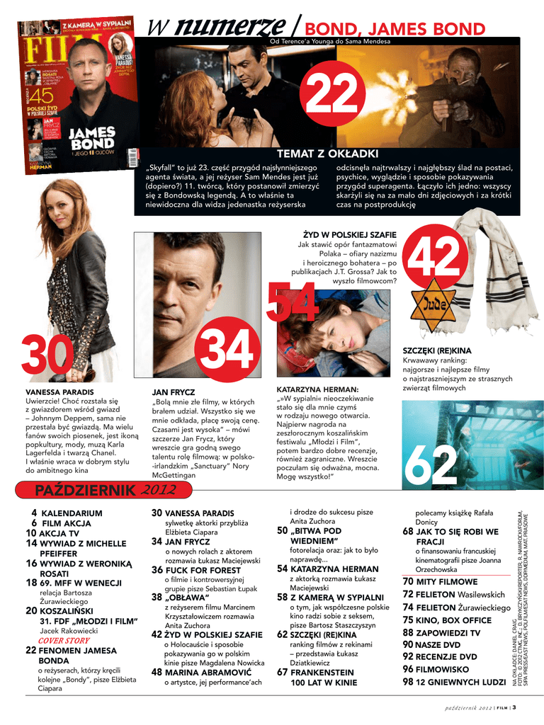 w numerze / BOND, JAMES BOND Od Terence’a Younga do Sama Mendesa 22 TEMAT Z OKŁADKI „Skyfall” to już 23. część przygód najsłynniejszego agenta świata, a jej reżyser Sam Mendes jest już (dopiero?) 11. twórcą, który postanowił zmierzyć się z Bondowską legendą. A to właśnie ta niewidoczna dla widza jedenastka reżyserska odcisnęła najtrwalszy i najgłębszy ślad na postaci, psychice, wyglądzie i sposobie pokazywania przygód superagenta. Łączyło ich jedno: wszyscy skarżyli się na za mało dni zdjęciowych i za krótki czas na postprodukcję ŻYD W POLSKIEJ SZAFIE Jak stawić opór fantazmatowi Polaka – ofiary nazizmu i heroicznego bohatera – po publikacjach J.T. Grossa? Jak to wyszło filmowcom? VANESSA PARADIS Uwierzcie! Choć rozstała się z gwiazdorem wśród gwiazd – Johnnym Deppem, sama nie przestała być gwiazdą. Ma wielu fanów swoich piosenek, jest ikoną popkultury, mody, muzą Karla Lagerfelda i twarzą Chanel. I właśnie wraca w dobrym stylu do ambitnego kina PAŹDZIERNIK 4 KALENDARIUM 6 FILM AKCJA 10 AKCJA TV 14 WYWIAD Z MICHELLE 16 18 34 JAN FRYCZ „Bolą mnie złe filmy, w których brałem udział. Wszystko się we mnie odkłada, płacę swoją cenę. Czasami jest wysoka” – mówi szczerze Jan Frycz, który wreszcie gra godną swego talentu rolę filmową: w polsko-irlandzkim „Sanctuary” Nory McGettingan 2012 30 VANESSA PARADIS sylwetkę aktorki przybliża Elżbieta Ciapara 34 JAN FRYCZ o nowych rolach z aktorem rozmawia Łukasz Maciejewski SZCZĘKI (RE)KINA KATARZYNA HERMAN: „»W sypialni« nieoczekiwanie stało się dla mnie czymś w rodzaju nowego otwarcia. Najpierw nagroda na zeszłorocznym koszalińskim festiwalu „Młodzi i Film”, potem bardzo dobre recenzje, również zagraniczne. Wreszcie poczułam się odważna, mocna. Mogę wszystko!” i drodze do sukcesu pisze Anita Zuchora 50 „BITWA POD WIEDNIEM” 38 „OBŁAWA” 58 Z KAMERĄ W SYPIALNI 42 ŻYD W POLSKIEJ SZAFIE 62 SZCZĘKI (RE)KINA 48 MARINA ABRAMOVIĆ 67 FRANKENSTEIN Jacek Rakowiecki COVER STORY 22 FENOMEN JAMESA BONDA o reżyserach, którzy kręcili kolejne „Bondy”, pisze Elżbieta Ciapara o Holocauście i sposobie pokazywania go w polskim kinie pisze Magdalena Nowicka o artystce, jej performance’ach FRACJI 70 MITY FILMOWE 72 FELIETON Wasilewskich 74 FELIETON Żurawieckiego 75 KINO, BOX OFFICE 88 ZAPOWIEDZI TV 90 NASZE DVD 92 RECENZJE DVD 96 FILMOWISKO 98 12 GNIEWNYCH LUDZI relacja Bartosza Żurawieckiego 31. FDF „MŁODZI I FILM” 68 JAK TO SIĘ ROBI WE z aktorką rozmawia Łukasz Maciejewski 54 KATARZYNA HERMAN 20 KOSZALIŃSKI polecamy książkę Rafała Donicy o finansowaniu francuskiej kinematografii pisze Joanna Orzechowska 36 FUCK FOR FOREST z reżyserem filmu Marcinem Krzyształowiczem rozmawia Anita Zuchora 62 fotorelacja oraz: jak to było naprawdę... PFEIFFER WYWIAD Z WERONIKĄ ROSATI 69. MFF W WENECJI o filmie i kontrowersyjnej grupie pisze Sebastian Łupak Krwawawy ranking: najgorsze i najlepsze filmy o najstraszniejszym ze strasznych zwierząt filmowych o tym, jak współczesne polskie kino radzi sobie z seksem, pisze Bartosz Staszczyszyn ranking filmów z rekinami – przedstawia Łukasz Dziatkiewicz 100 LAT W KINIE październik 2012 | FILM | NA OKŁADCE: DANIEL CRAIG FOTO: © 2012 CTMG, INC.; D. BRYKCZYŃSKI/REPORTER, R. NAWROCKI/FORUM, SIPA PRESS/EAST NEWS, POLFILM/ESAT NEWS, DDP/MEDIUM, MAT. PRASOWE 30 54 42 3