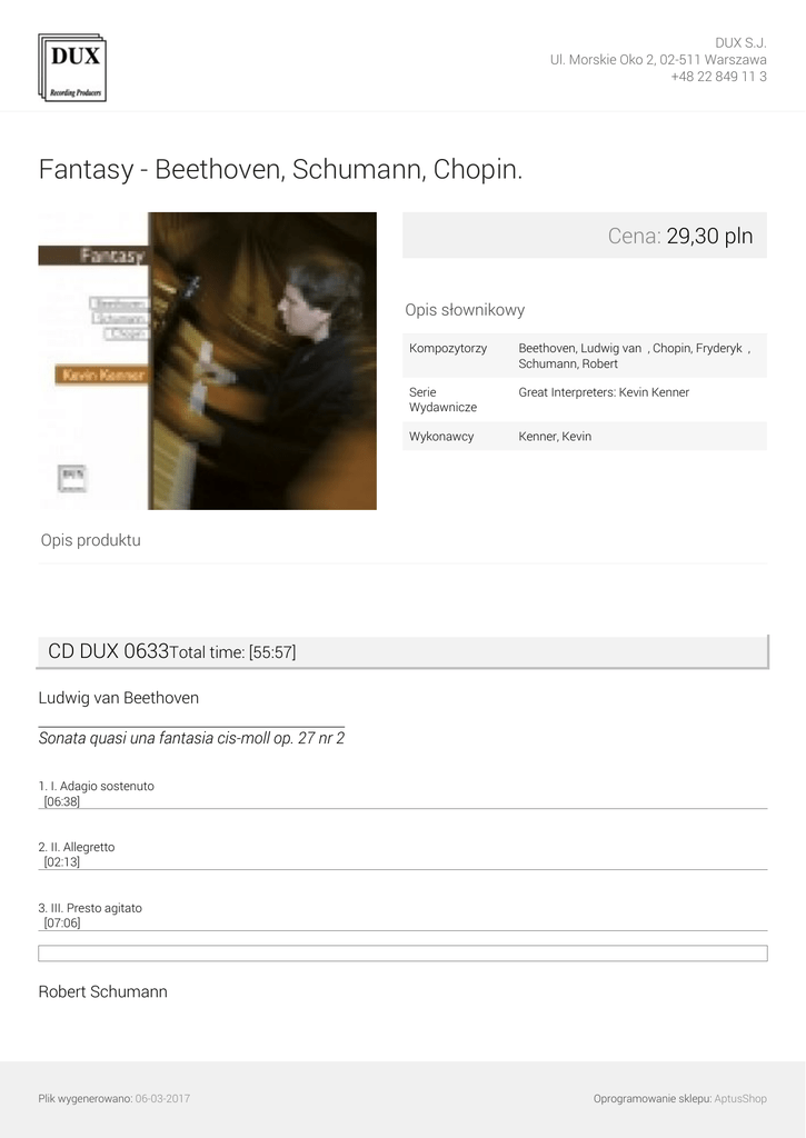 DUX S.J. Ul. Morskie Oko 2, 02-511 Warszawa +48 22 849 11 3 Fantasy - Beethoven, Schumann, Chopin. Cena: 29,30 pln Opis słownikowy Kompozytorzy Beethoven, Ludwig van ∎, Chopin, Fryderyk ∎, Schumann, Robert ∎ Serie Wydawnicze Great Interpreters: Kevin Kenner Wykonawcy Kenner, Kevin ∎ Opis produktu CD DUX 0633Total time: [55:57] Ludwig van Beethoven Sonata quasi una fantasia cis-moll op. 27 nr 2 1. I. Adagio sostenuto [06:38] 2. II. Allegretto [02:13] 3. III. Presto agitato [07:06] Robert Schumann Plik wygenerowano: 06-03-2017 Oprogramowanie sklepu: AptusShop DUX S.J. Ul. Morskie Oko 2, 02-511 Warszawa +48 22 849 11 3 Fantasiestücke Op. 12 4. I. Des Abends / Evening [04:03] 5. II. Aufschwung / Soaring [02:56] 6. III. Warum? / Why? [02:57] 7. IV. Grillen / Whims [02:55] 8. V. In der Nacht / Night [03:58] 9. VI. Fabel / Fable [02:31] 10. VII. Traumes Wirren / Dream Visions [02:27] 11. VIII. Ende vom Lied / The End of It [04:56] Fryderyk Chopin Fantazja f-moll op. 49 12. Fantaisie Op. 49 in F minor [13:02] Wykonawcy: Kevin Kenner /fortepian/ Plik wygenerowano: 06-03-2017 Powered by TCPDF (www.tcpdf.org) Oprogramowanie sklepu: AptusShop